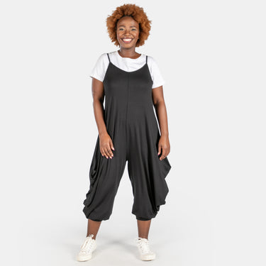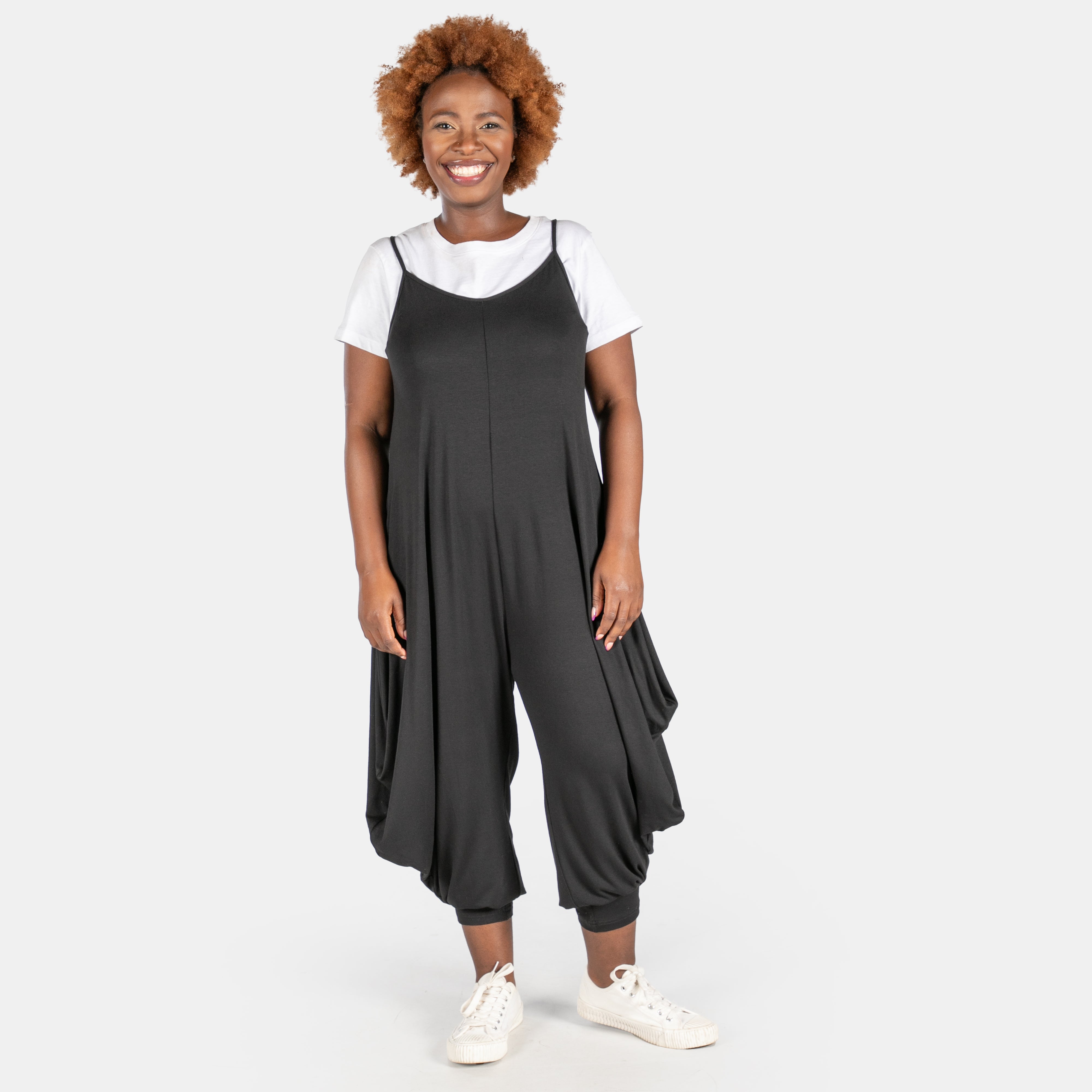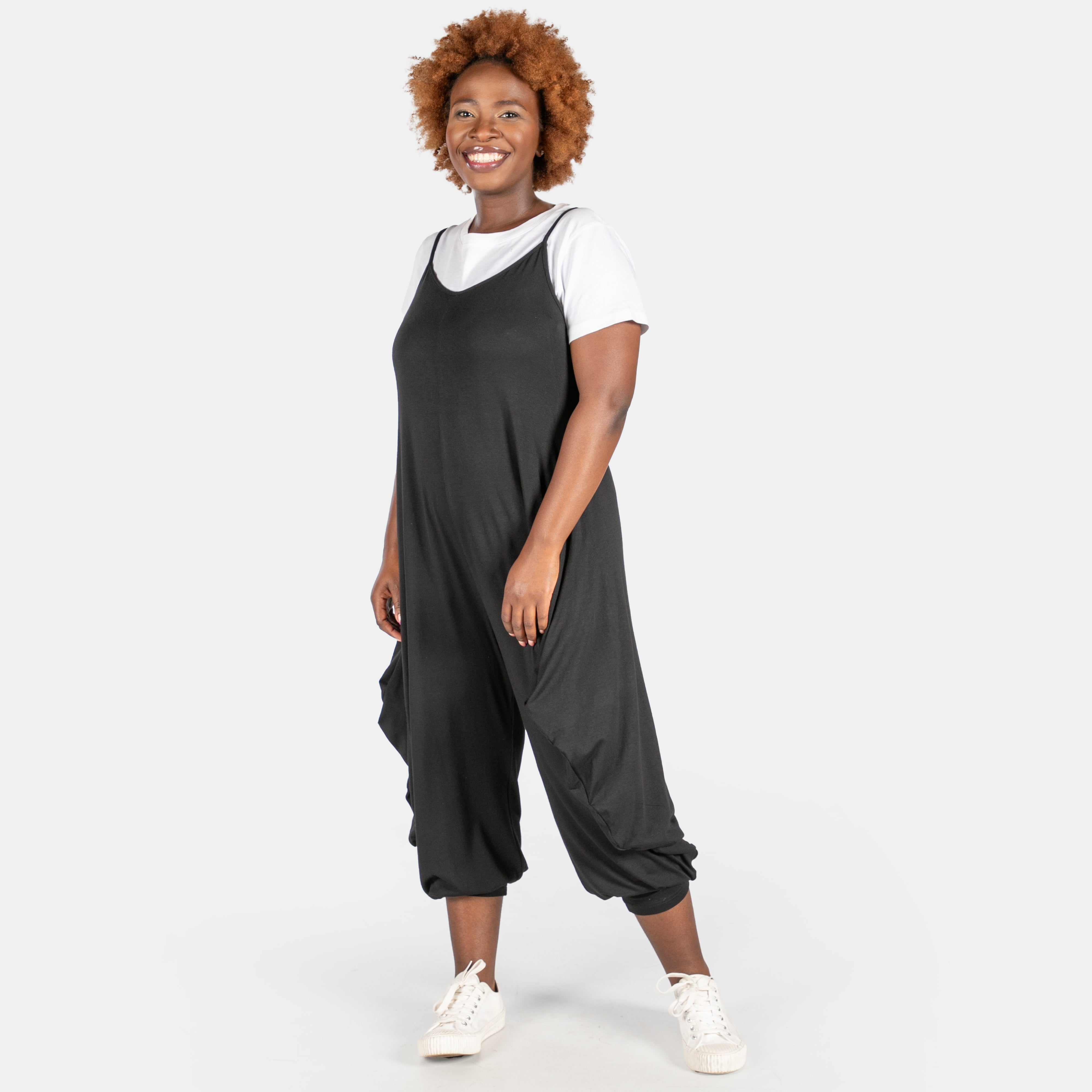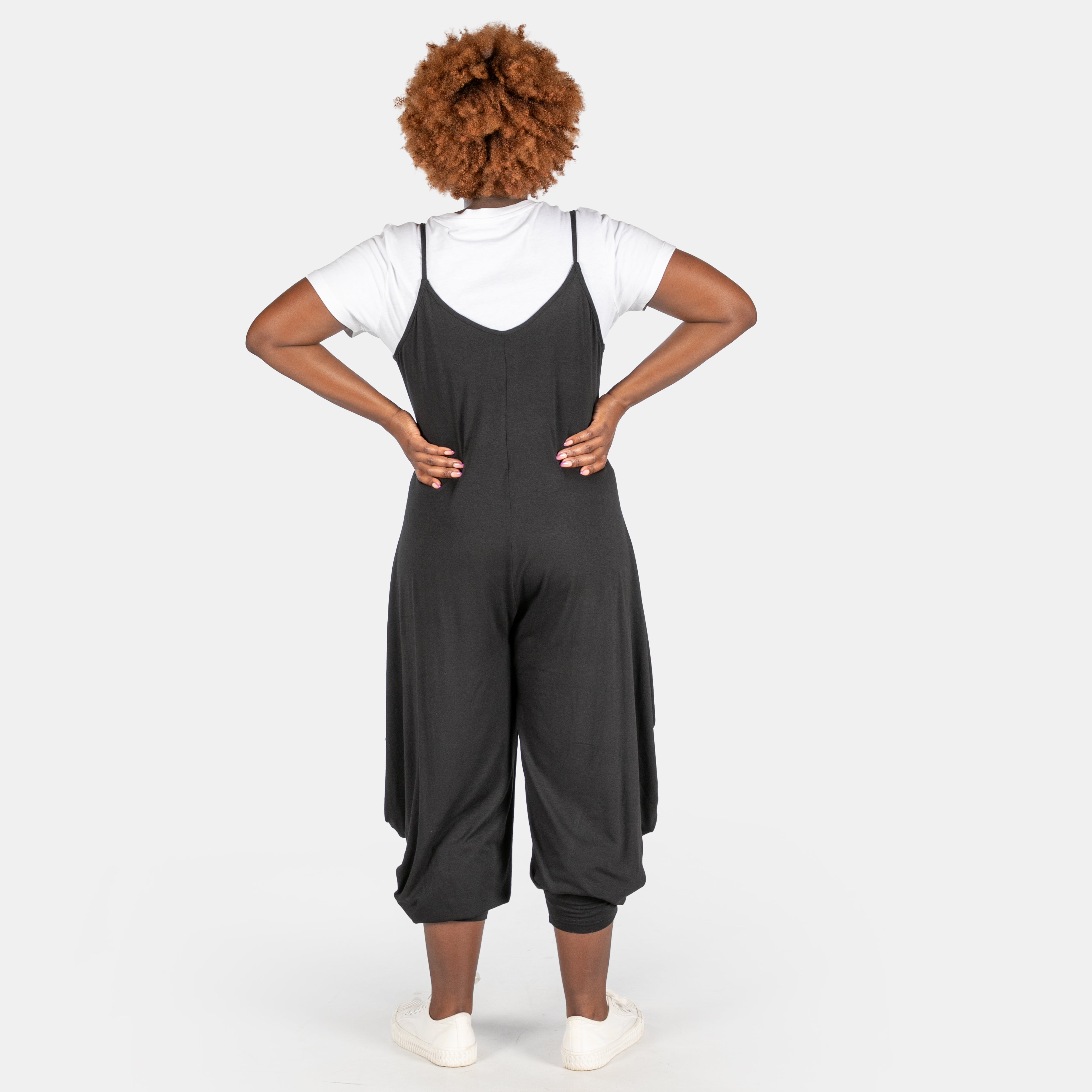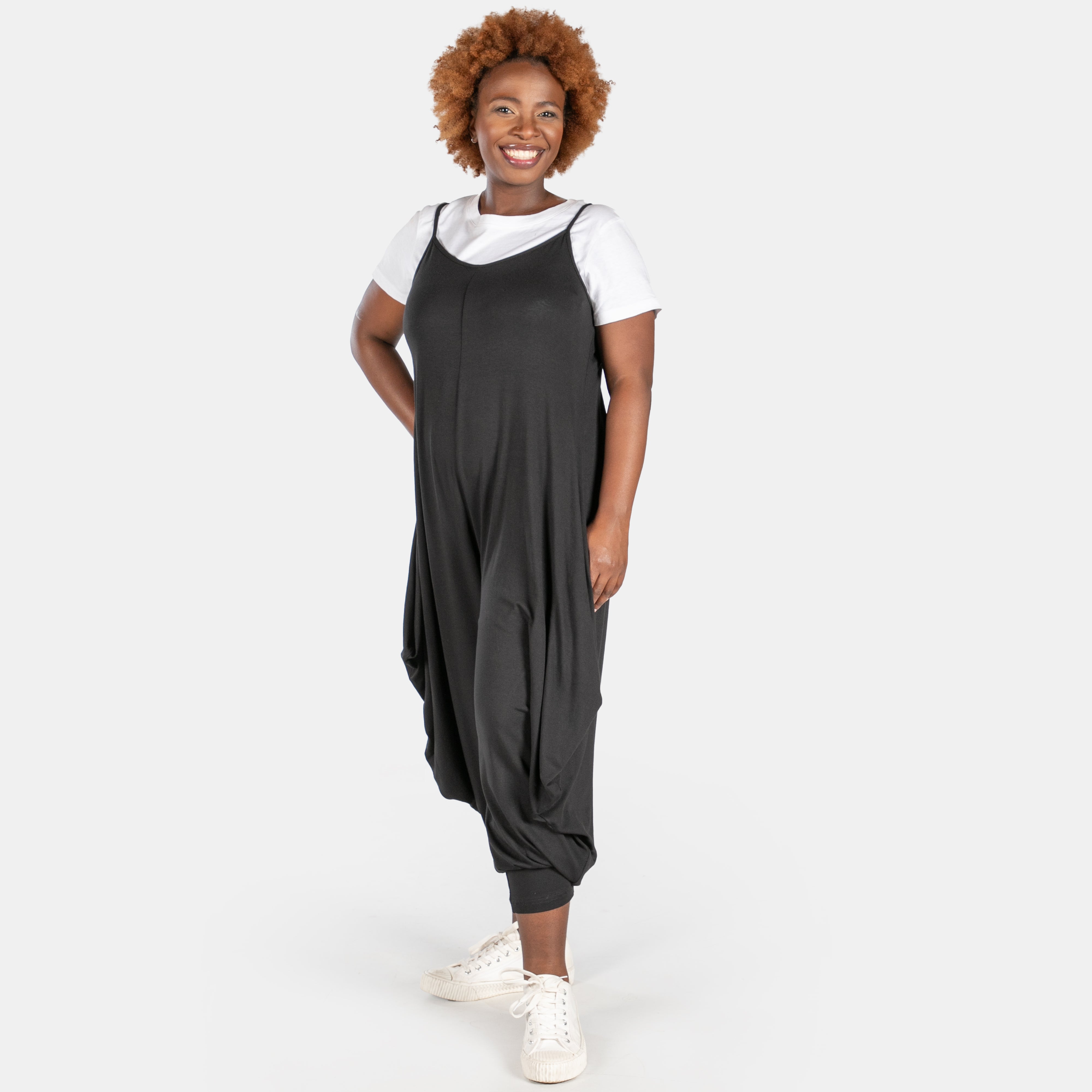 This striking one-piece is crafted from supple stretch cotton knit that moves with you, featuring a pointed V-neckline that draws attention front and back. Thin spaghetti straps and peaks cascade down the sides for a playful edge. Cut to mid calf length with fitted ankle bands, this is the jumpsuit for those who refuse to blend in.
