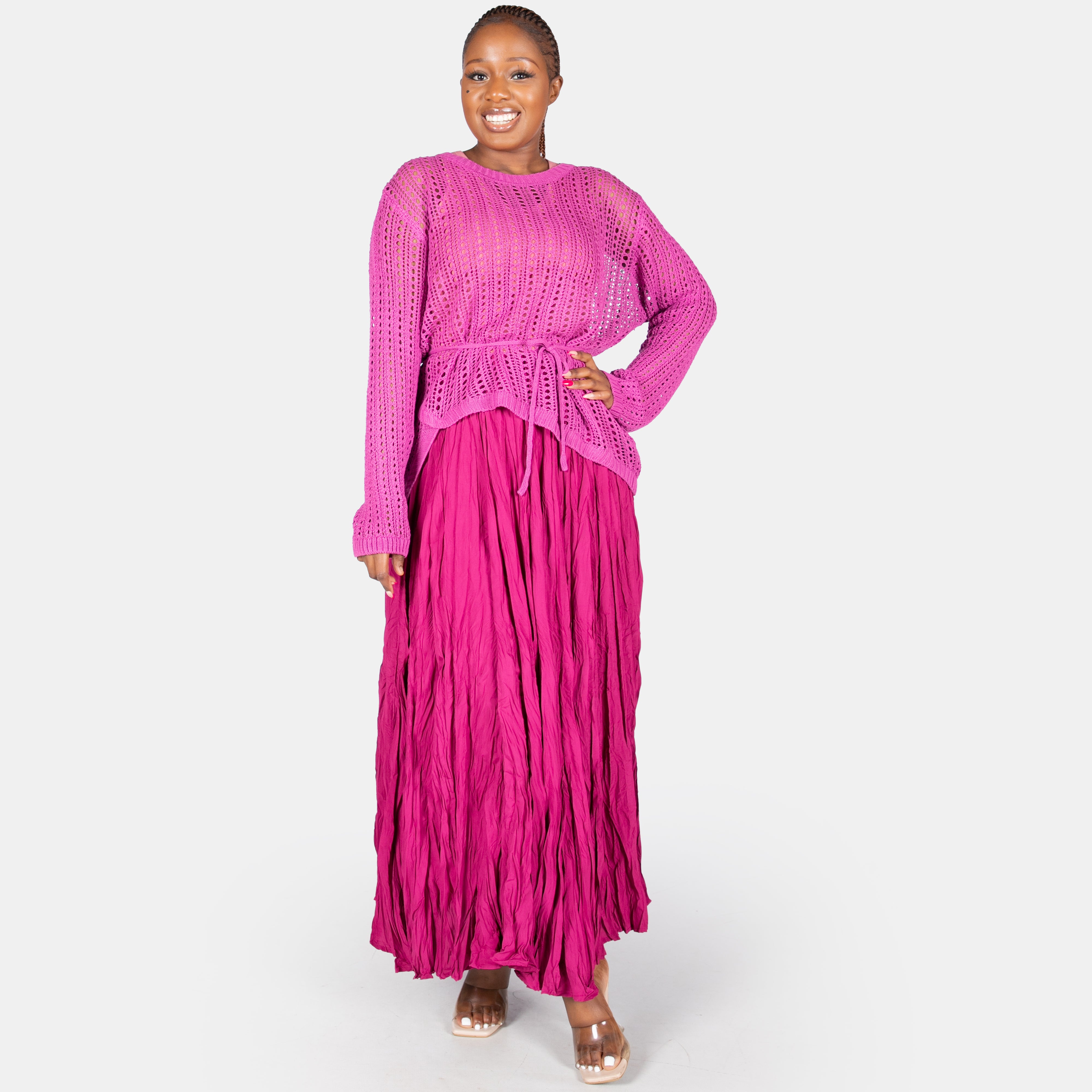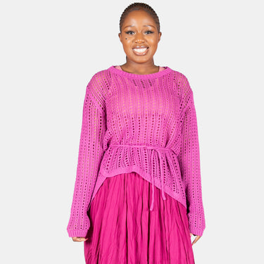 This elegant knitted top boasts a generous fit, long sleeves and a flattering diagonal hemline. The Savannah top features a ribbed neckline, dropped shoulders and ribbed cuffs. There is a thin string belt to cinch in at the waist if you prefer. Lightweight enough to be worn in Summer but also great for layering during the cooler months. One size fits all.