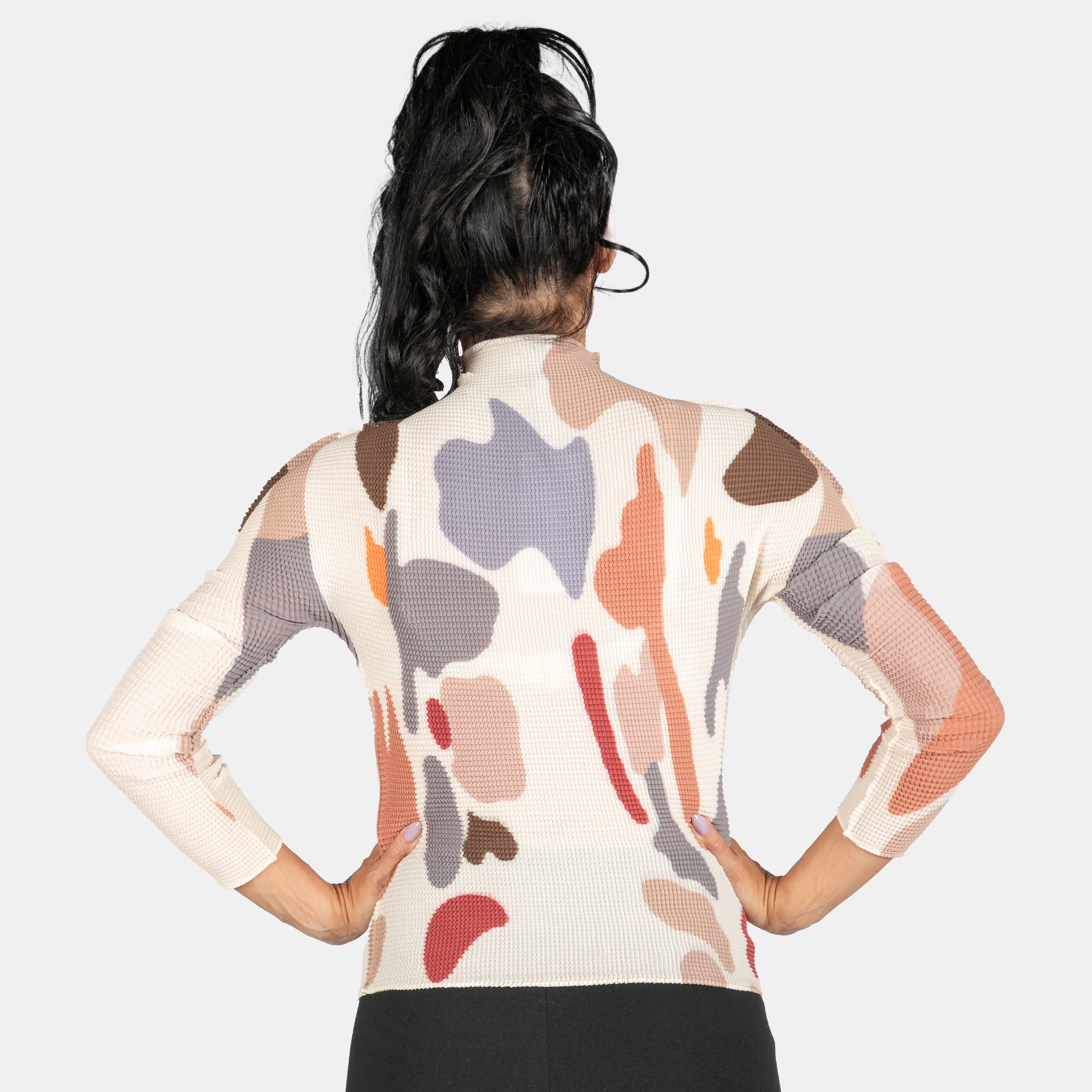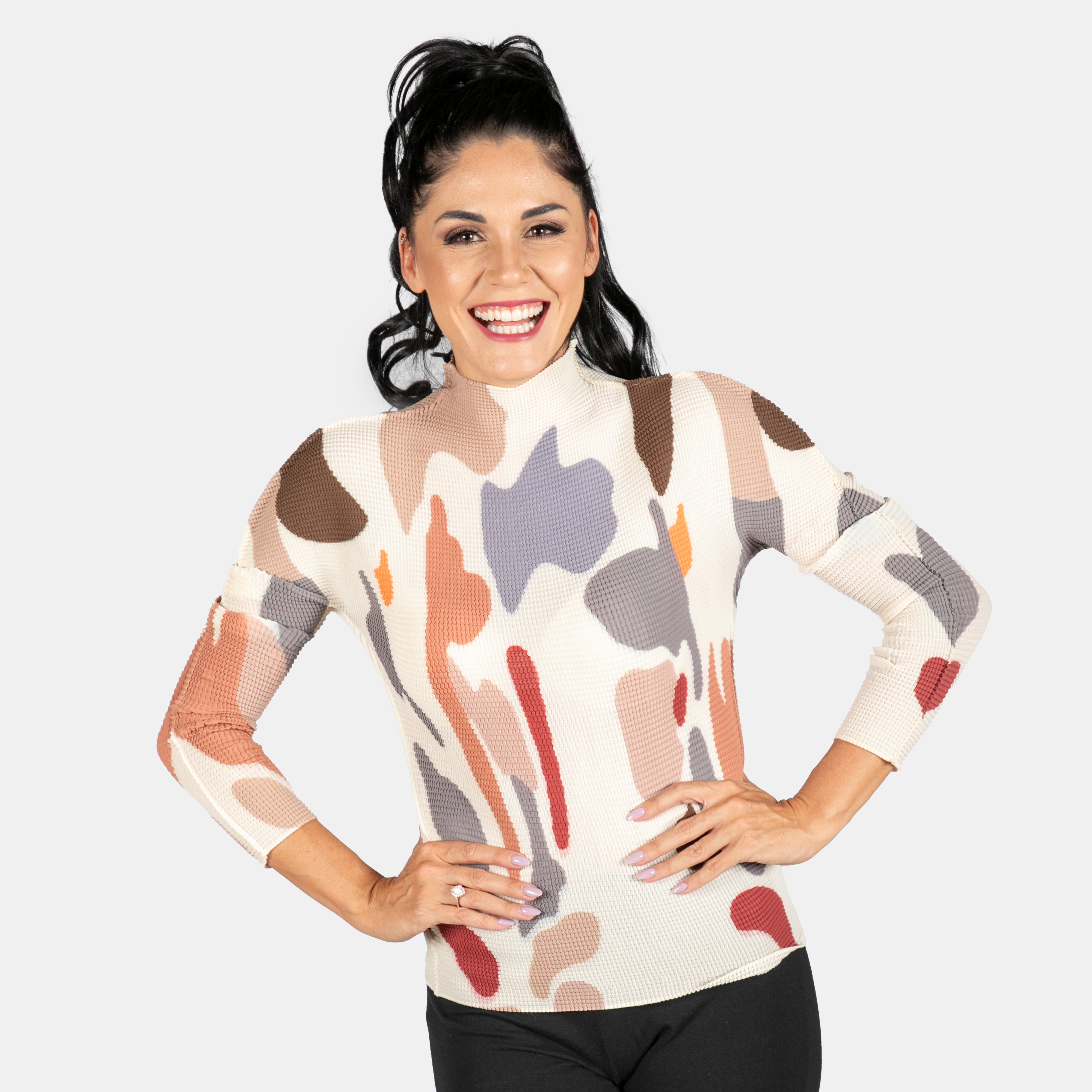 This gorgeous top is crafted from finely pleated stretch fabric. It features a crew neck, long sleeves and the unforgettable colour print extending to the back. Available in 3 rich colours, this top is perfect with any of your Big Blue bottoms. One size fits most body shapes.