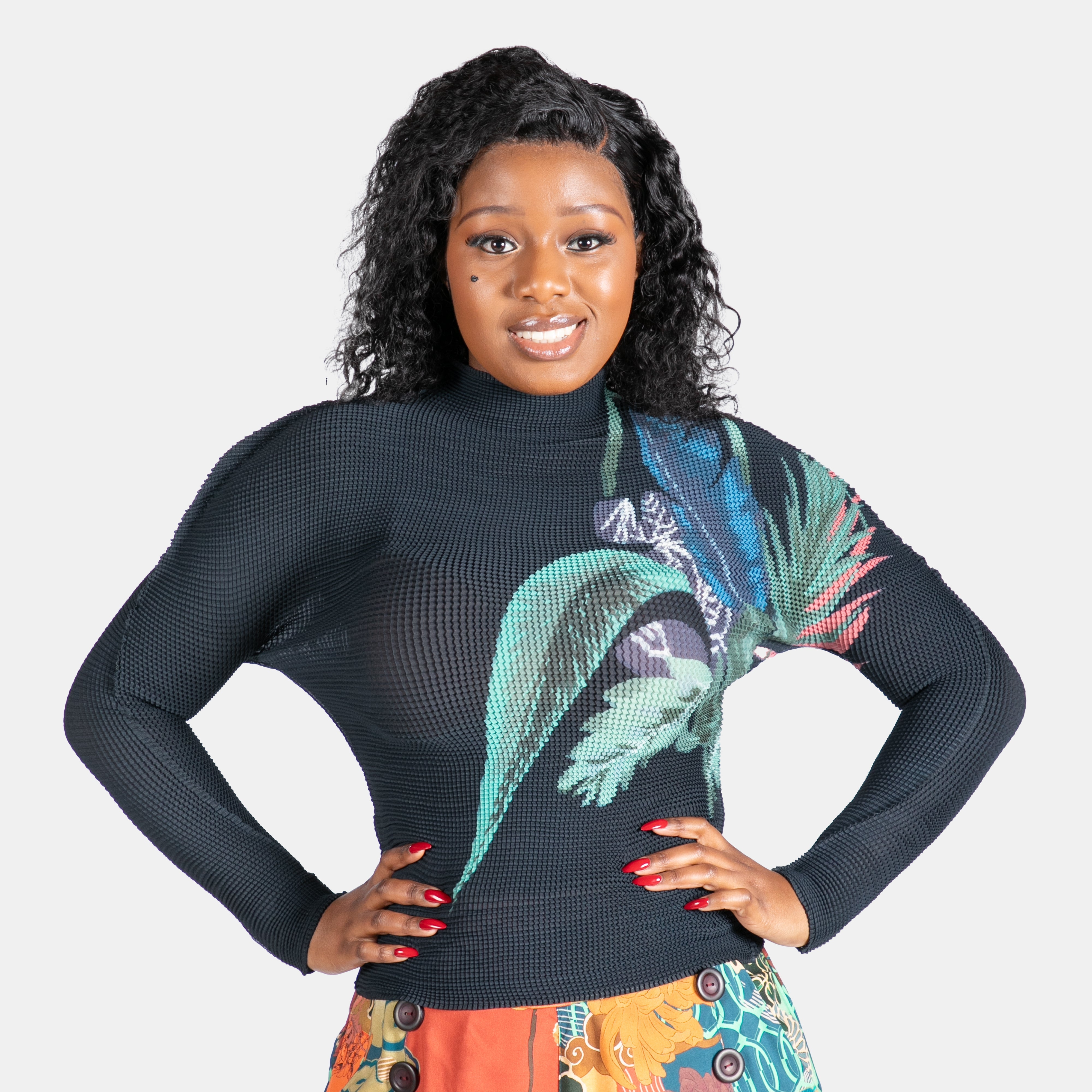 This gorgeous top is crafted from finely pleated stretch fabric. It features a crew neck, long sleeves and the unforgettable colour print extending to the back. Available in 3 rich colours, this top is perfect with any of your Big Blue bottoms. One size fits most body shapes.