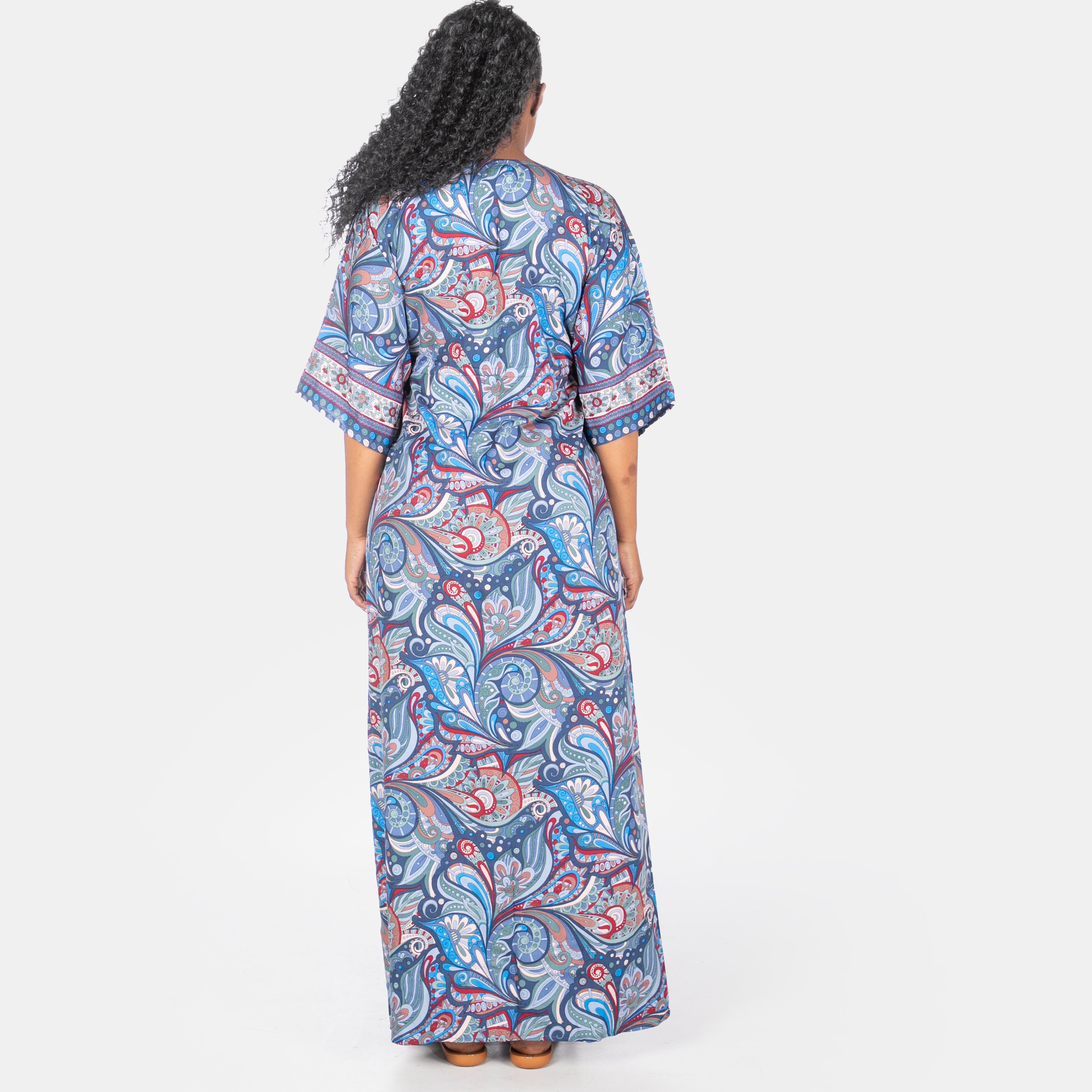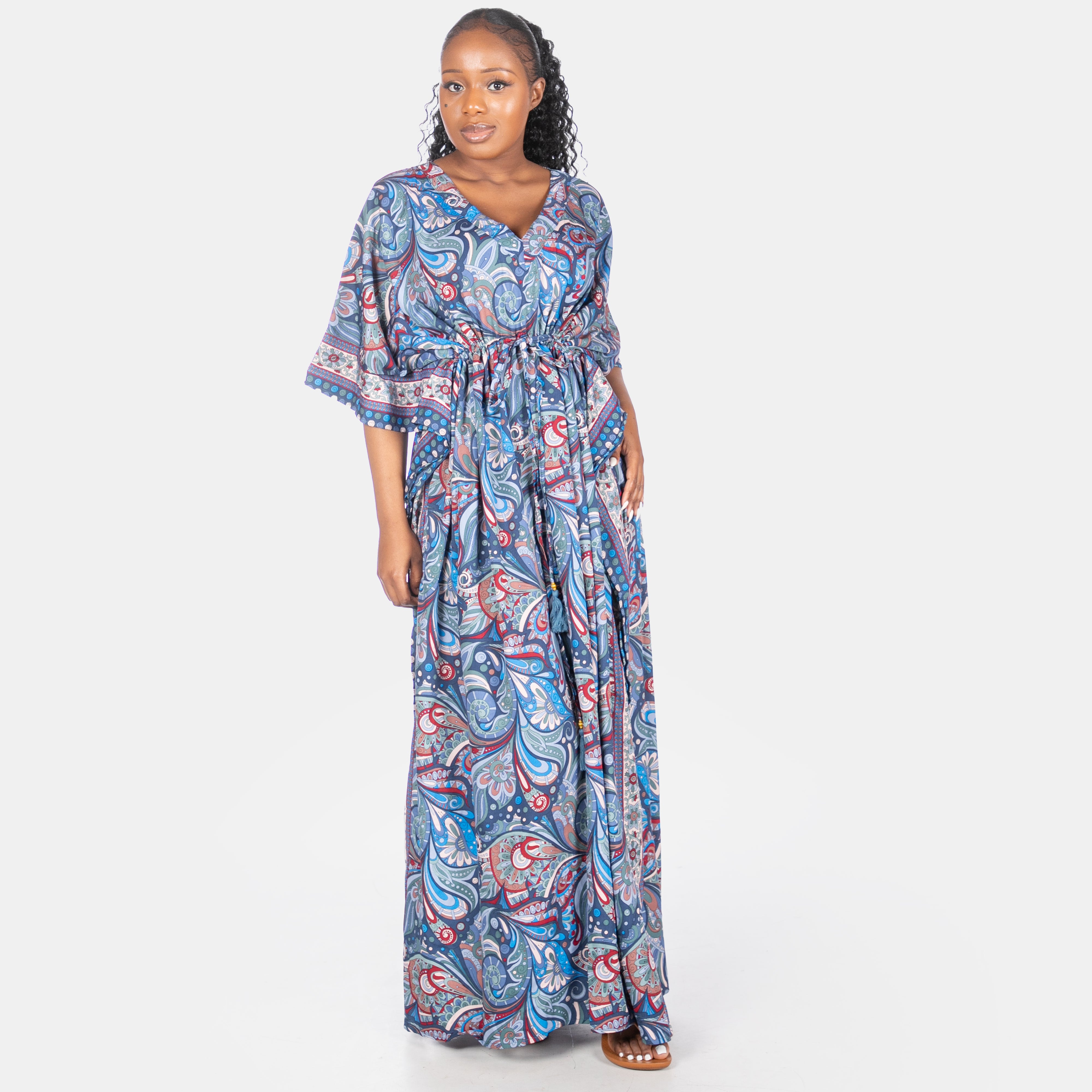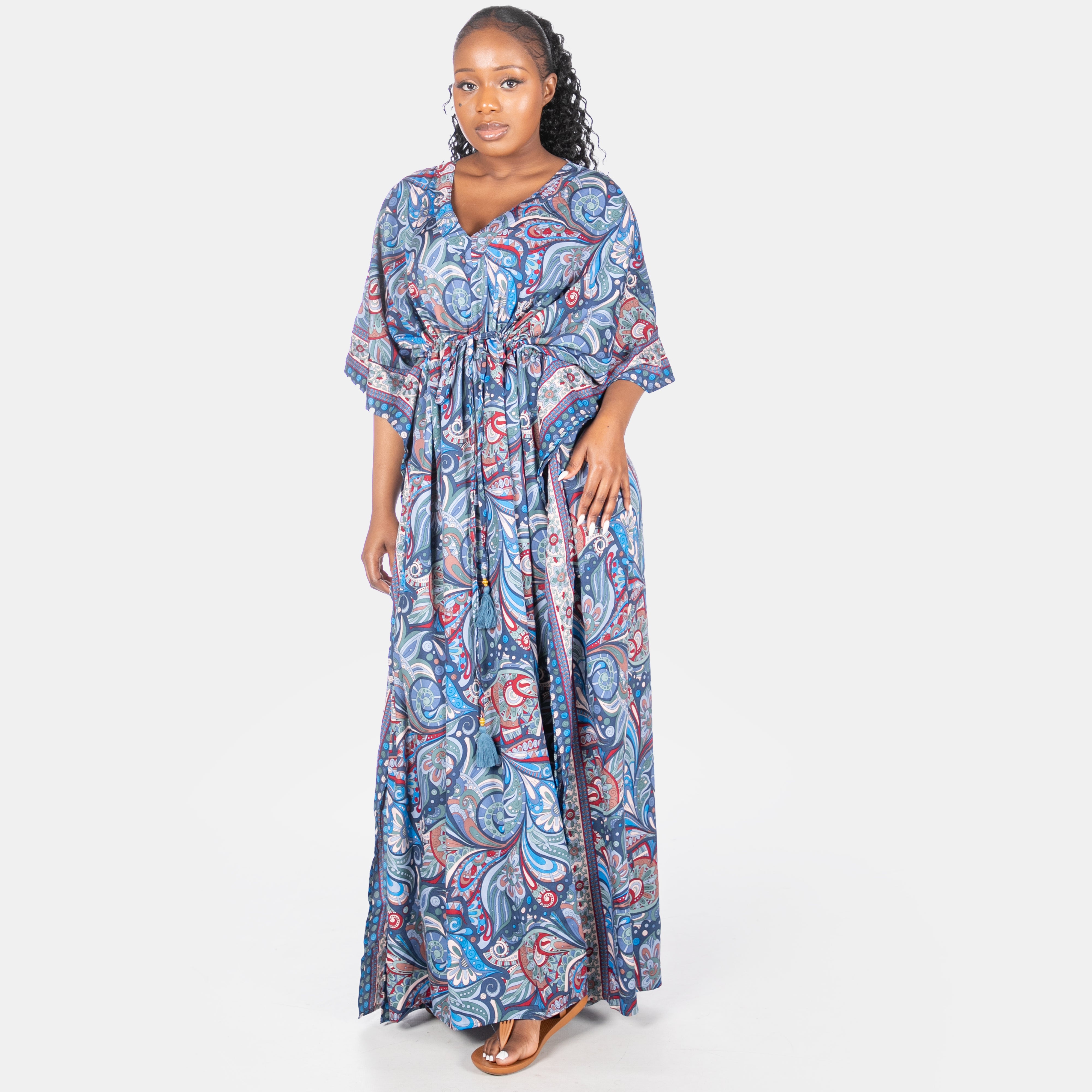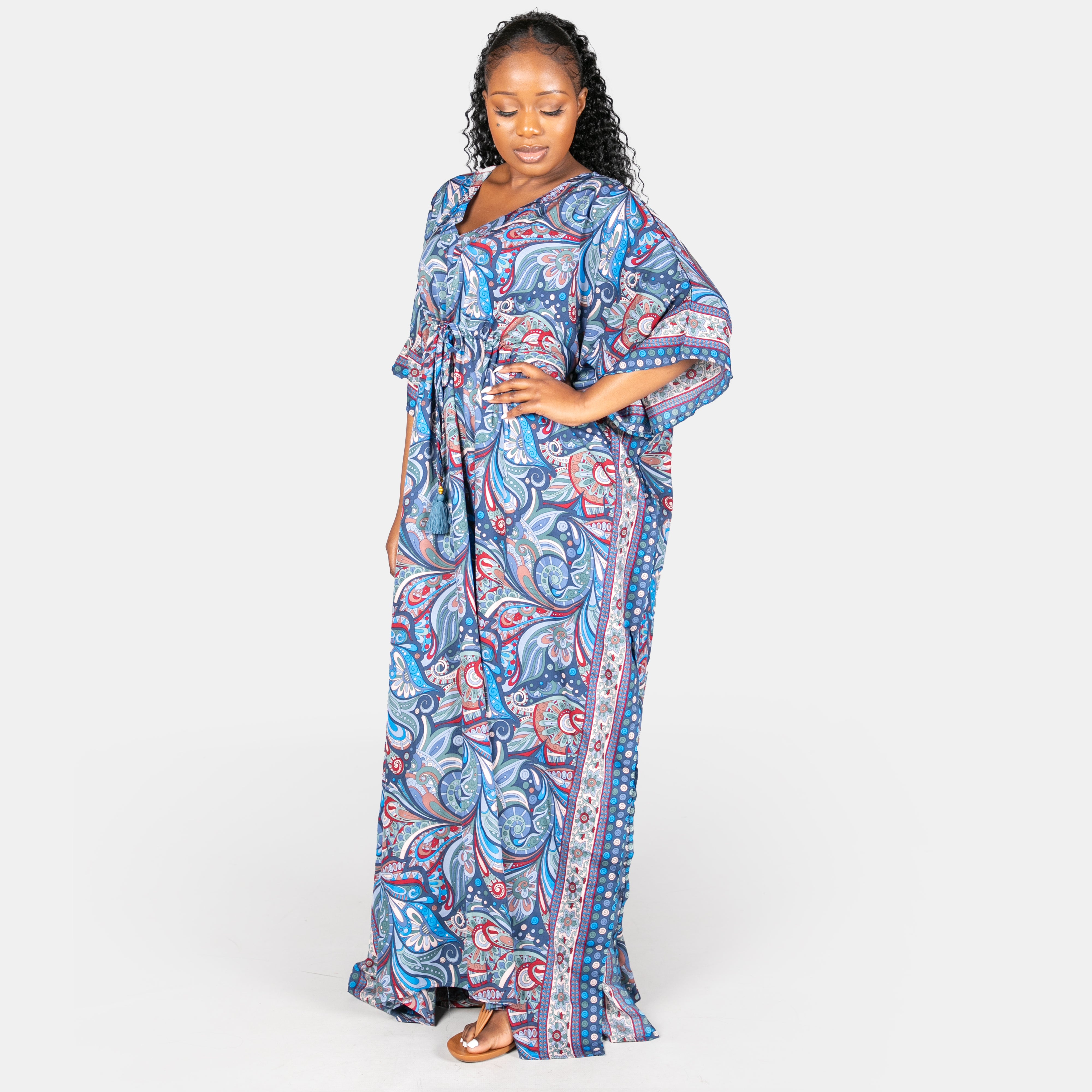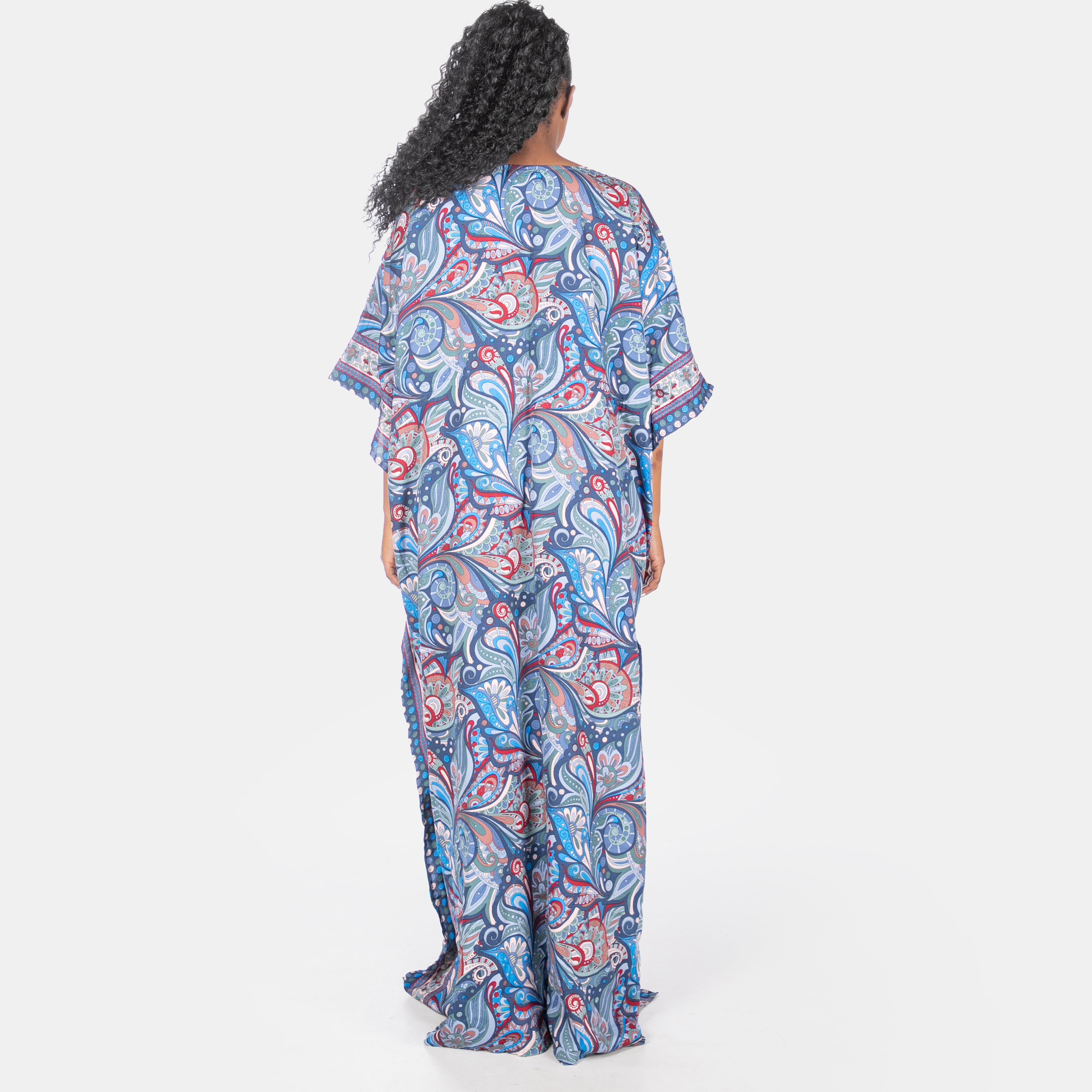 Extending to the floor, this kaftan is great for cover up from the sun or relaxing evening cocktails.