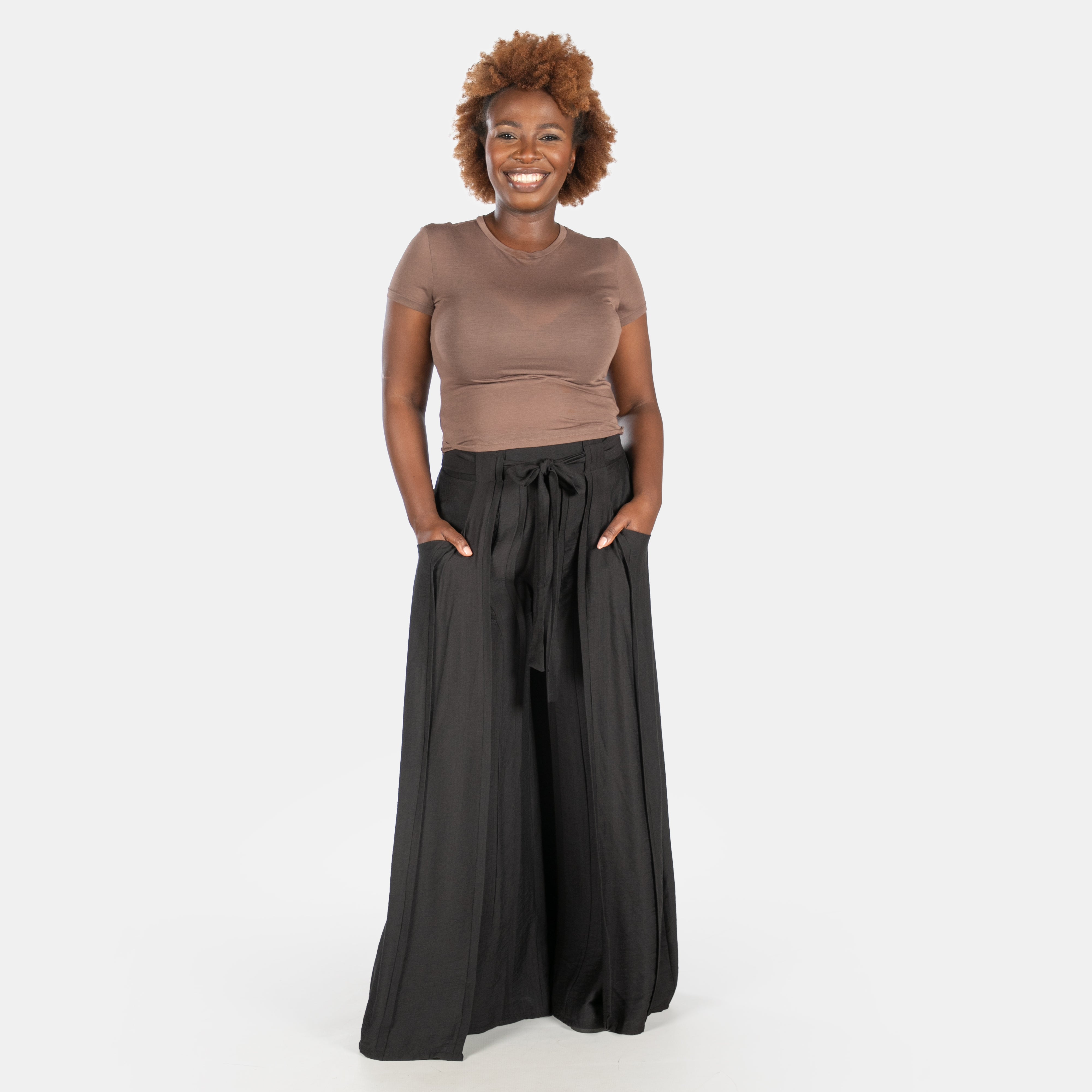 The widening legs have pin tuck pleats on the vertical and panels around the outer sides that create movement as you walk.