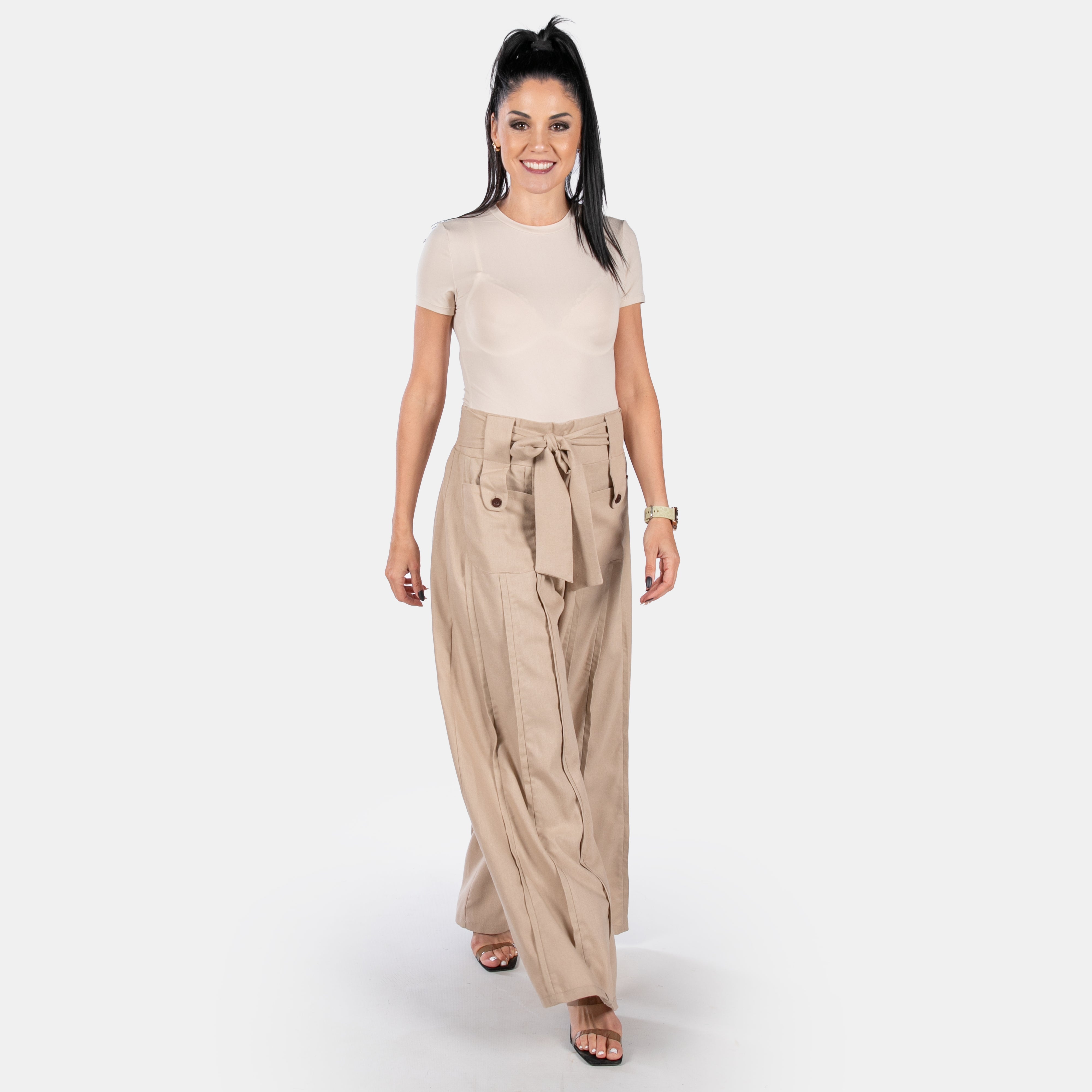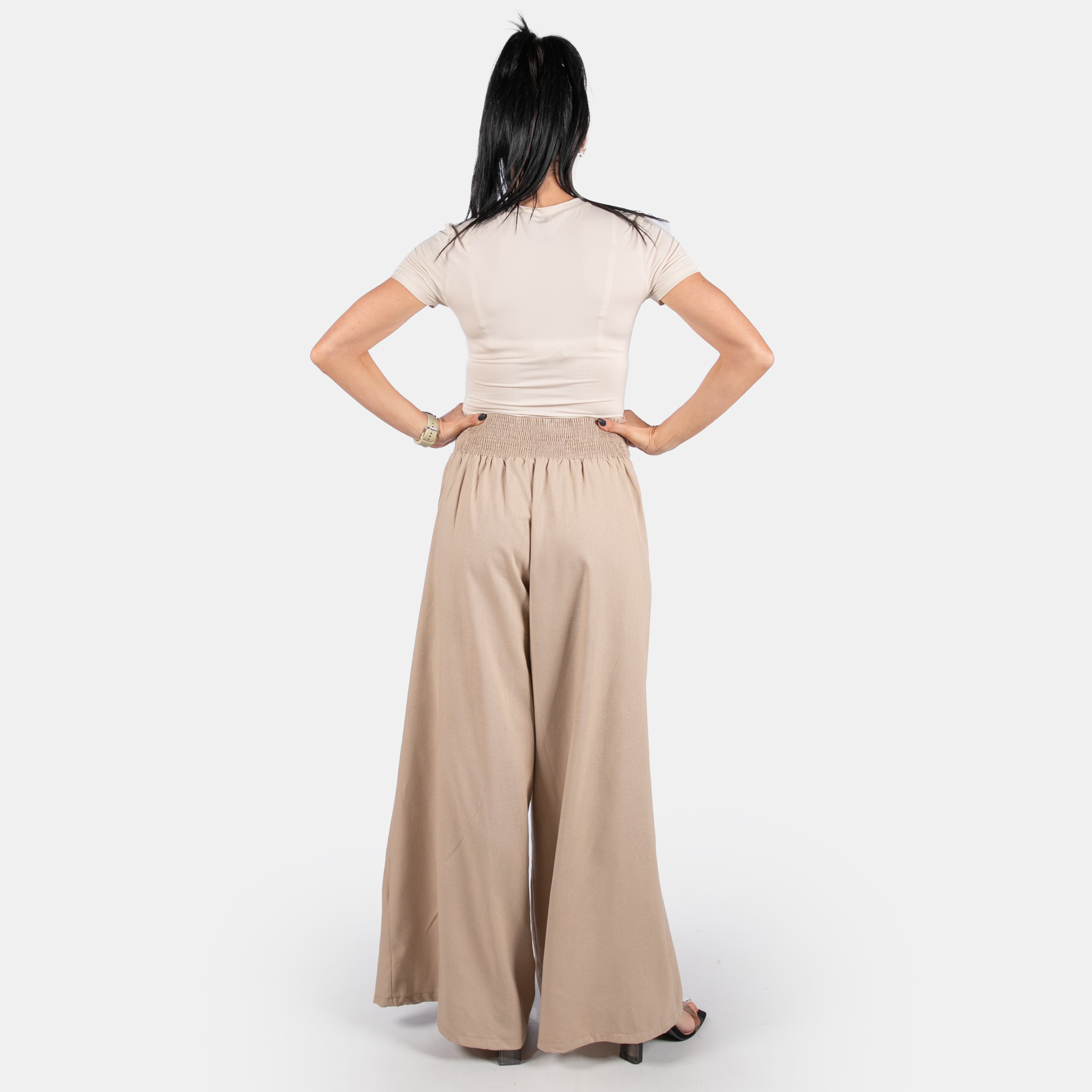 The Luna pants feature an exaggerated waistband with an elasticated back and flat front.