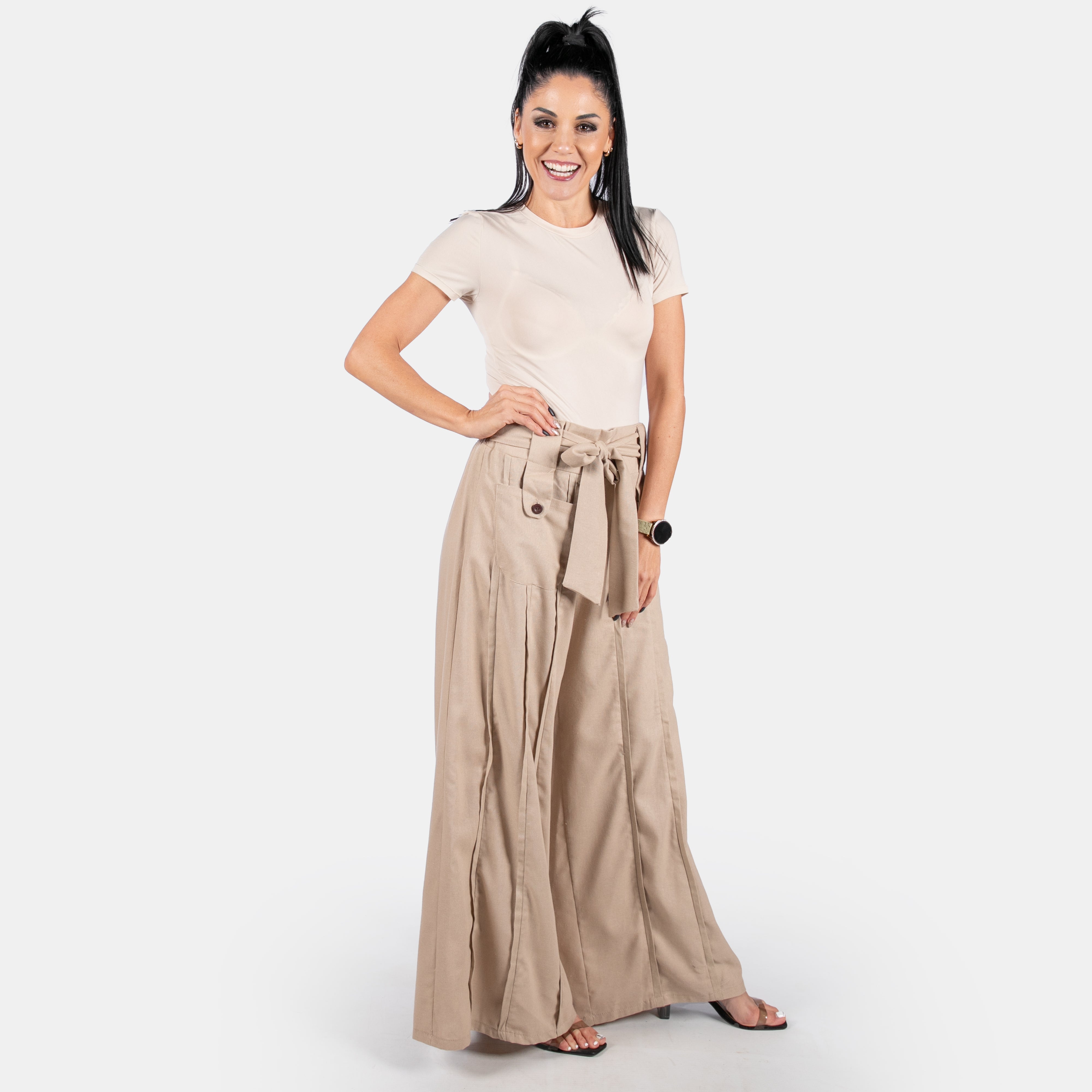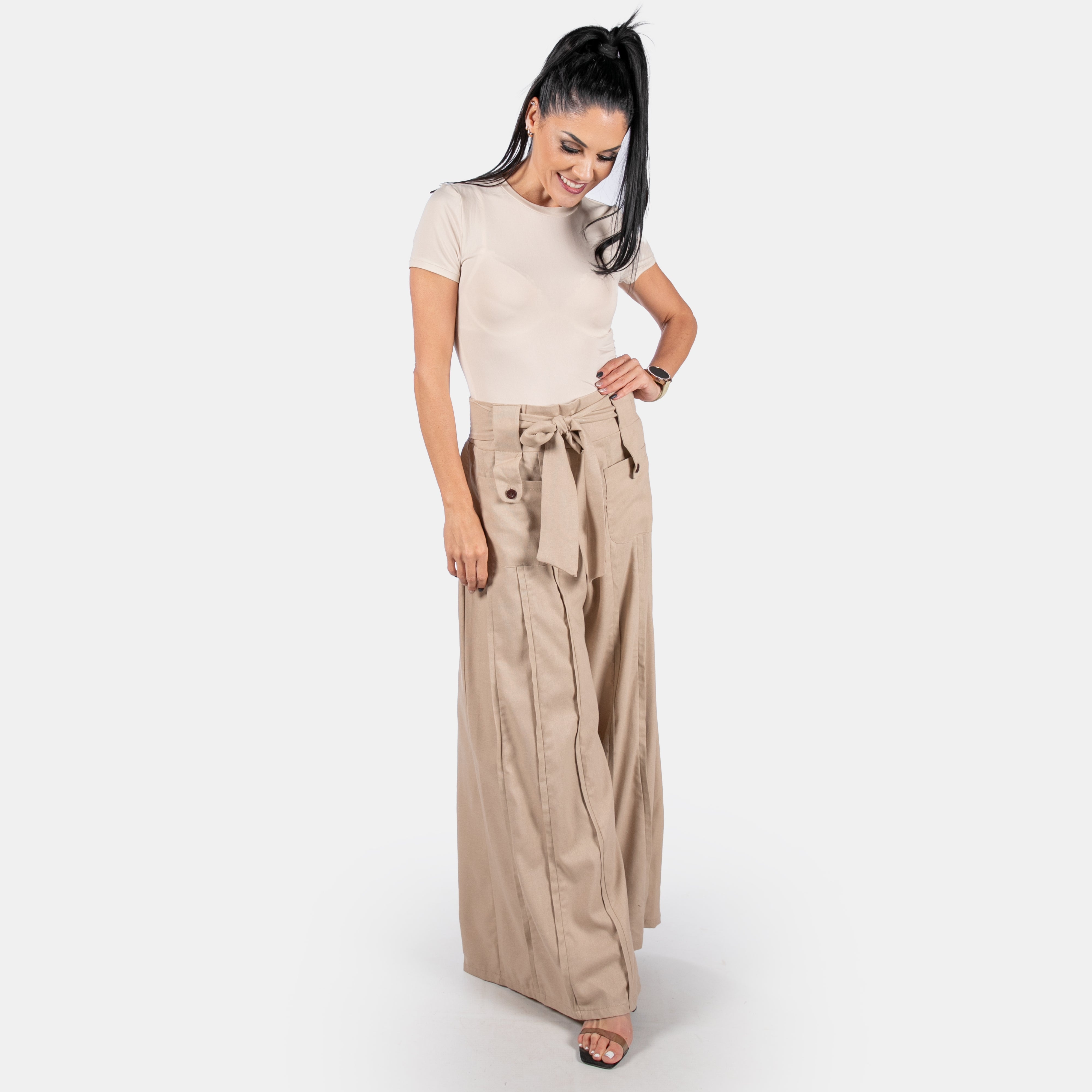 The wide legs have vertical seams as a feature along with large patch pockets and button detail.