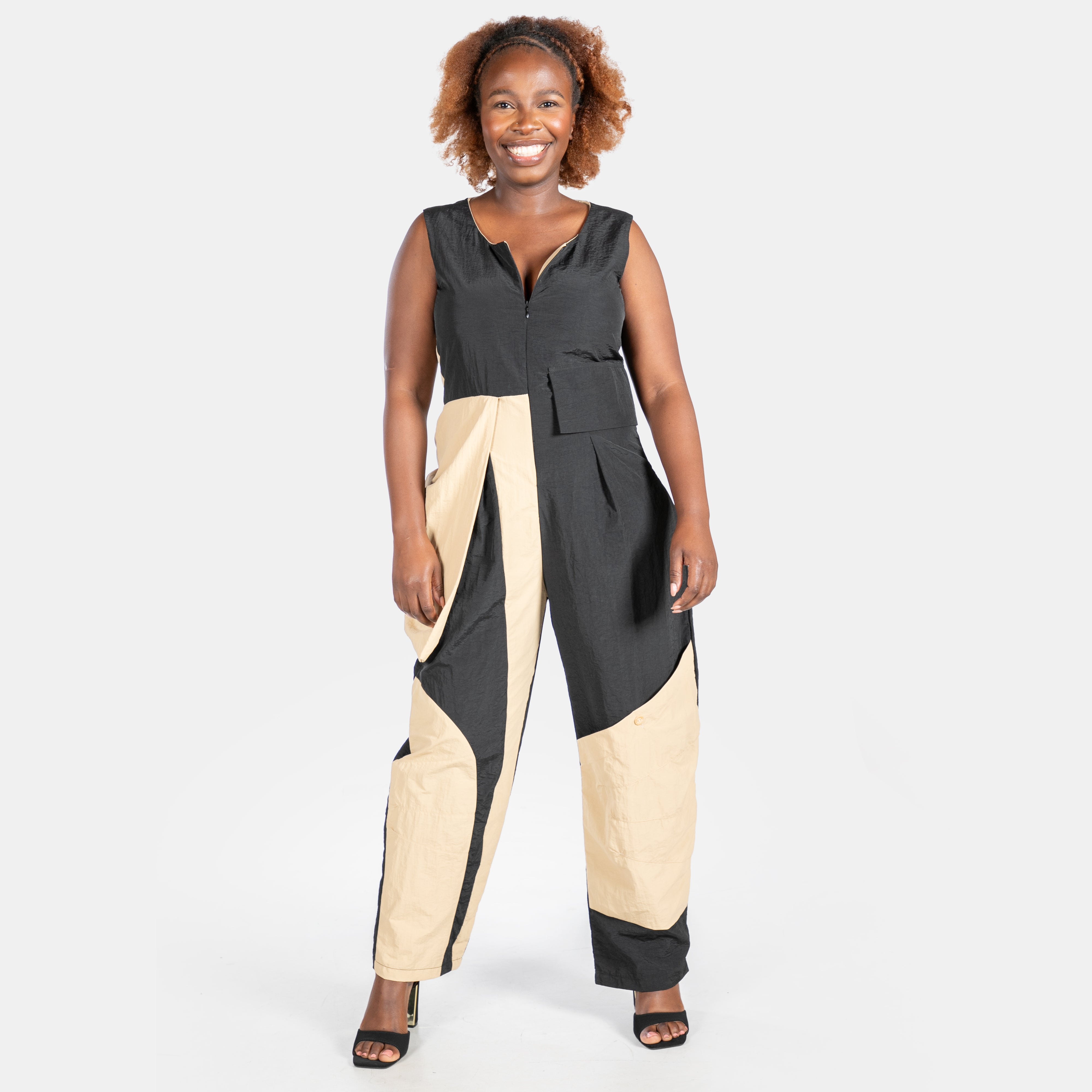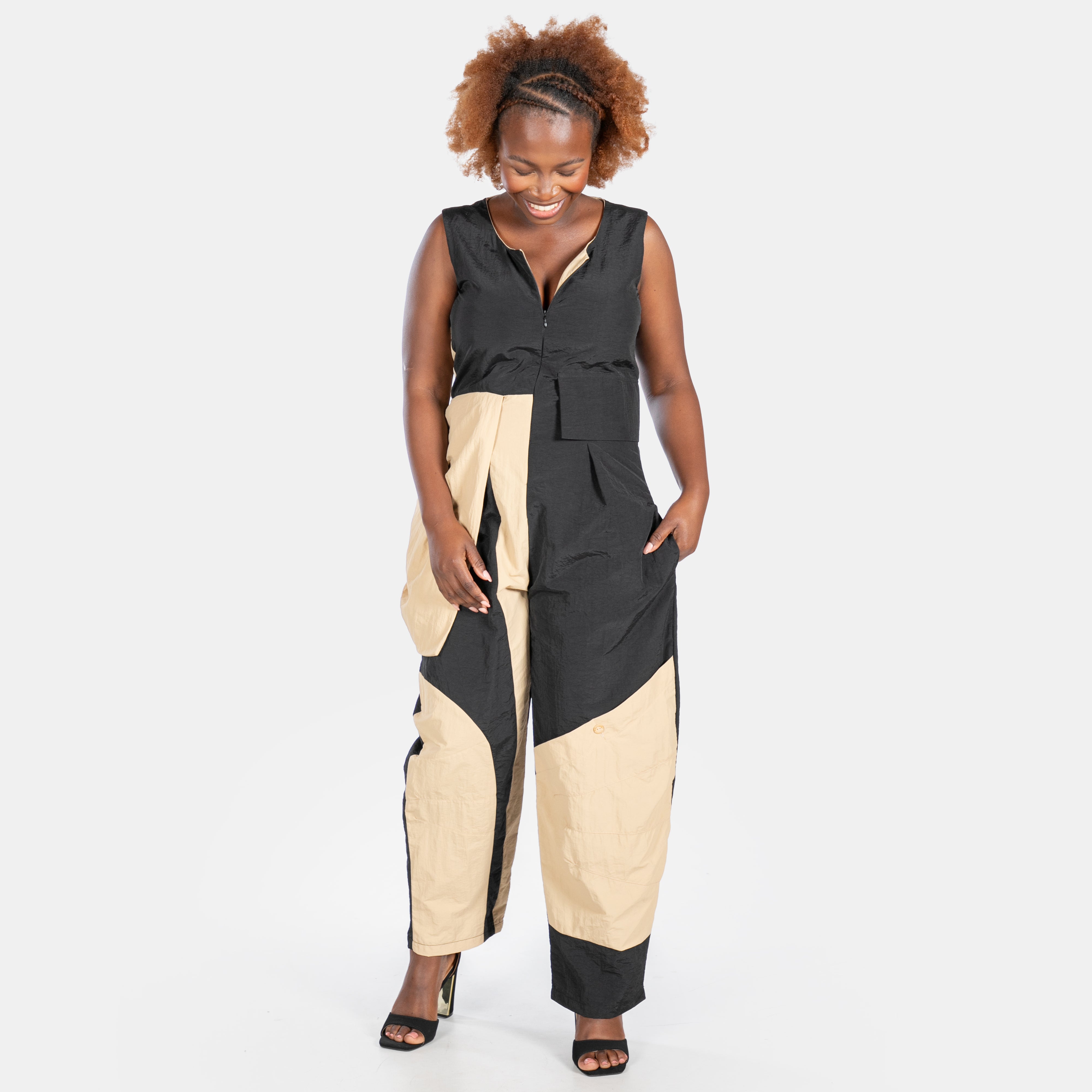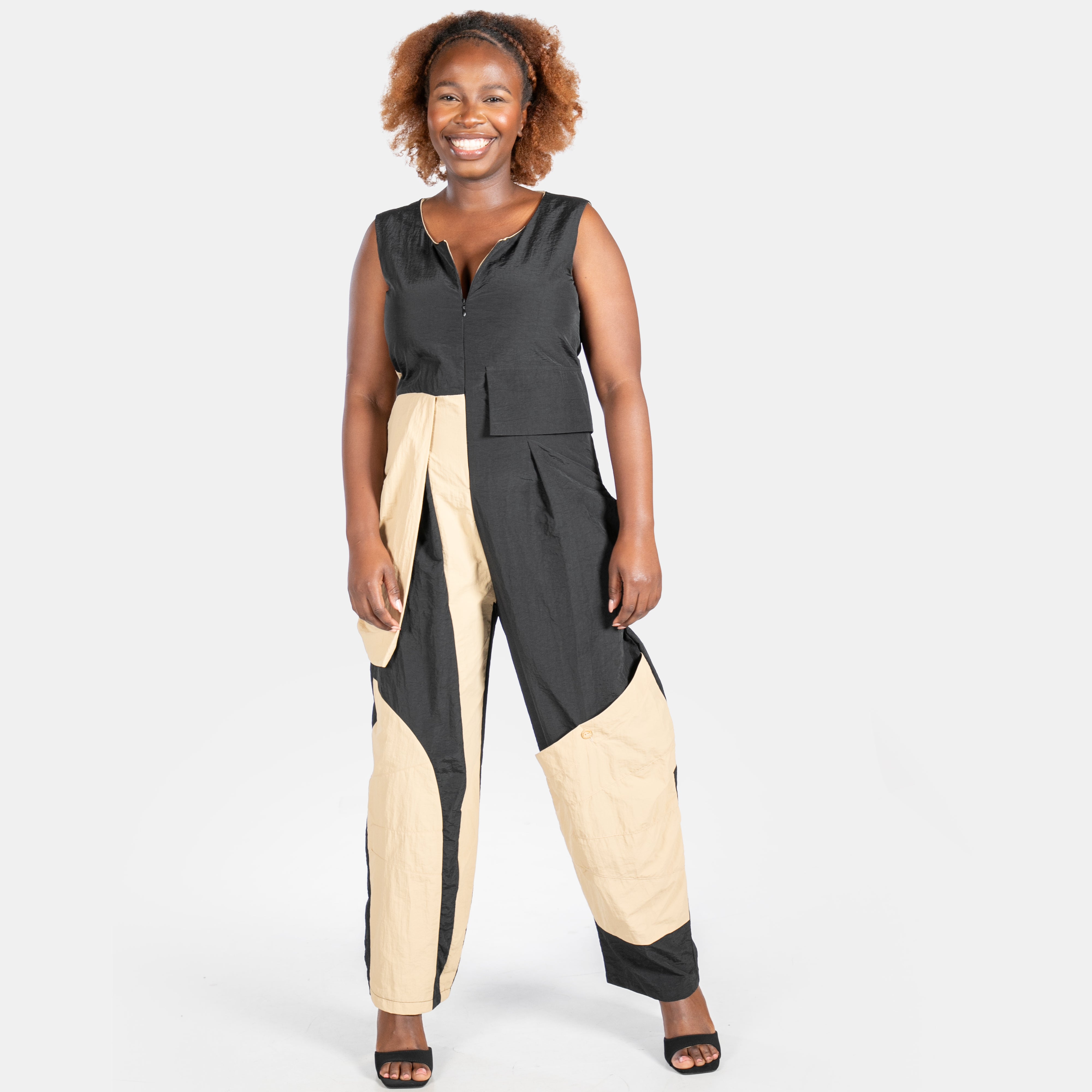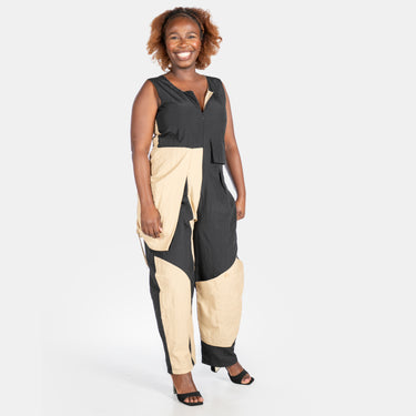 The lightweight, quick-drying fabric of the Taslon Jumpsuit pairs beautifully with bold camel and black colour blocks, while diagonal seams and statement flappy pockets deliver some Avant-Garde fun.