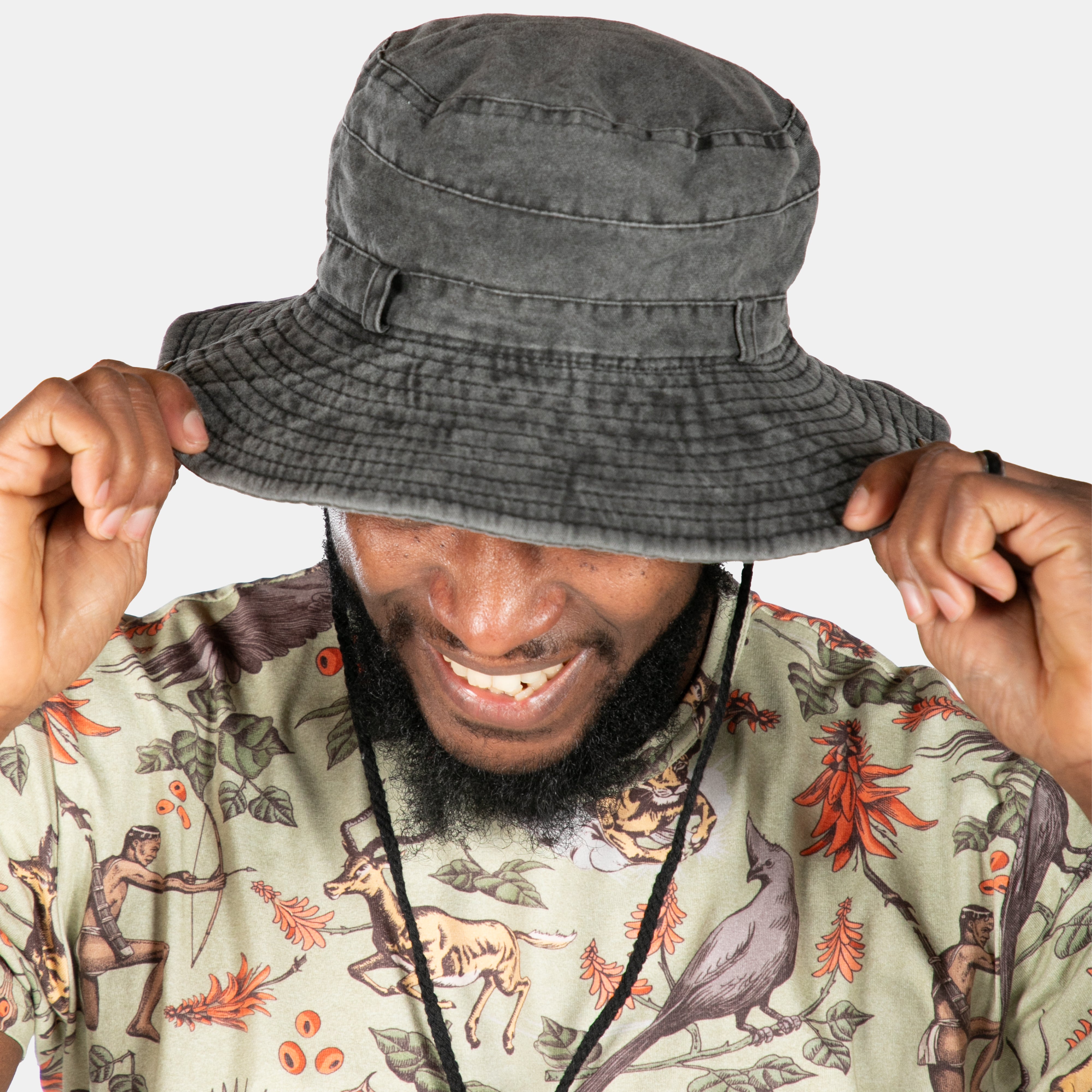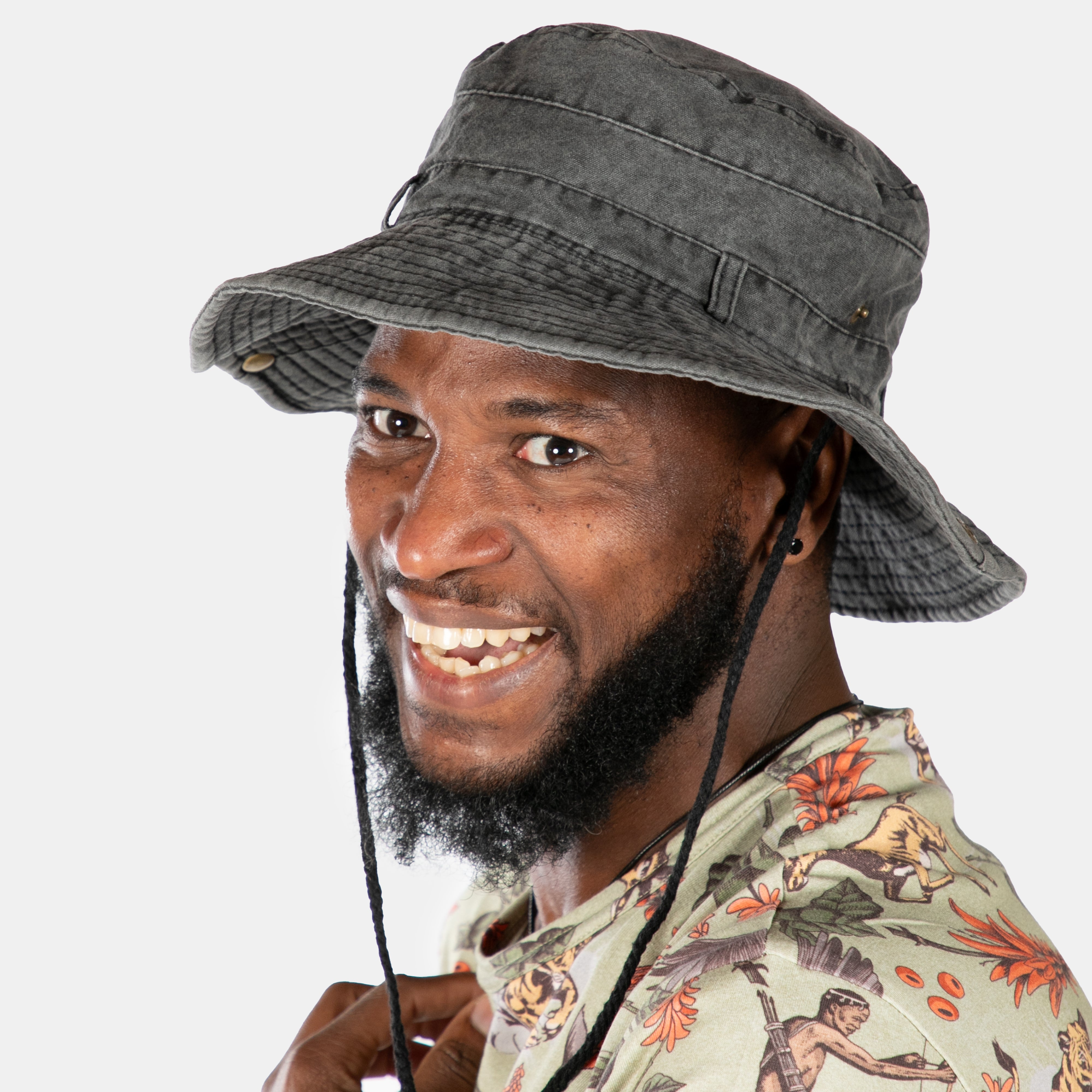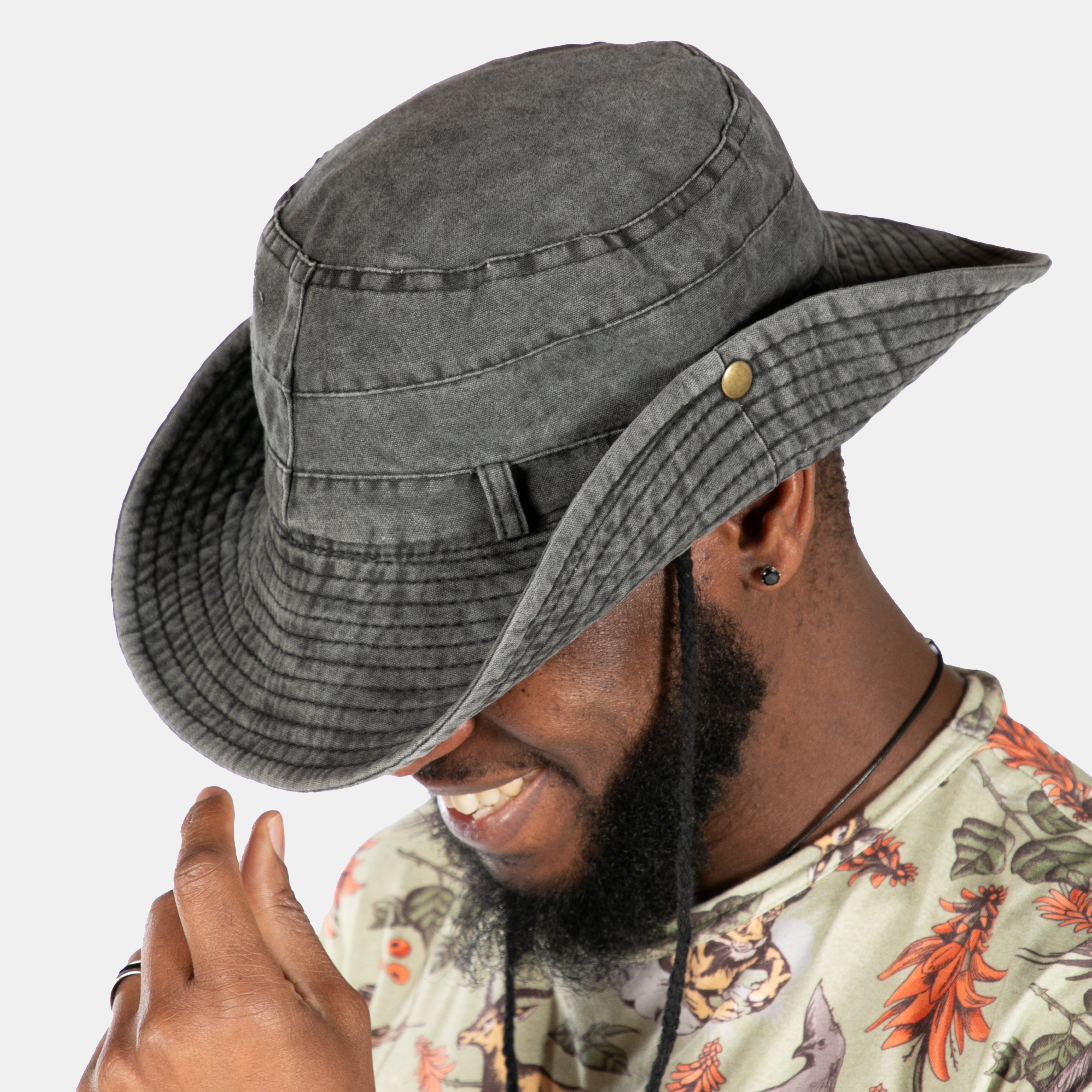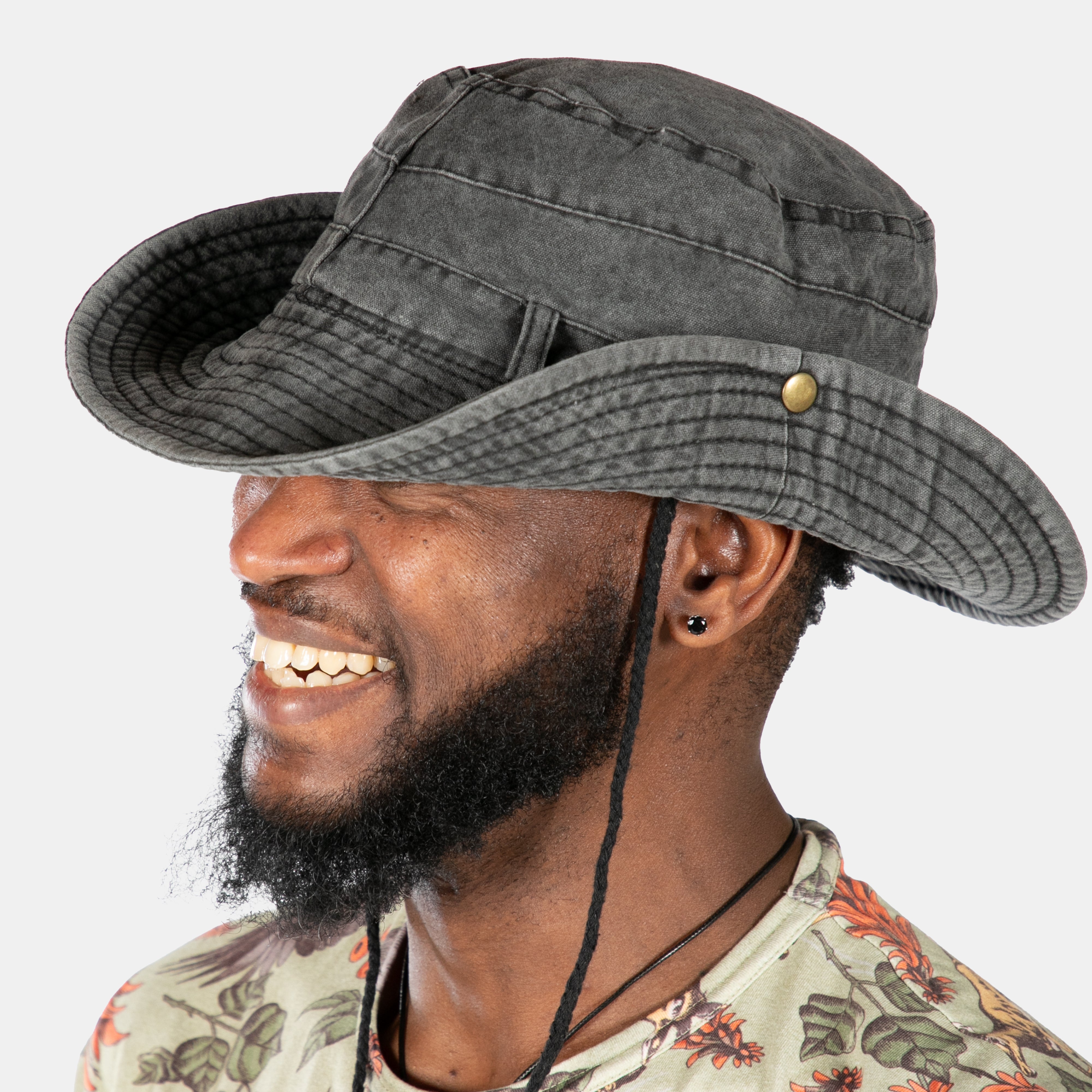 Crafted in breathable denim, the Ananias hat also features an adjustable chin strap and belt loops at the base of the crown so that you can personalise and accessorise your hat with a scarf or belt.