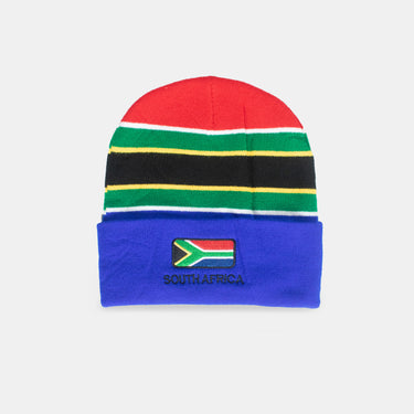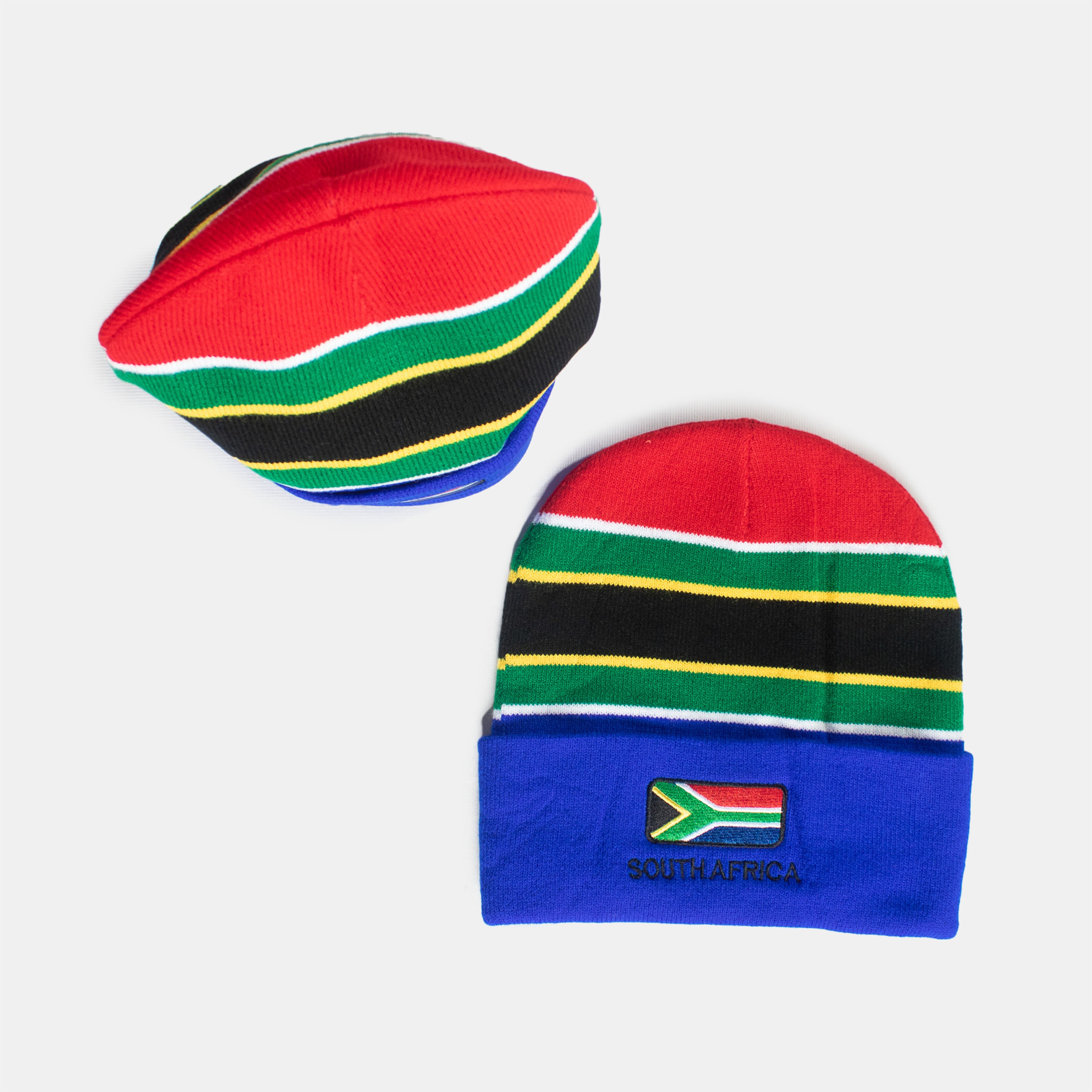 Show your South African pride with this vibrant flag beanie. Featuring the iconic colours of the flag, it combines warmth and patriotic spirit. The embroidered flag detail and "South Africa" text on the turn-up drive the point home. Perfect for sports fans, visitors, or anyone celebrating their heritage.