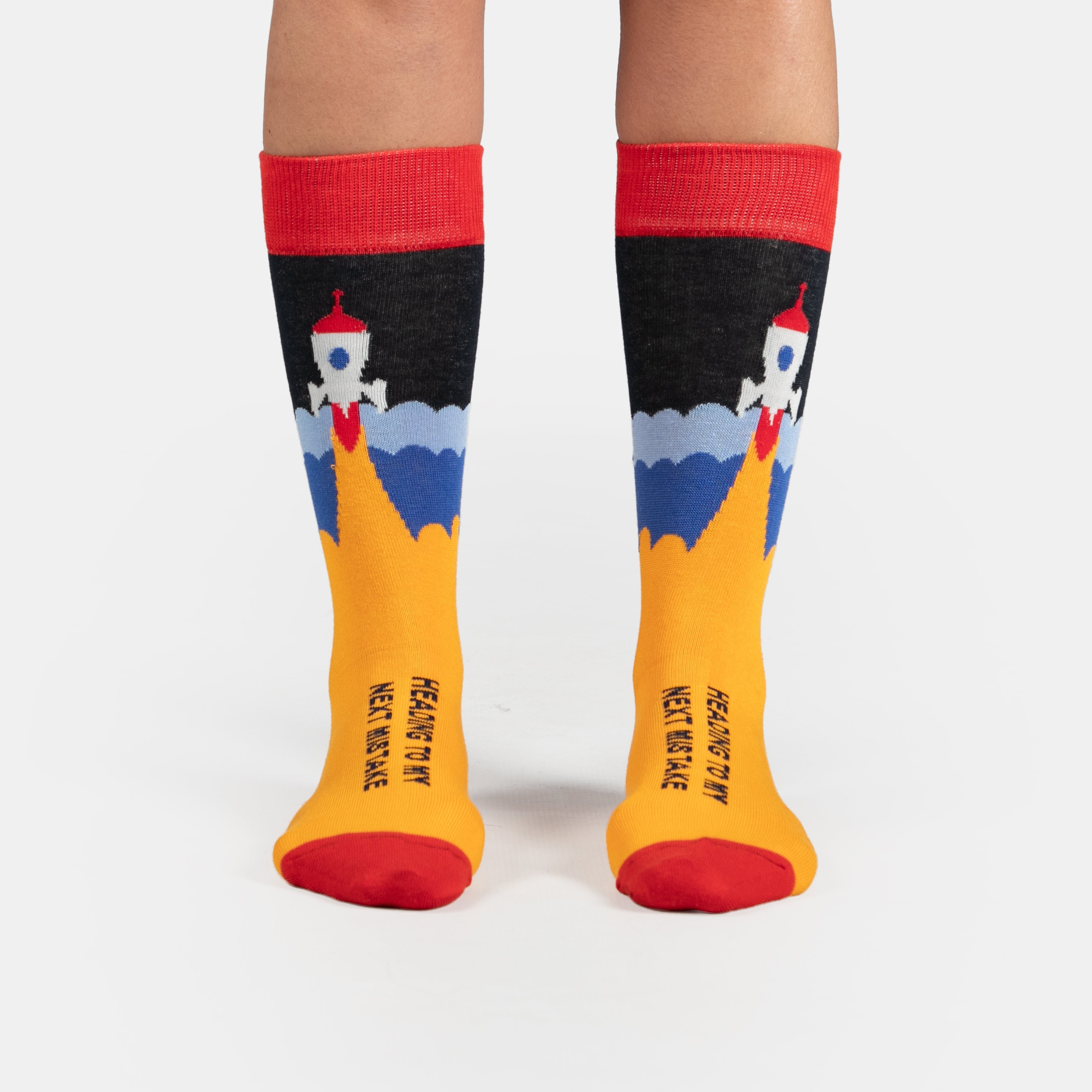 These full colour socks are spun in 90% Cotton to ensure they stay soft and 10% Spandex to keep them in place. They feature a deep rib, graphics and text "Heading for my next mistake"  A great tongue in cheek gift for an entrepreneur, groom or work colleague.