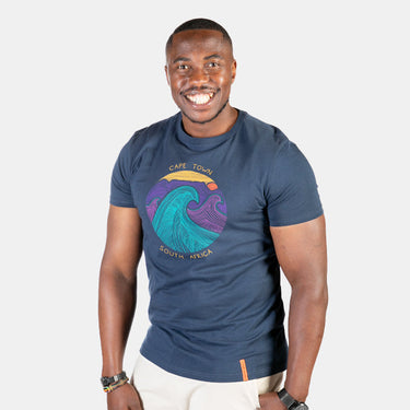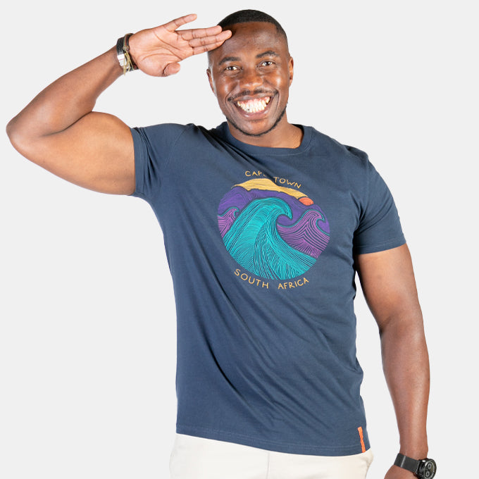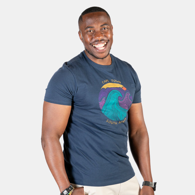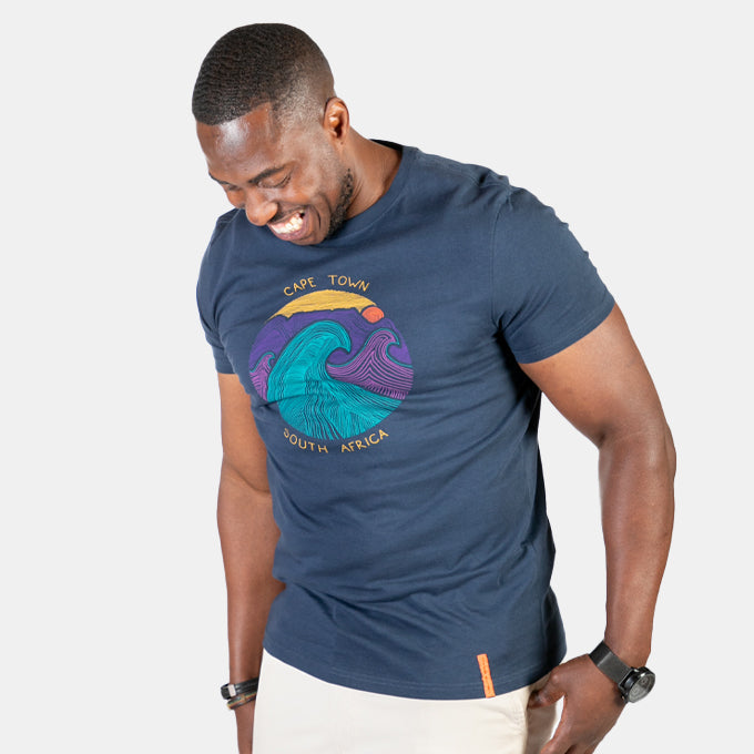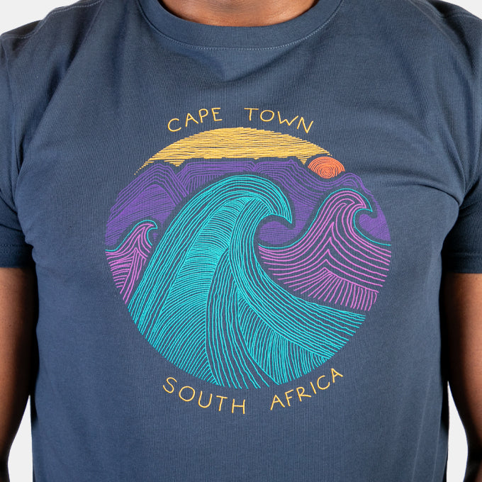 This cool t-shirt boasts a colourful woodcut print depicting the mountain, sun and waves of Cape Town, our mother city.