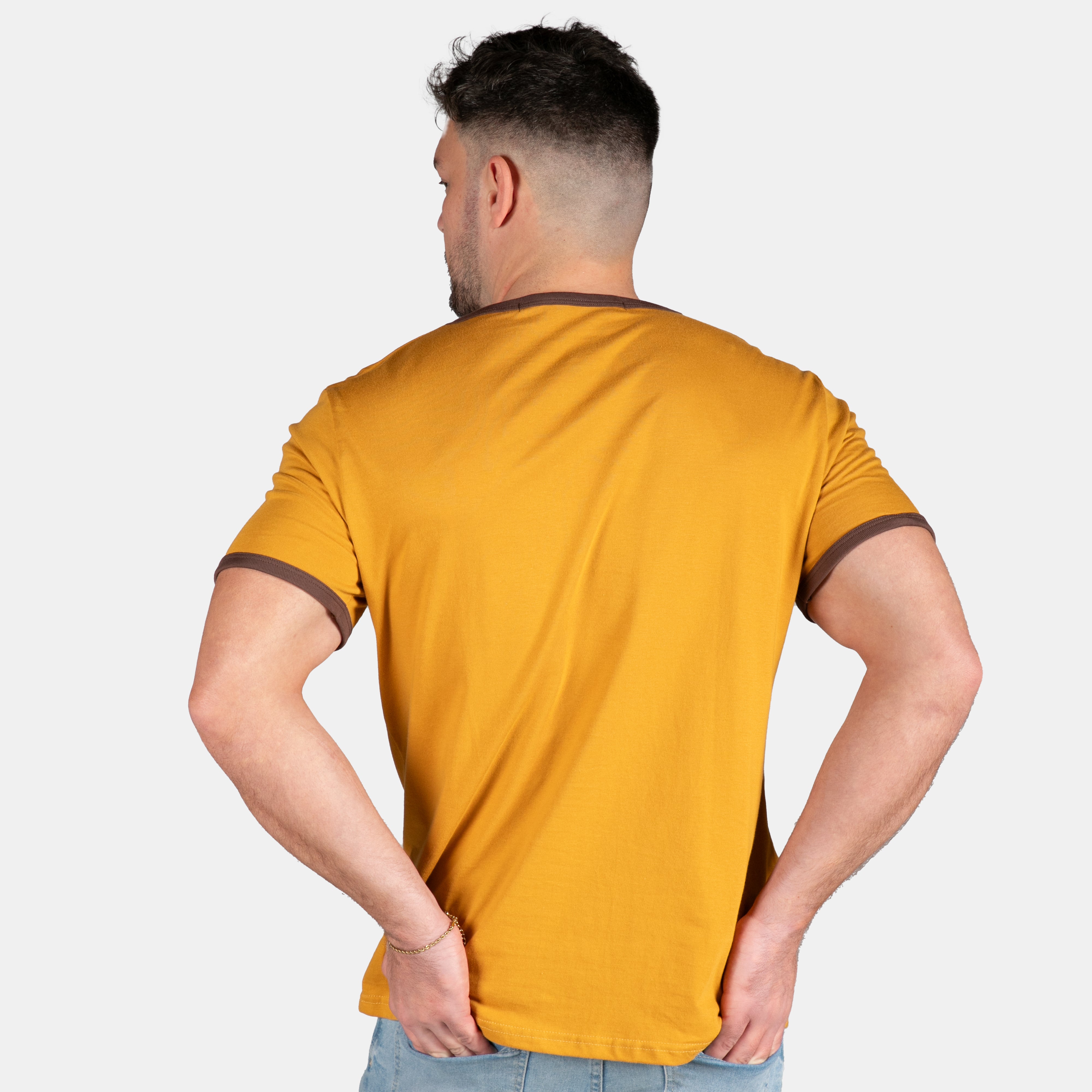 This is a standard box fit tee with brown binding on the neck and sleeves.