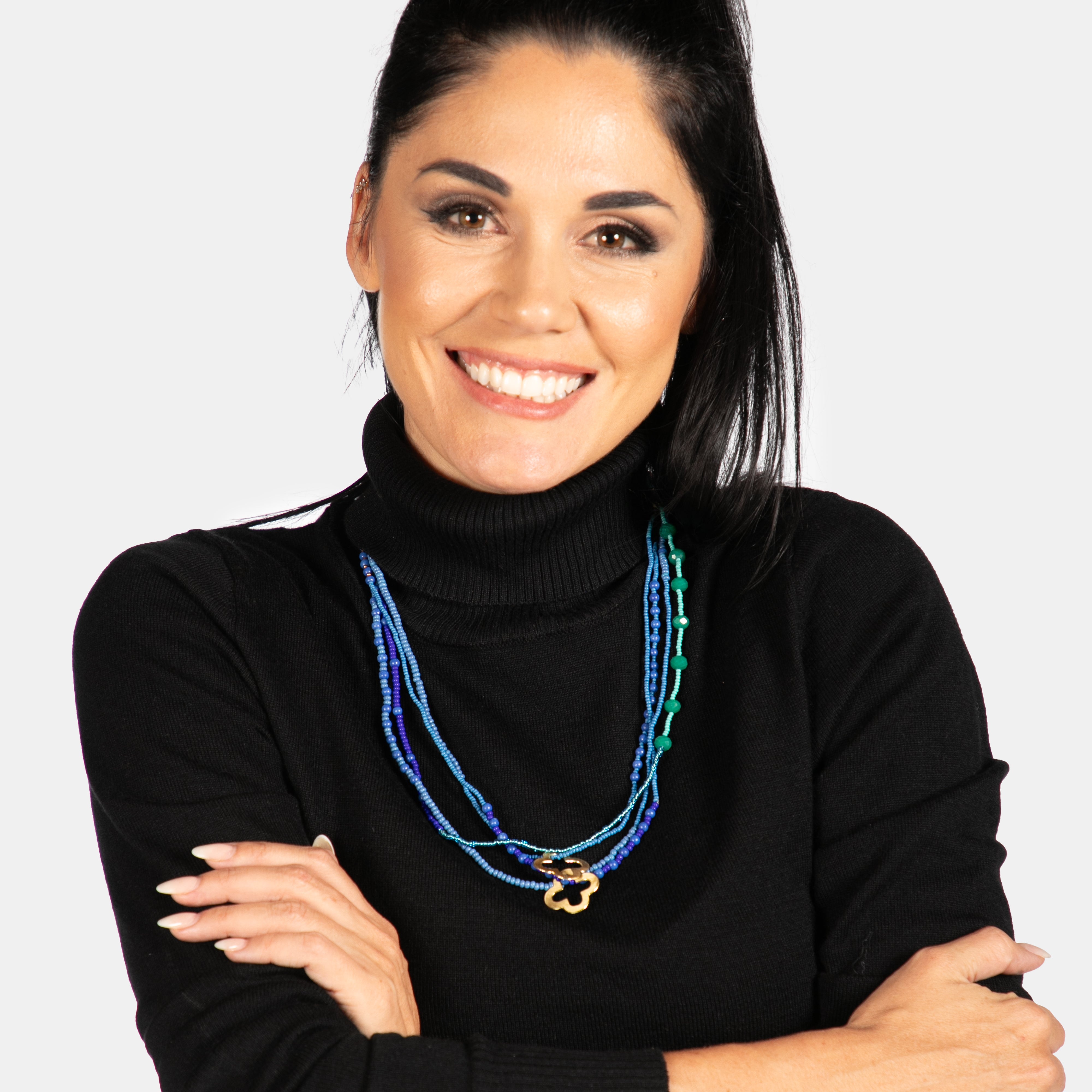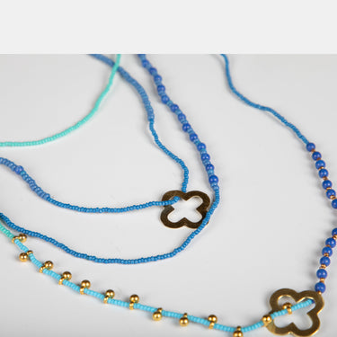 This delicate collection of beads and metal make a stylish statement necklace. Four strands of hand beaded seed beads with the addition of 2 metal cut out pendants in the shape of a flower, combine to create this necklace. Available in 4 colours.