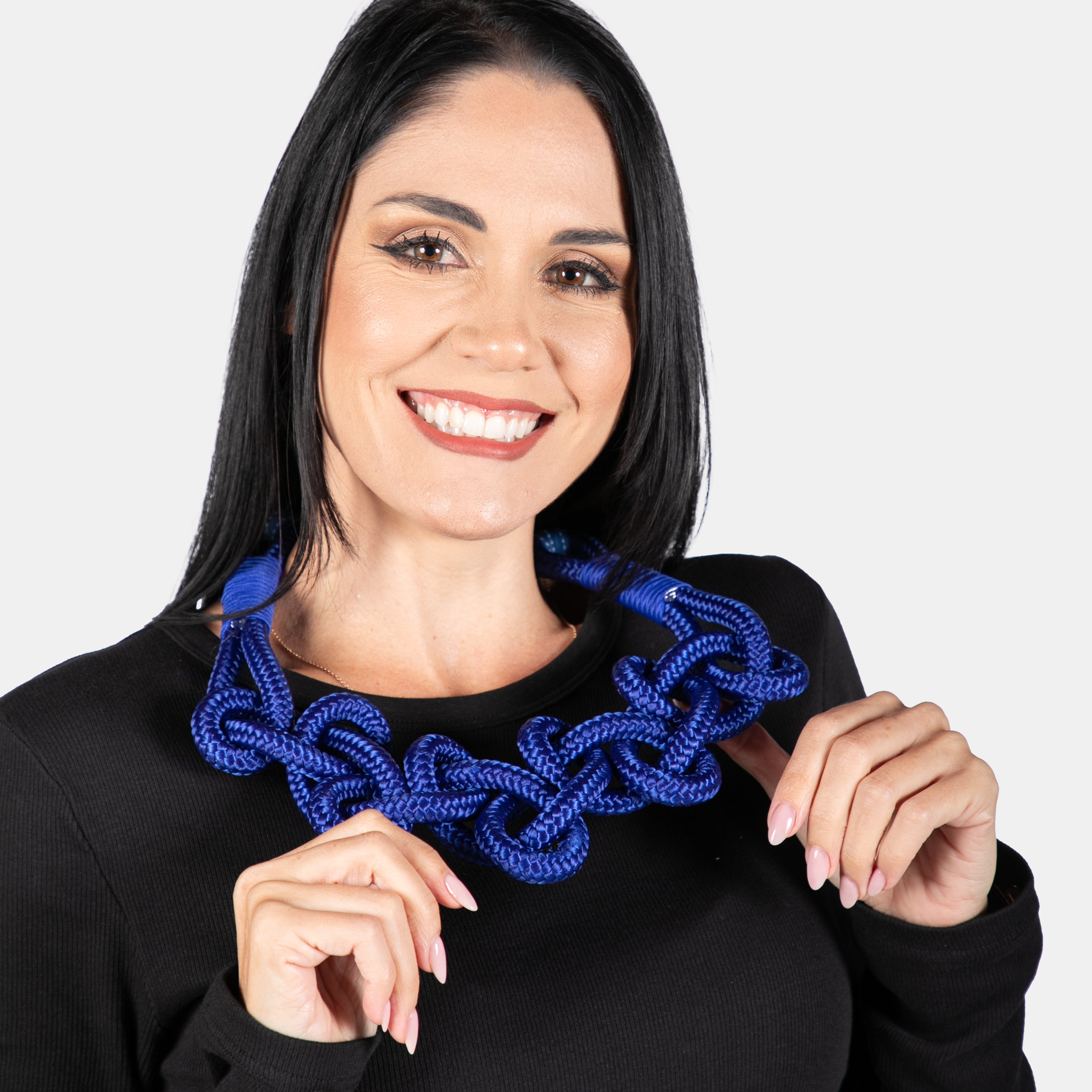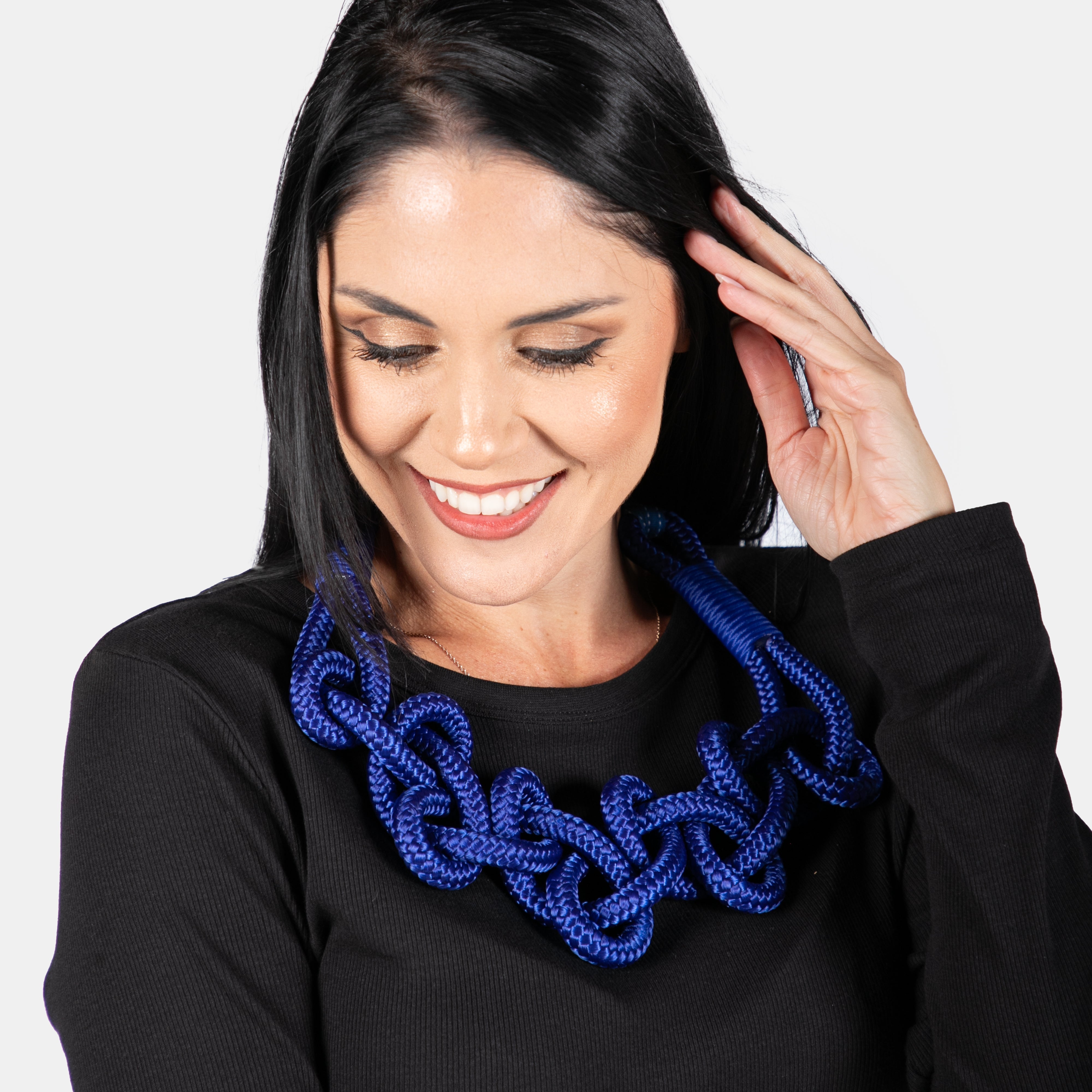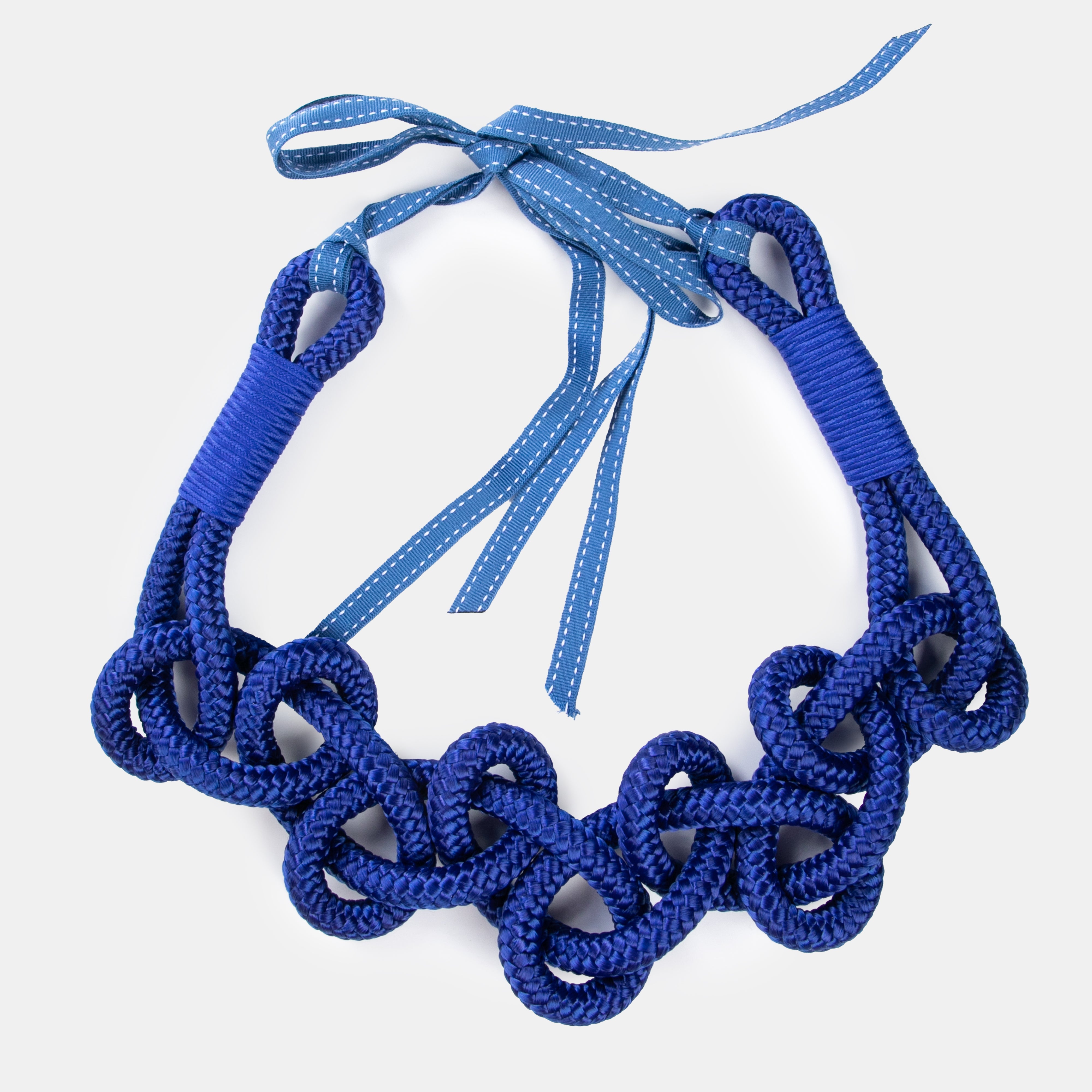 A bold statement, yet lightweight necklace hand crafted from twisted rope. The ends are tied behind the neck in a large Petersham Ribbon bow.