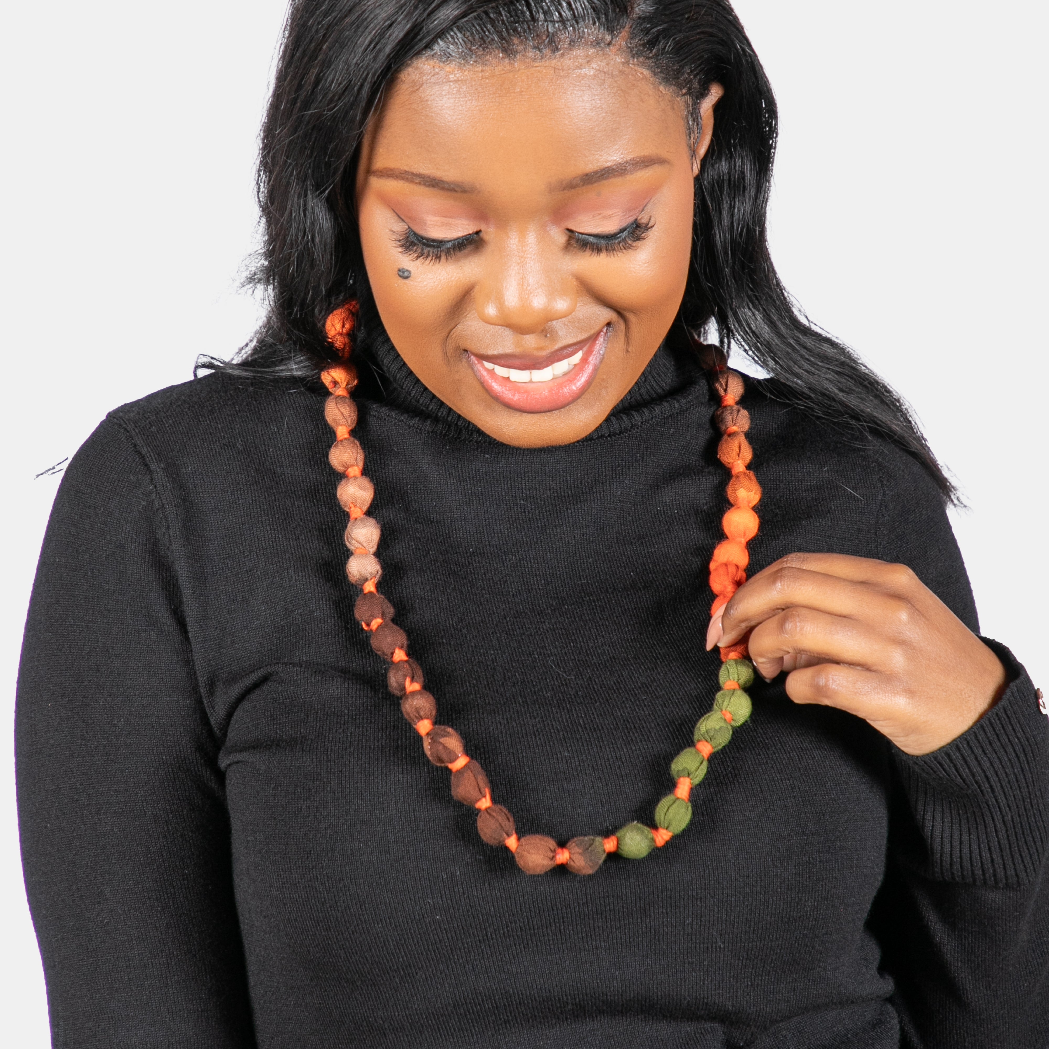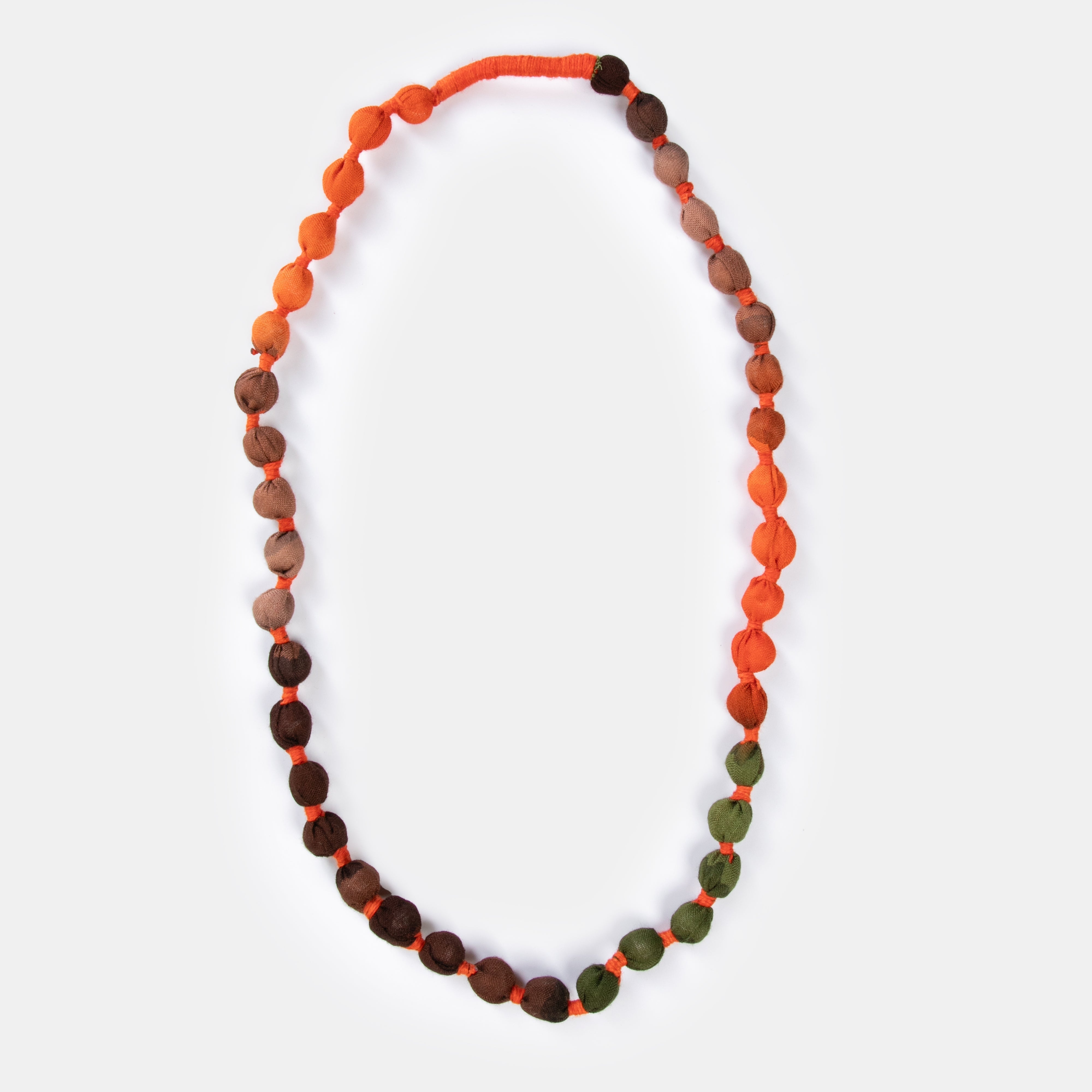 Colourful fabric covered beads create a string of joy around your neck. Available in three colours. Wear them all together for a unique statement this season.