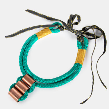 2 ovals are the feature of this necklace crafted from tightly wound rope. Joined together by 3 gold sleeves that create the sculptural statement. The back is joined with a Petersham Ribbon.