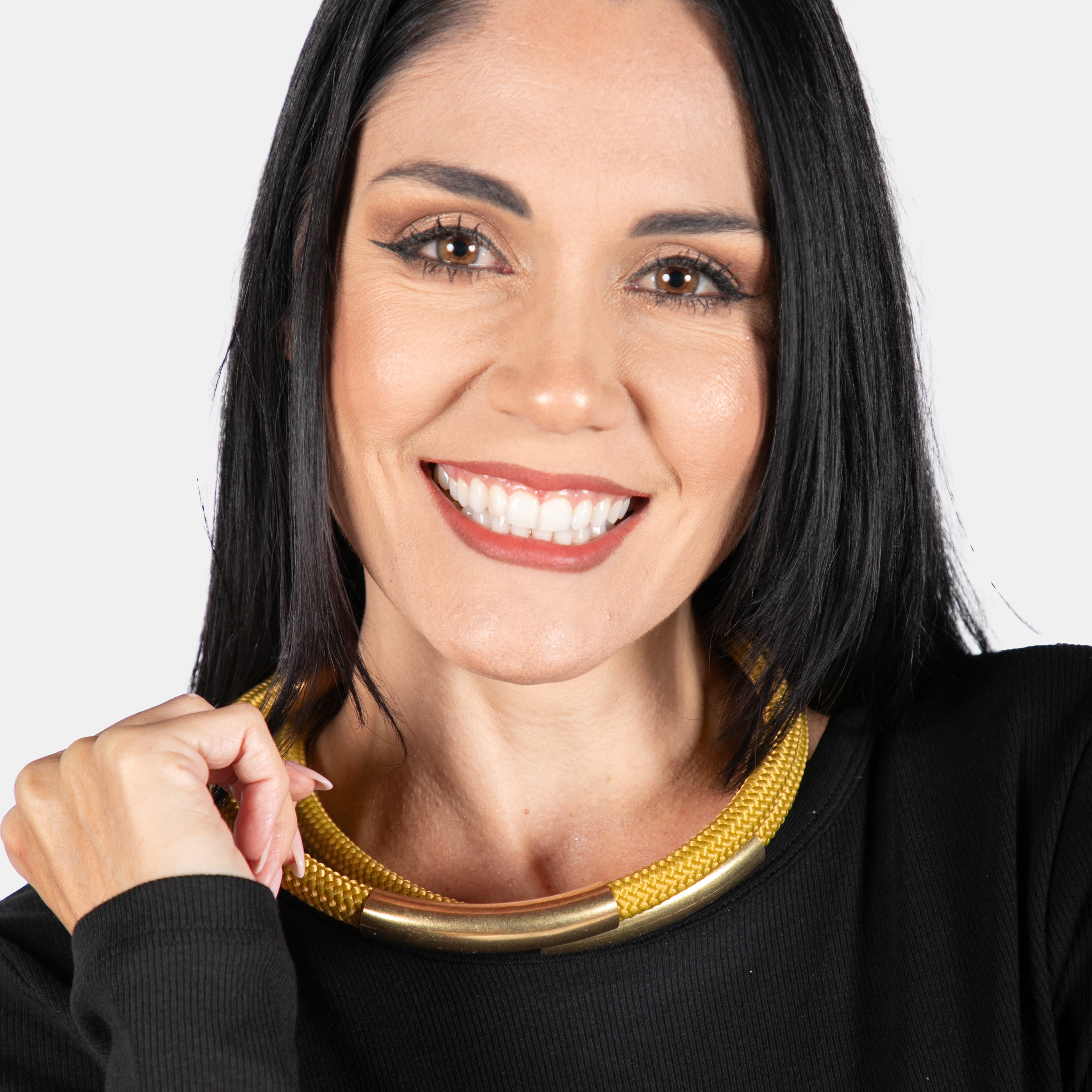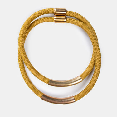 A stylish statement choker necklace with two rope and metal cords that join magnetically. Available in Red, Black and Mustard.