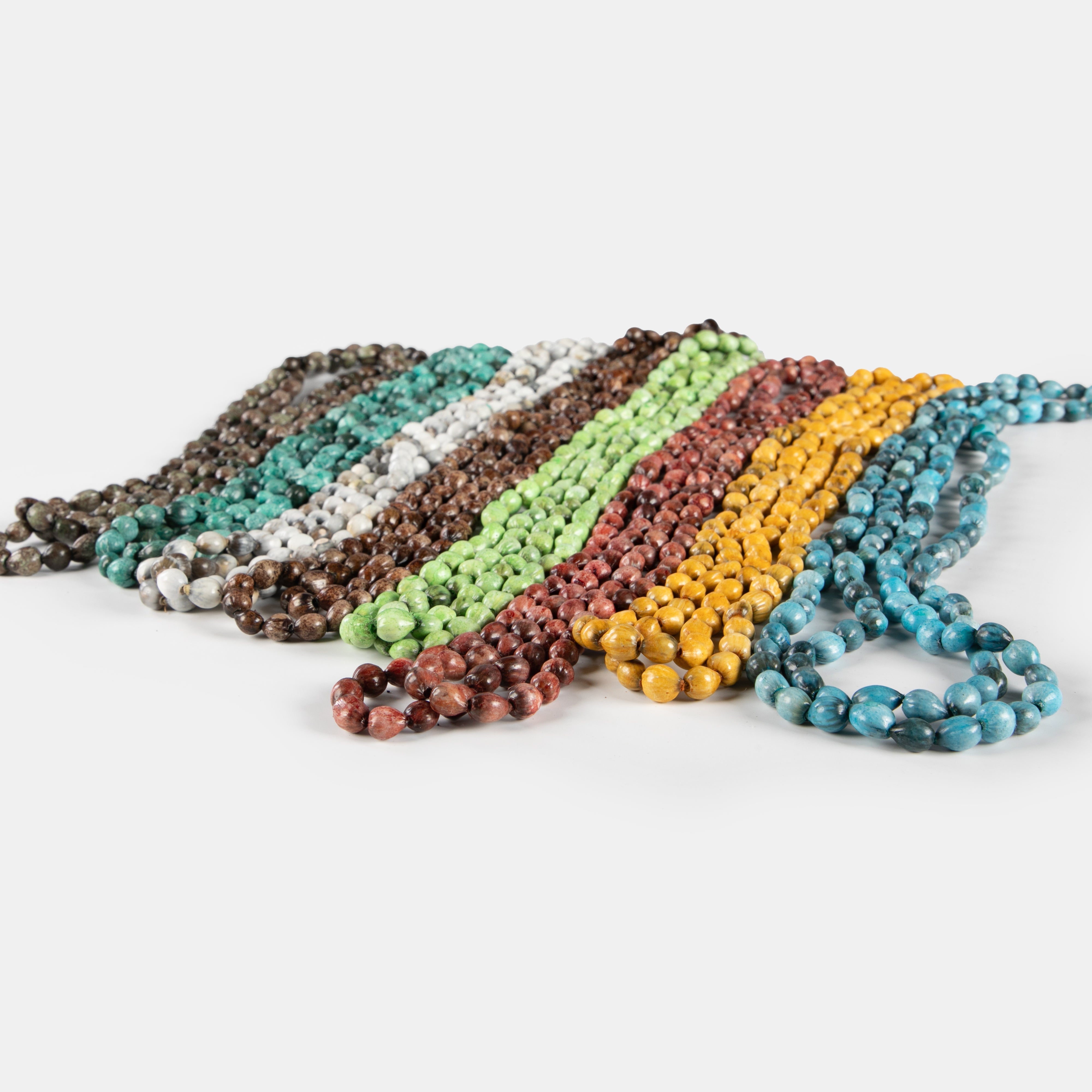 Also know as Imfibinga seeds, these beads are dyed in beautiful colours to create an organic necklace worn straight over the neck or twisted to form a choker. Get them in all the colours.