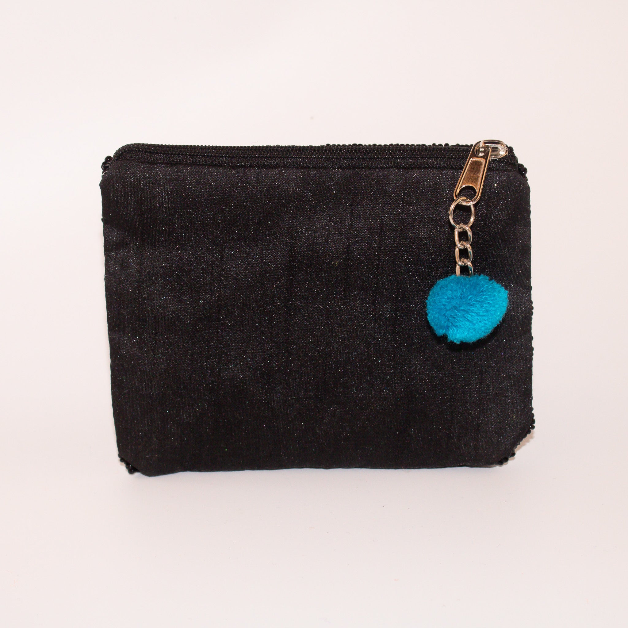 This little purse is hand beaded on the front, lined inside and boasts a pom pom on it's zipper. Use it for make up, cash, earphones or just about anything.