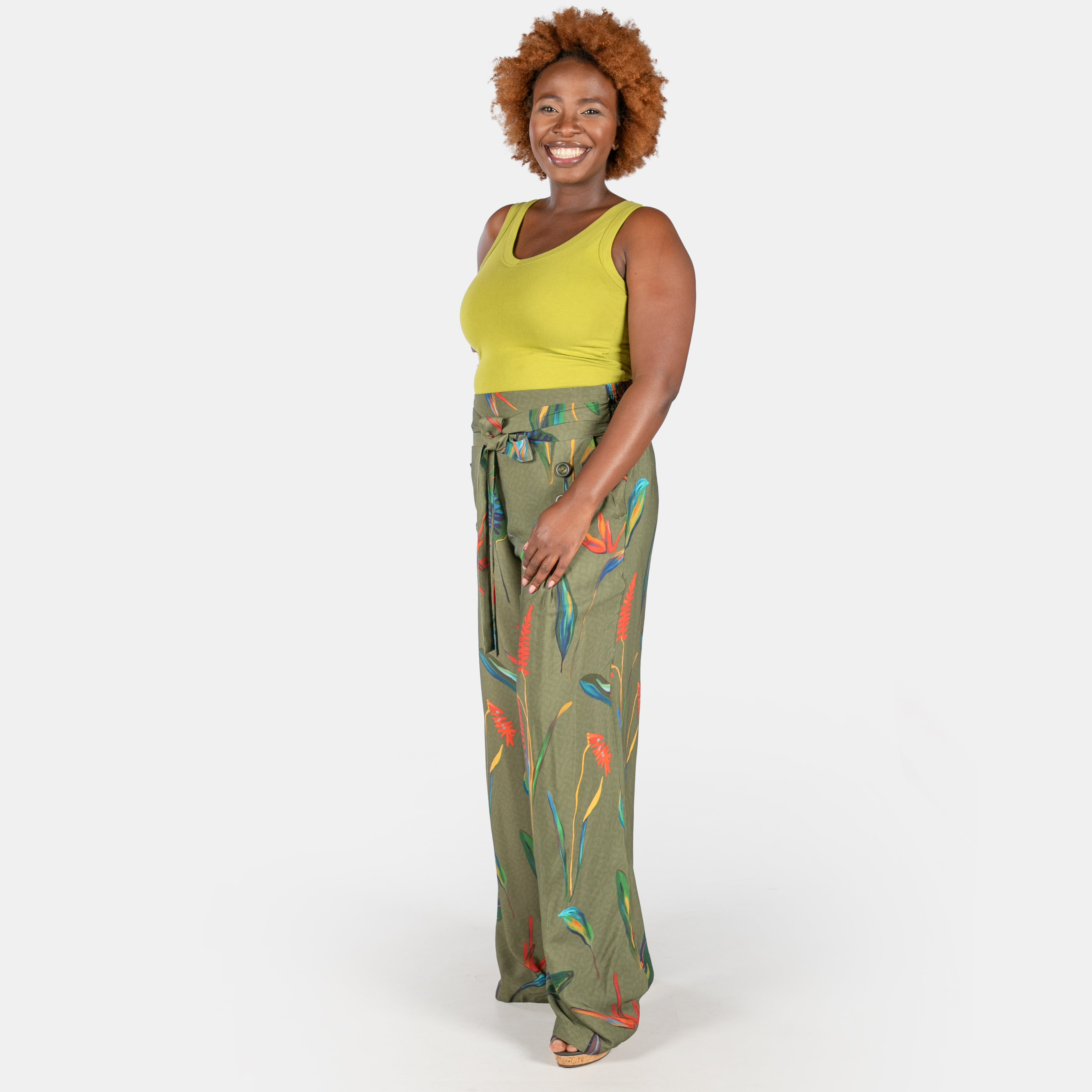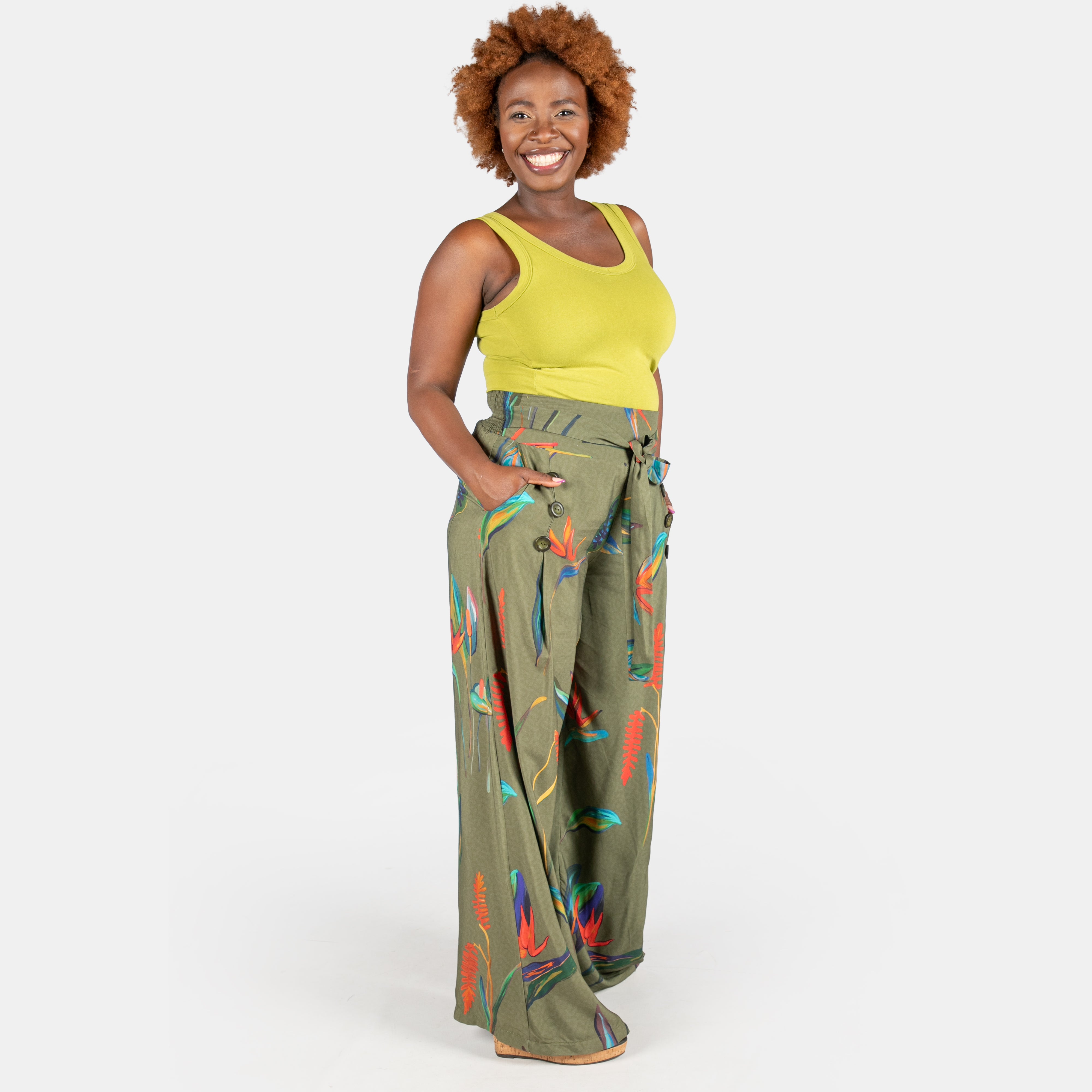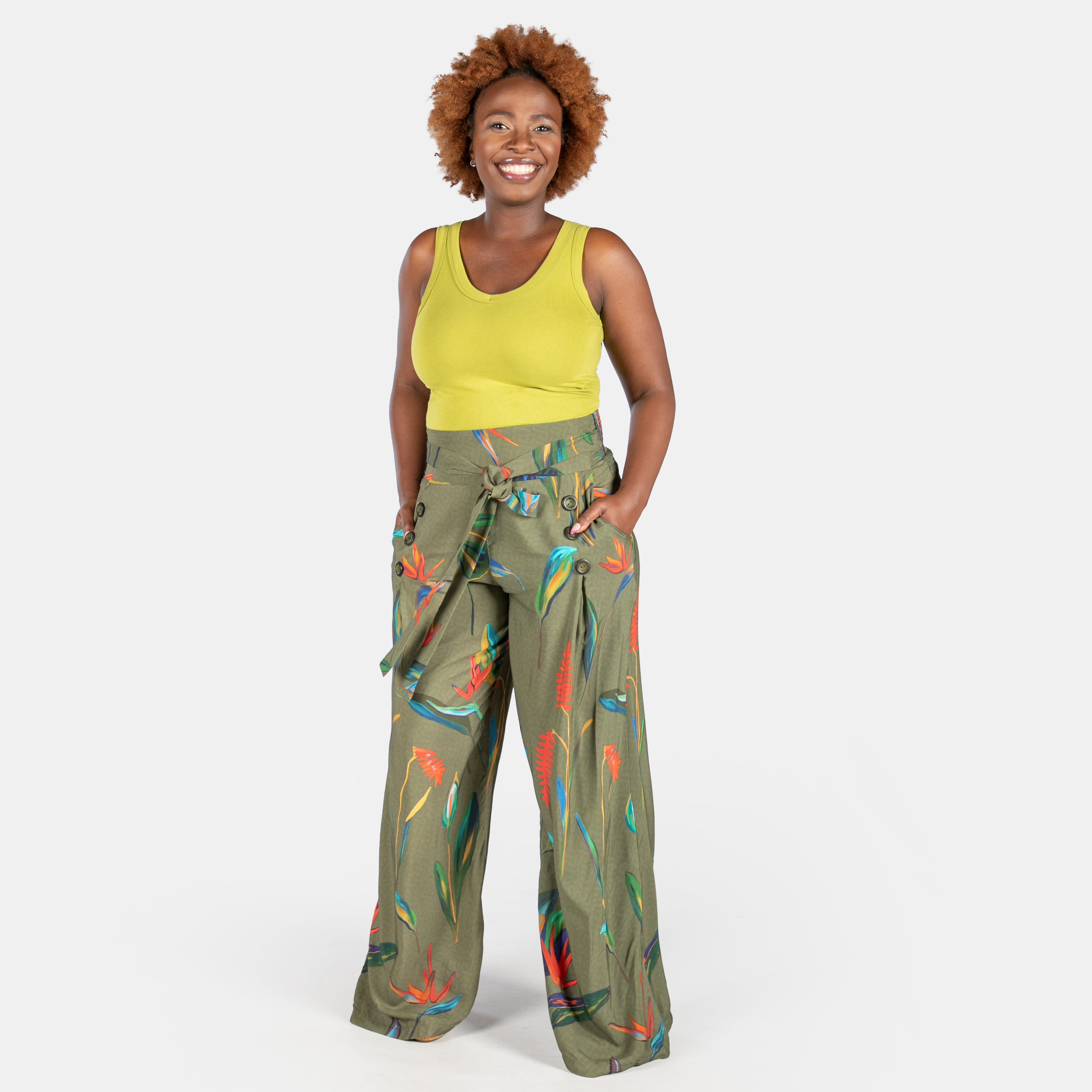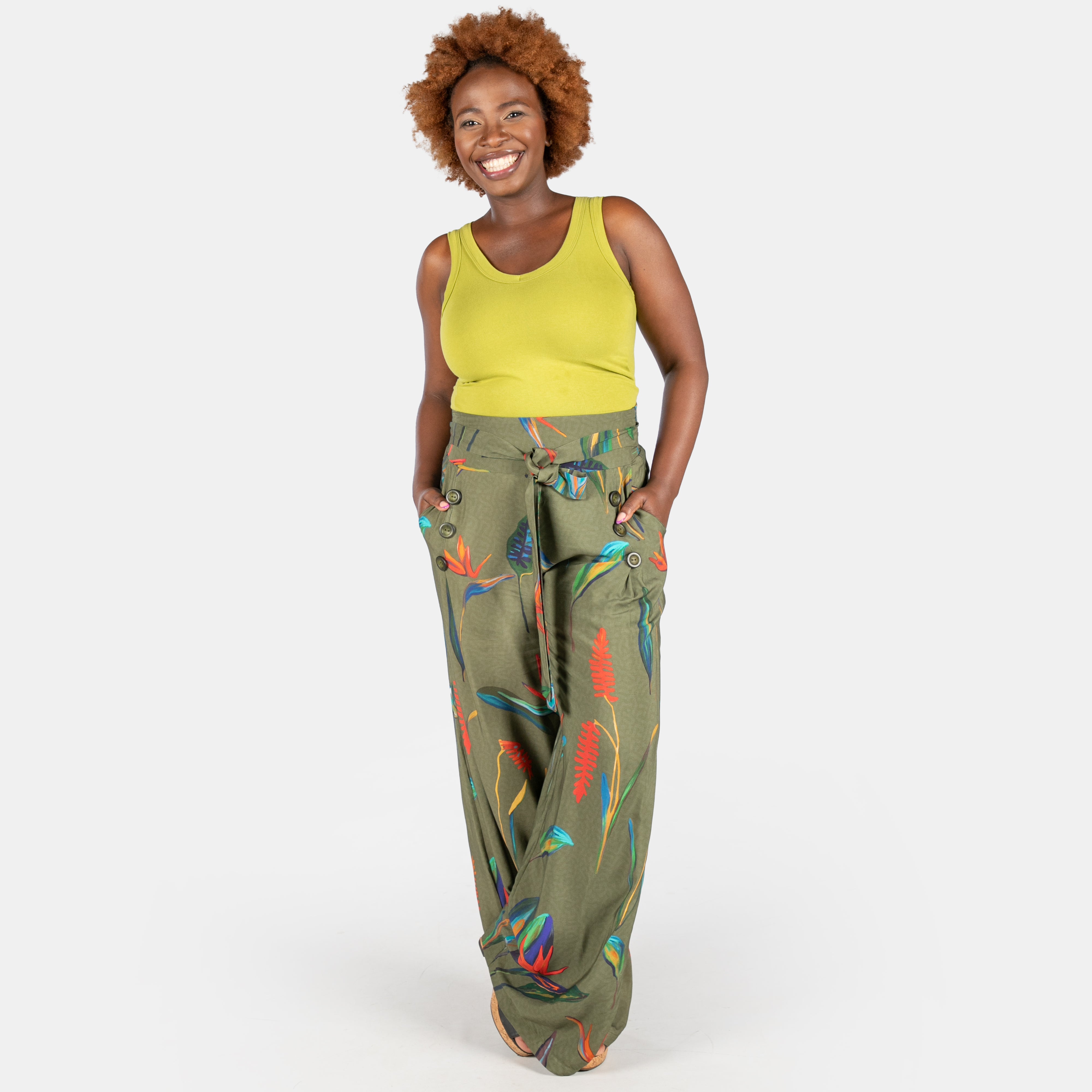The 6 button pants feature a broad waistband and a soft belt that is attached at the sides and ties in the centre. As the name suggest there are 6 buttons in front of the wide flowy long legs. You will find pockets tucked neatly into the side seams and an elasticated waistband at the back allowing you all day comfort, a flat tummy area and easy dressing.
