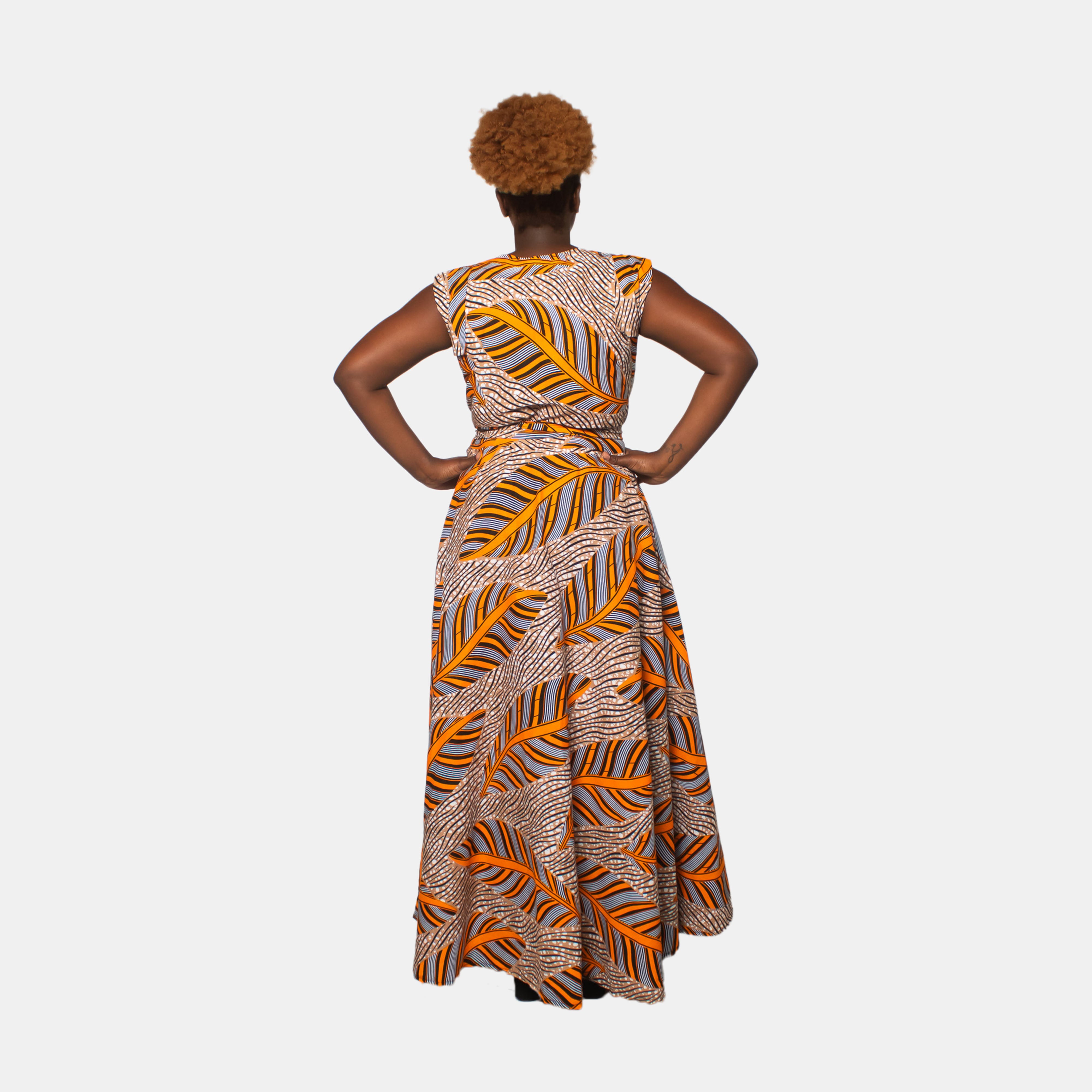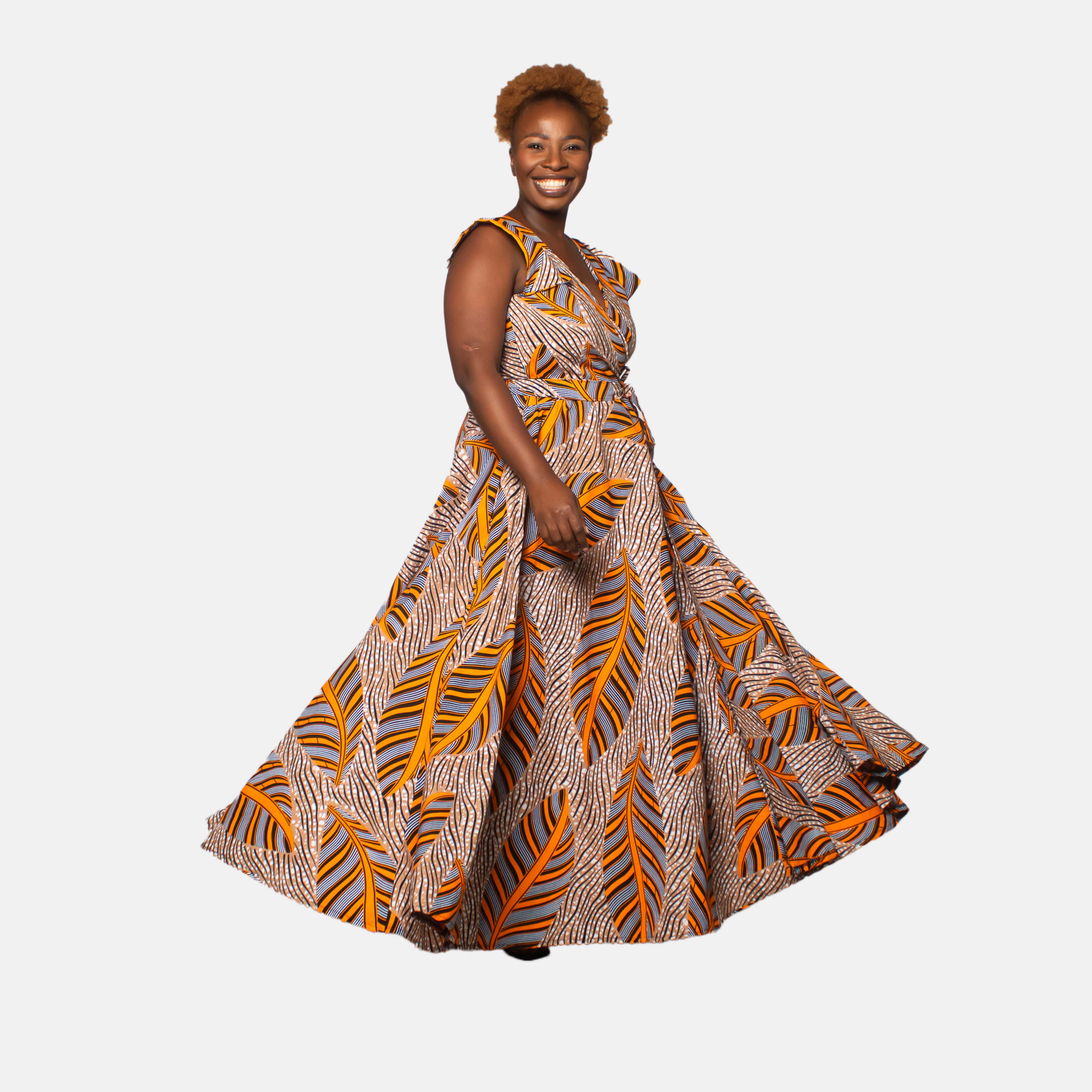 Sponono means 'cutie' or 'beautiful' and this dress suits it name for sure! She boasts a V-neck with a cross over bodice and short shoulder flaps for sleeves that keep you cool in the hottest weather. The voluminous skirt crosses at the waist with ties that thread through slits in the side like a ballet wrap. Tie the belt in the front or the back depending on your preference.
