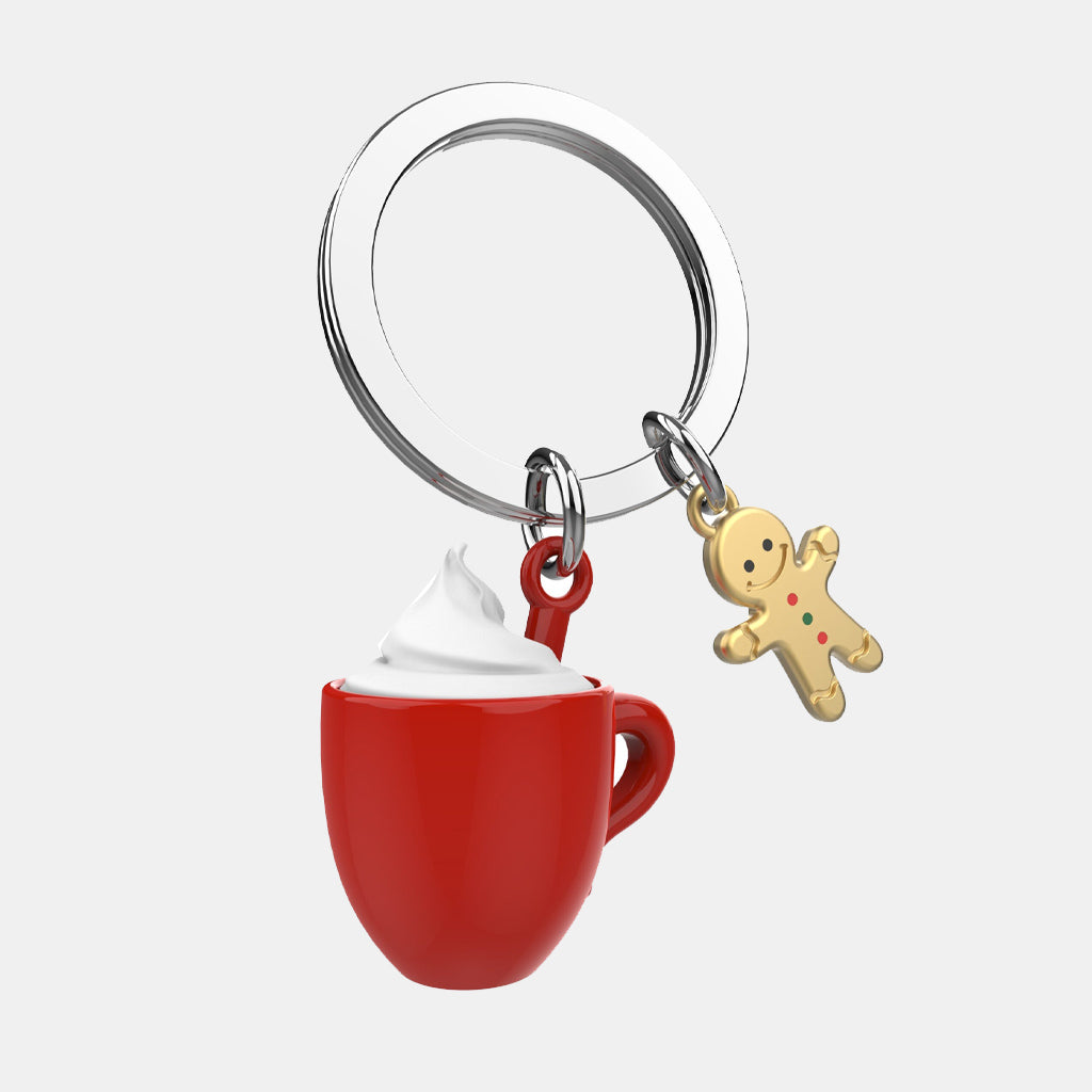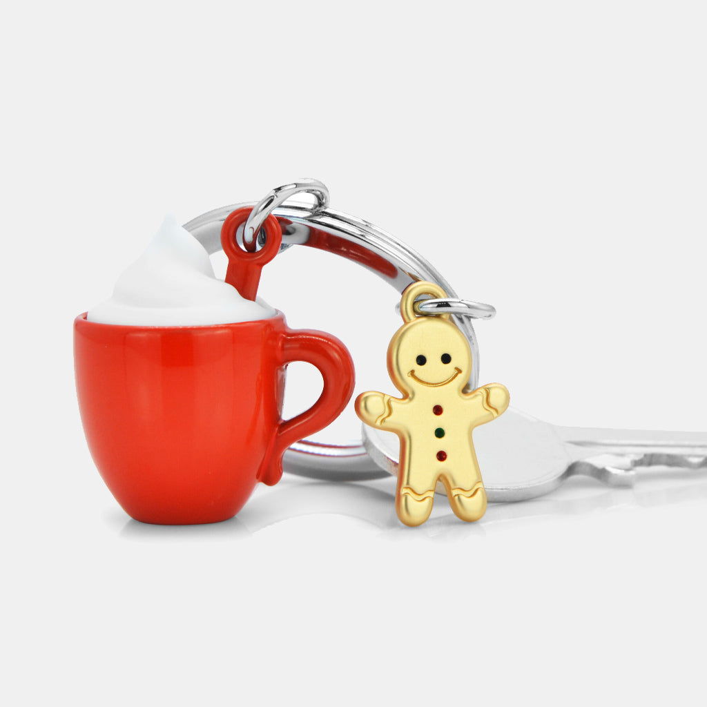 This delightful keyring boasts a miniature cup of hot chocolate and a gold gingerbread man charm. Crafted from zinc alloy and coated in a variety of finishes, it serves as a robust keyring and great gift for adults and kids alike.