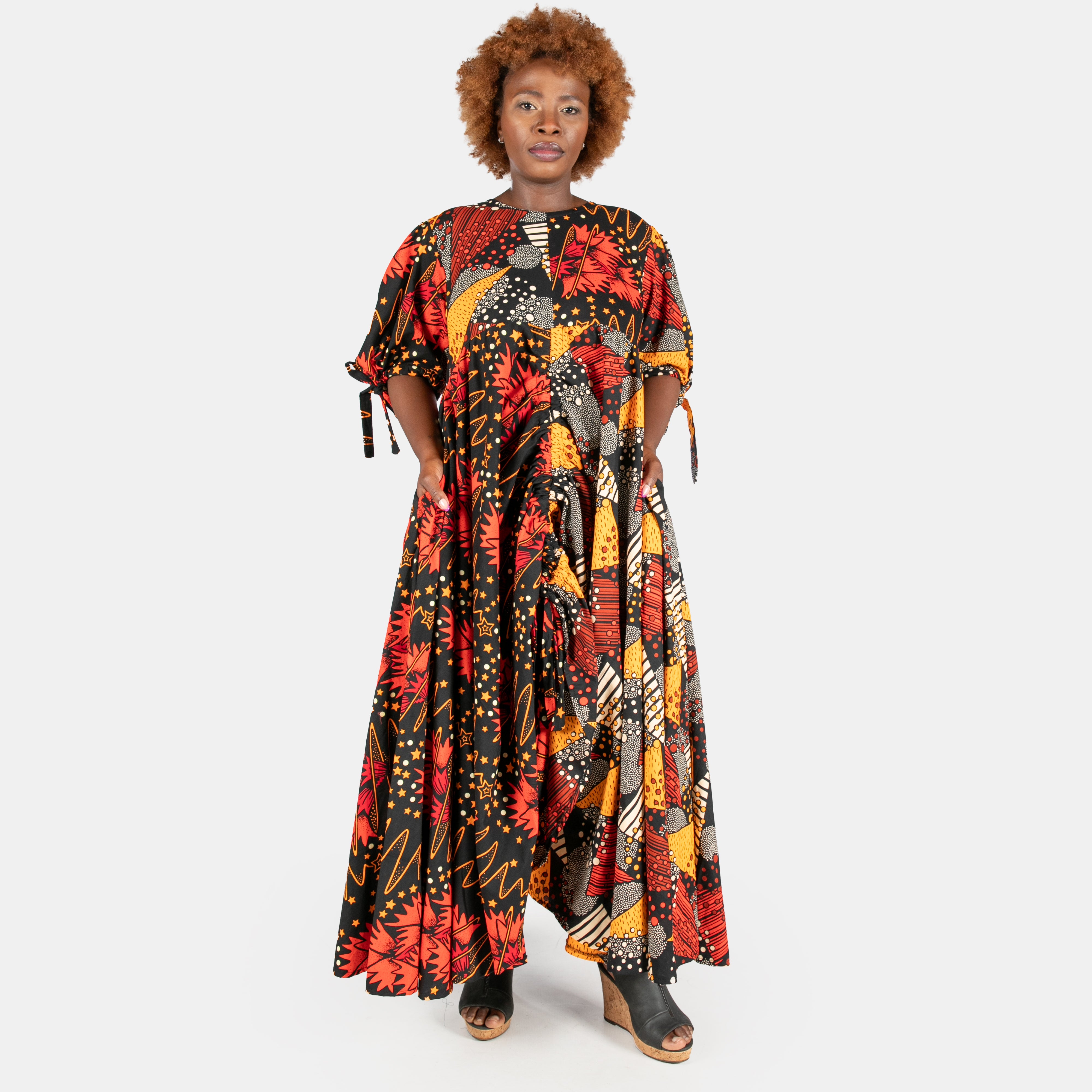 The voluminous skirt joins directly under the bust and extends out gracefully toward the ankles.