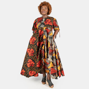 Notice the two panels of different fabrics that split the dress in two adding playful interest.