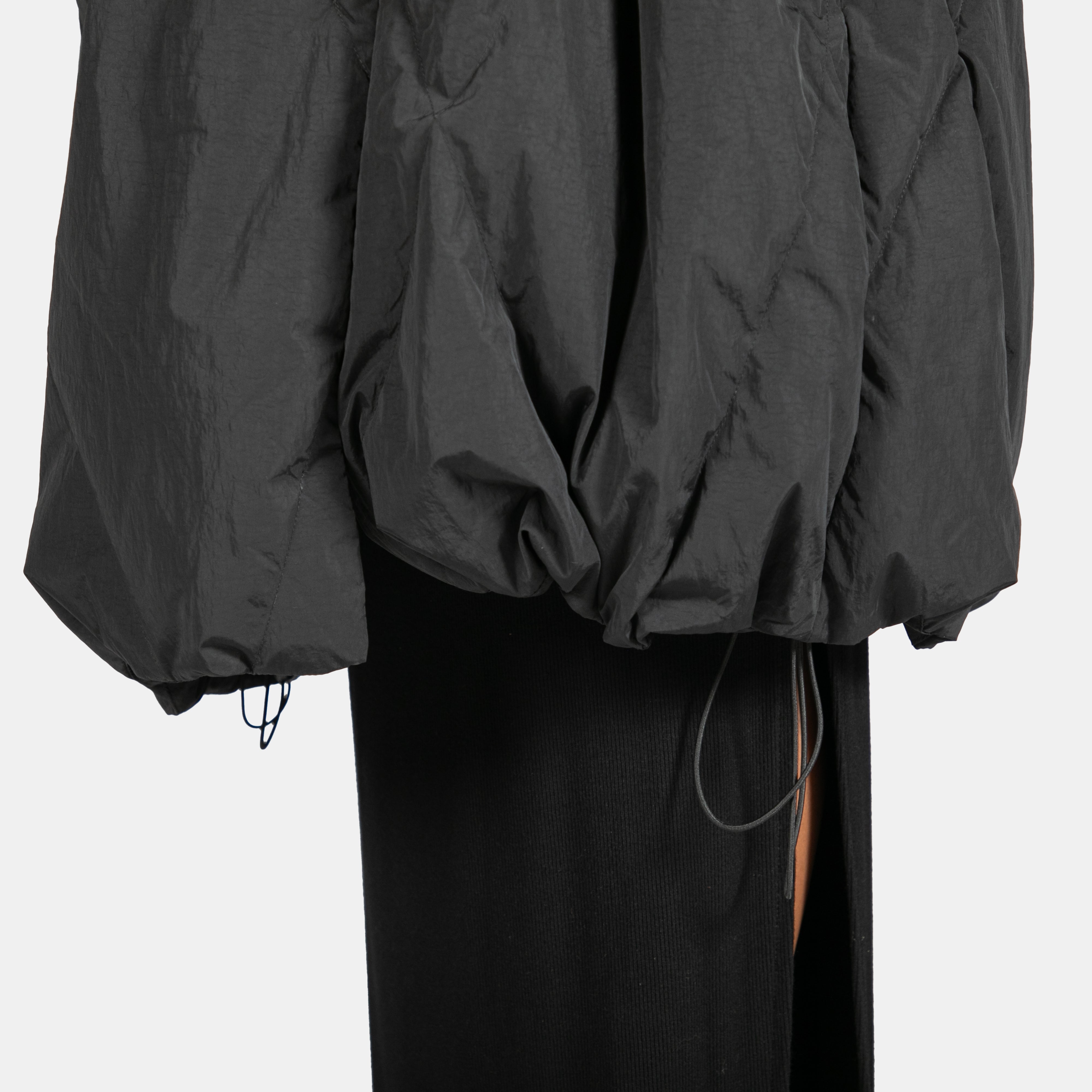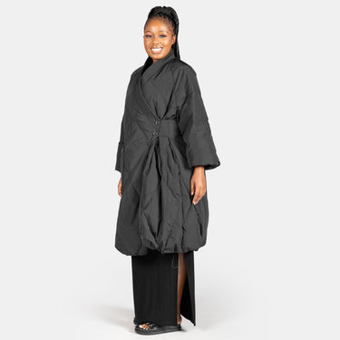 This gorgeous jacket has a Japanese sculptural element to it's design with no collar and a cross over closure in front. The double buttons are the only closure on this one size jacket but don’t worry it's padded with 85% white duck down so it's bound to keep you warm and toasty. The long sleeves and the hem have elasticated string with toggles allowing you to pull them in or leave them wide. The best feature of this jacket is how it compliments your strong fashion sense. It's one of a kind!
