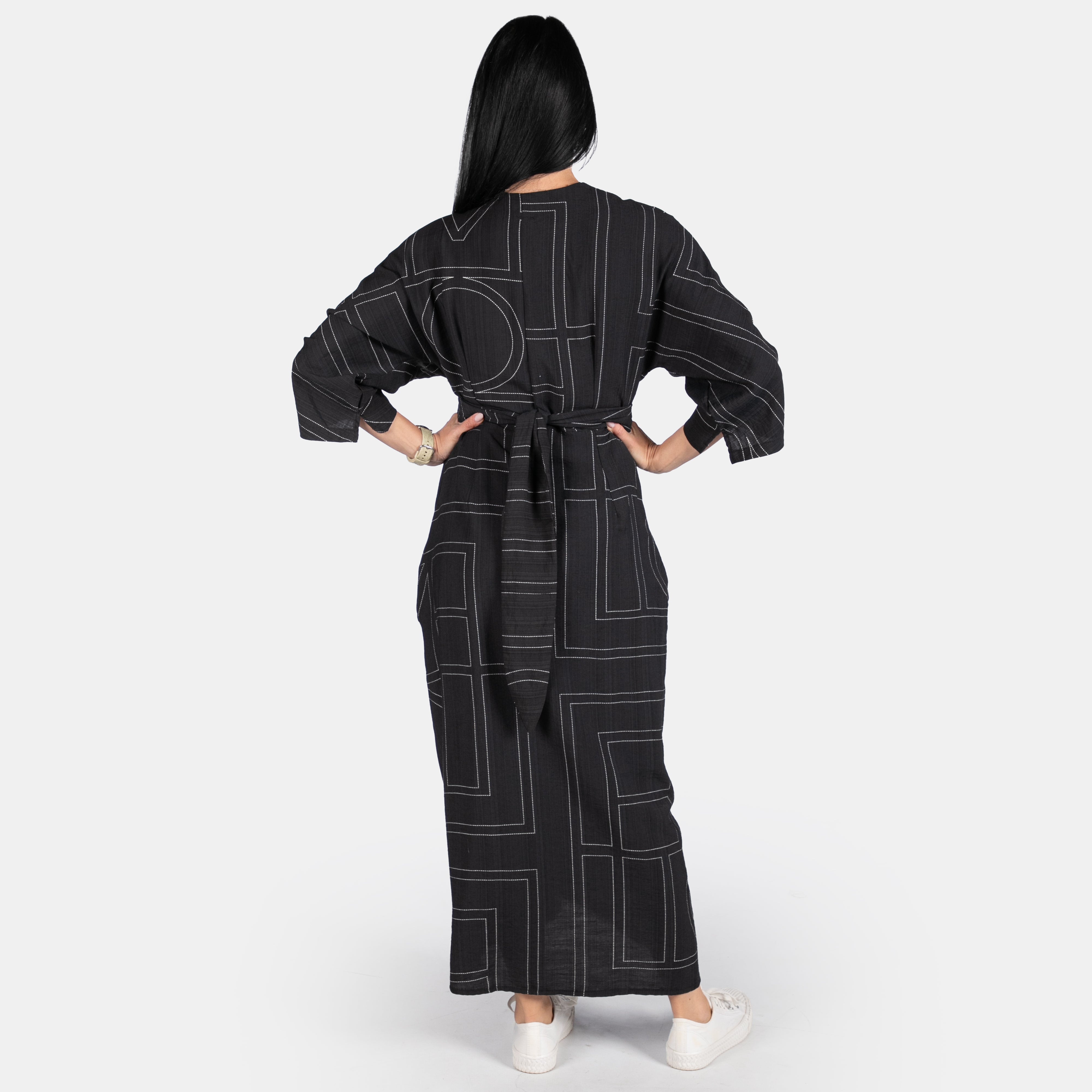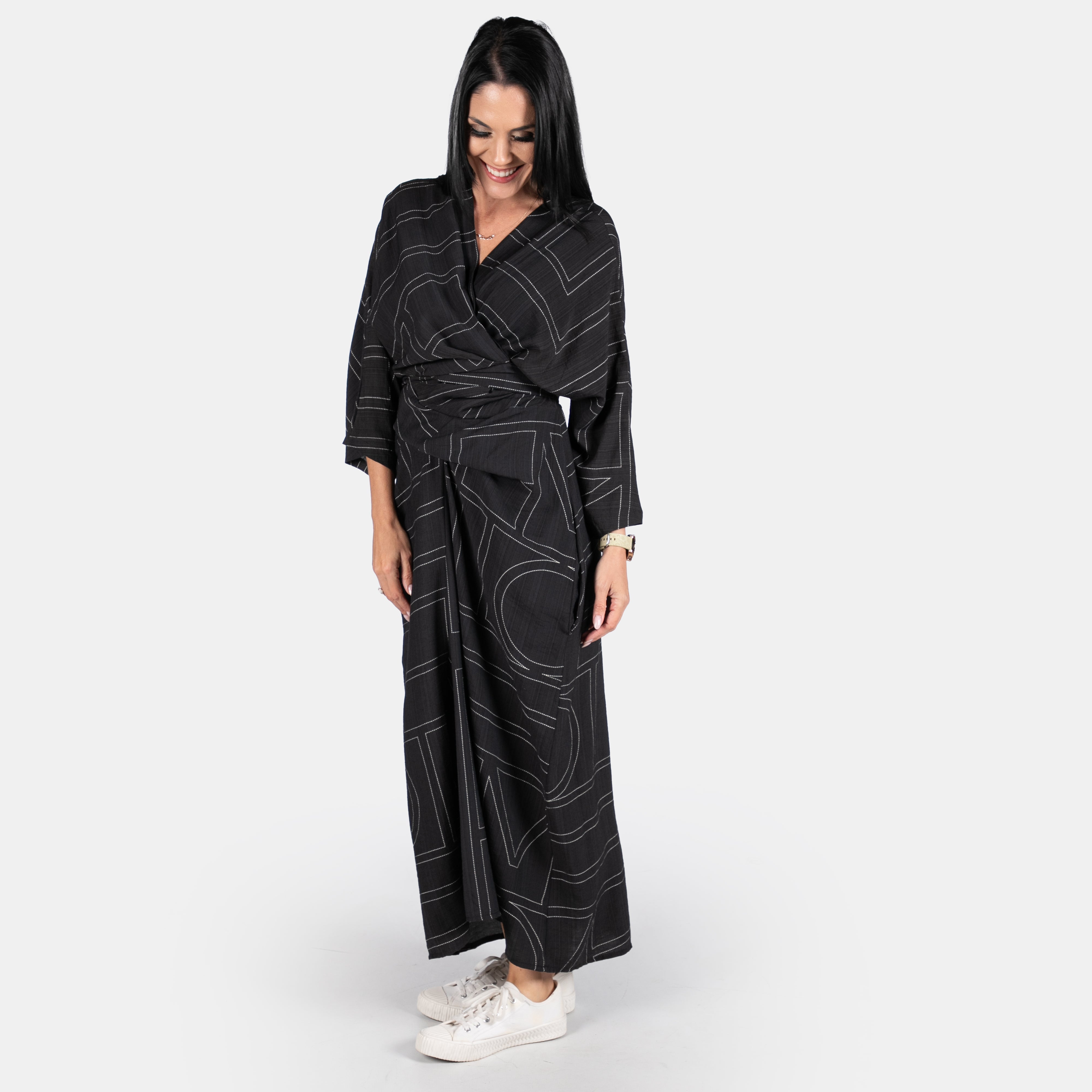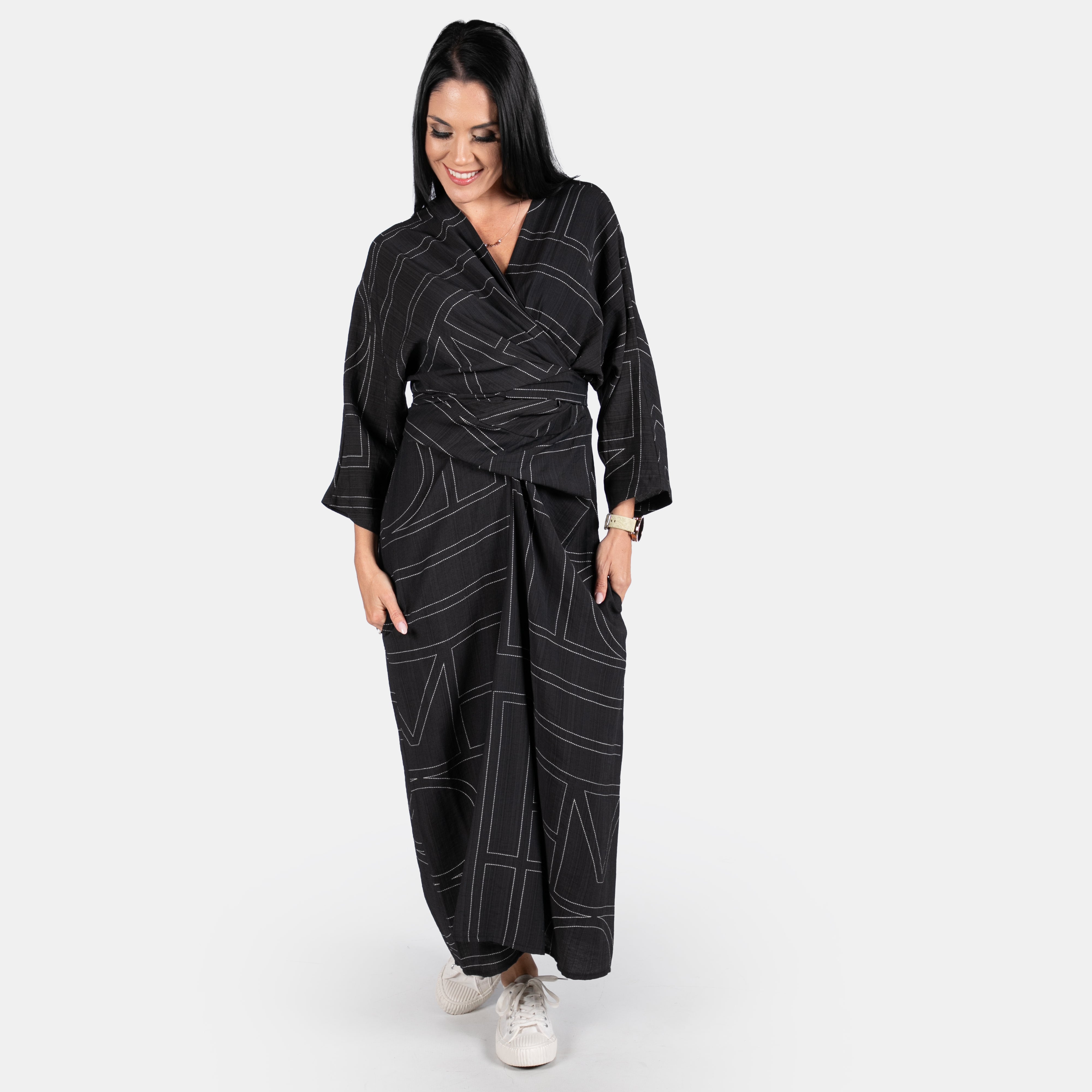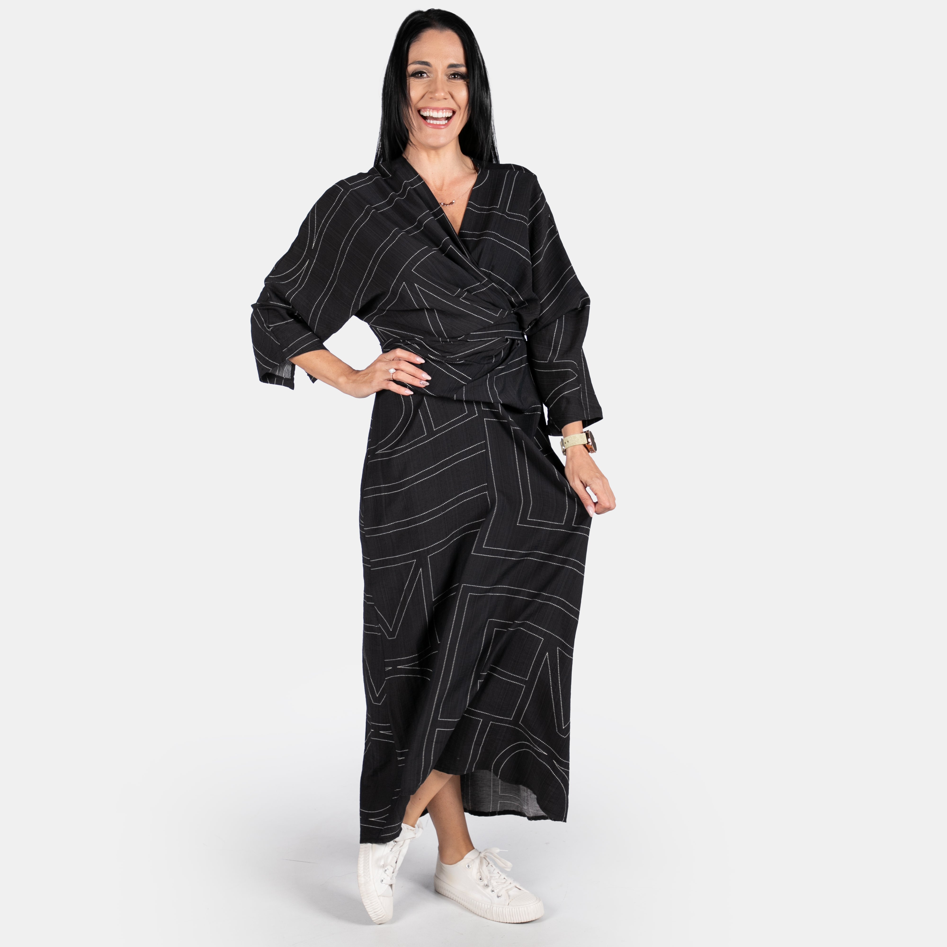 The bodice has two ties that wrap under the bust, not unlike a kimono.