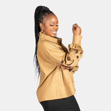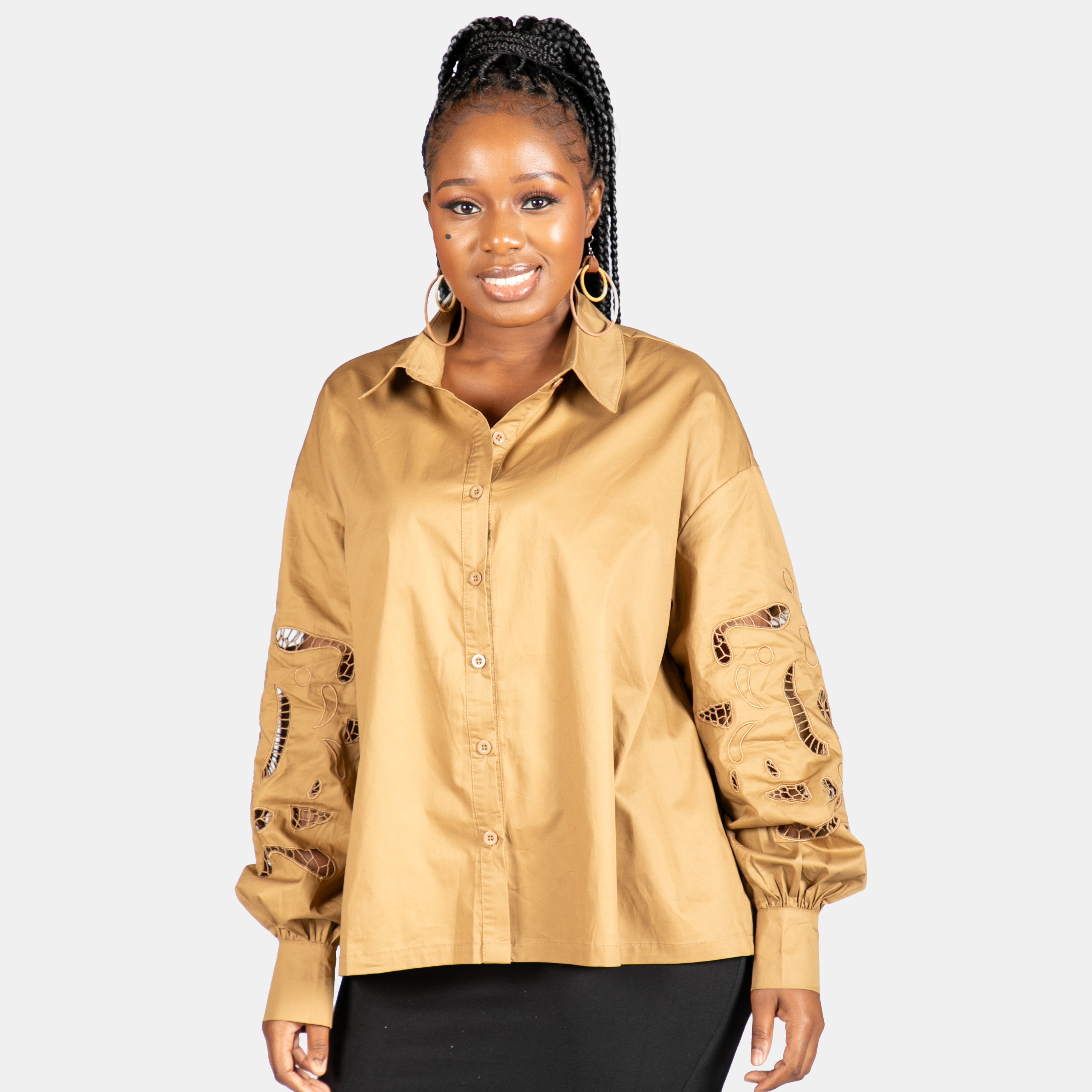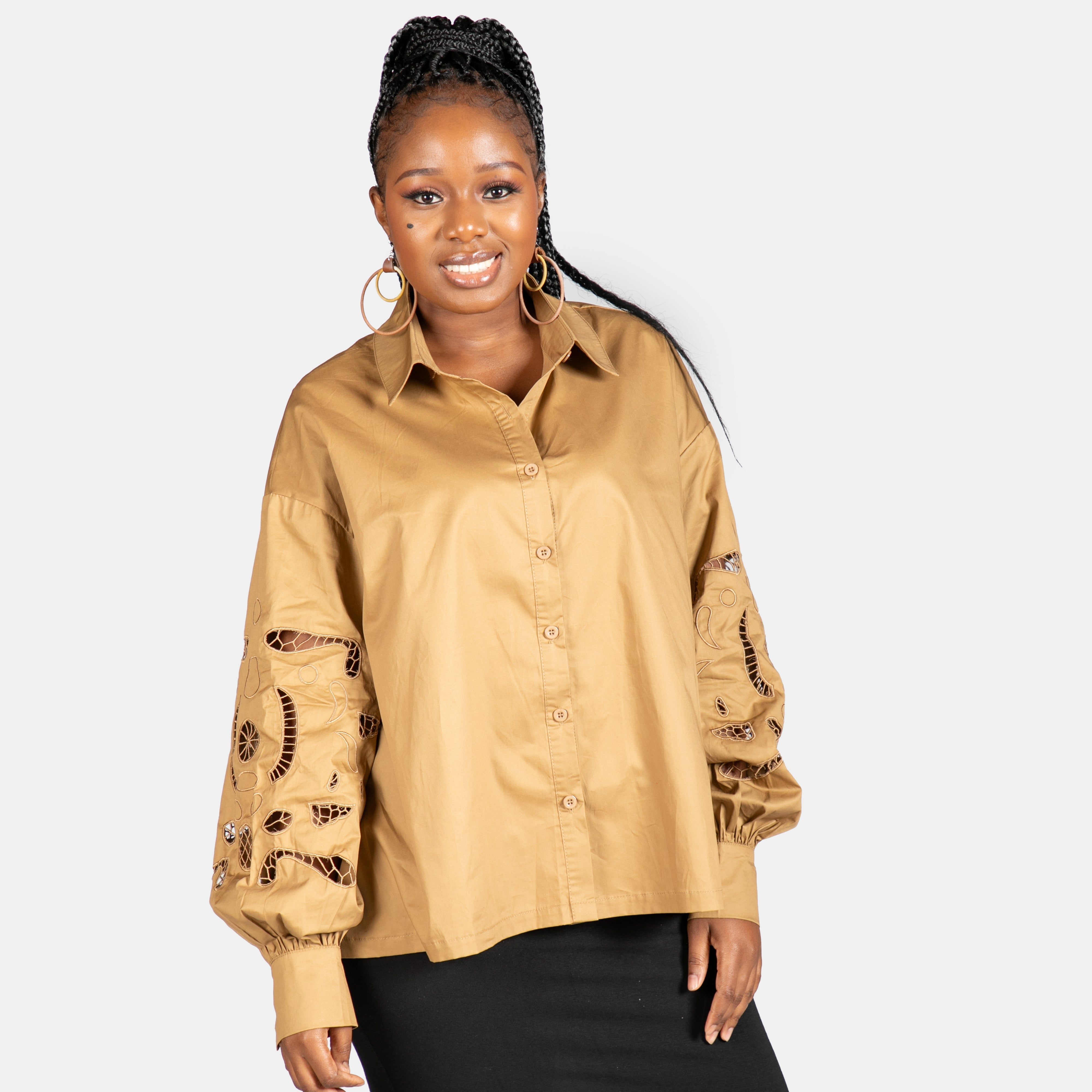 The Maleficent top features a full front button up and collar. The magic is in the long cuffed sleeves. They have an embroidered cut out down the length of both sleeves. Available in Black and Khaki, this shirt is one size fits most and designed as part of the Easy Breezy mix and match range. 100% Cotton.