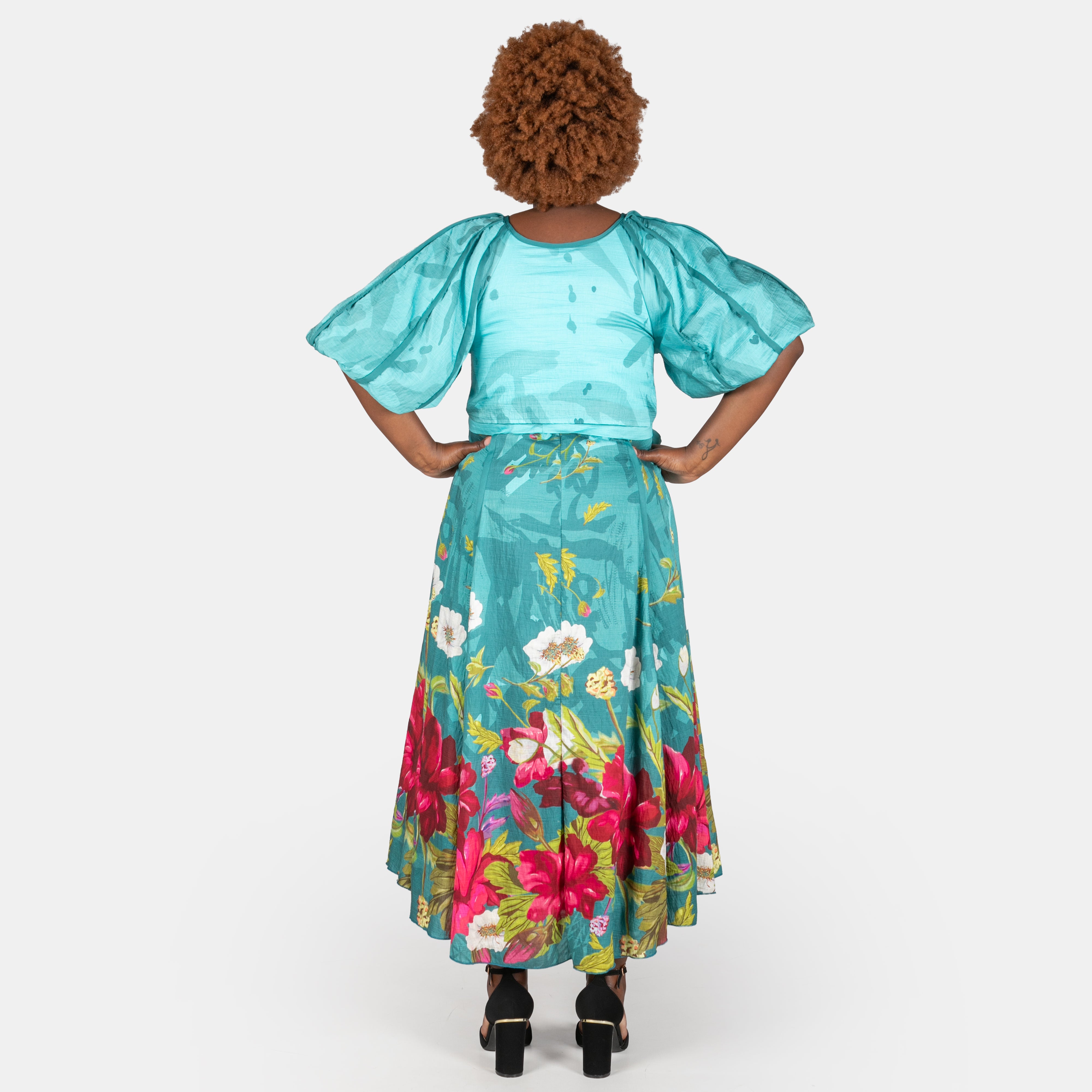 Vibrant floral trim dances along the skirt and clever design flourishes add personality to this beauty. Perfect for those who love a touch of whimsy in their wardrobe.