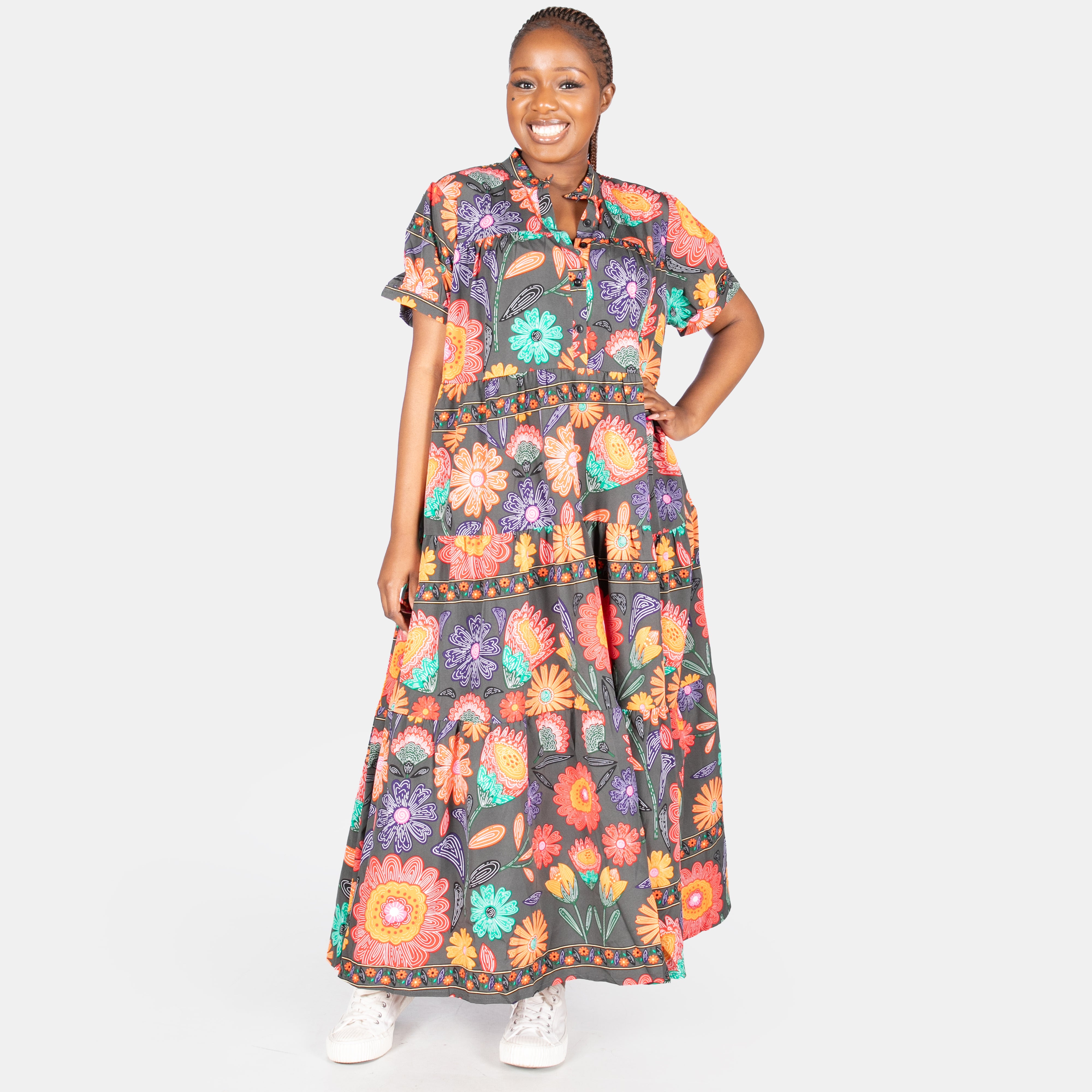 Short cuffed sleeves keep things polished, while the show stopping tiered skirt cascades in gathered layers for a flattering, voluminous silhouette.