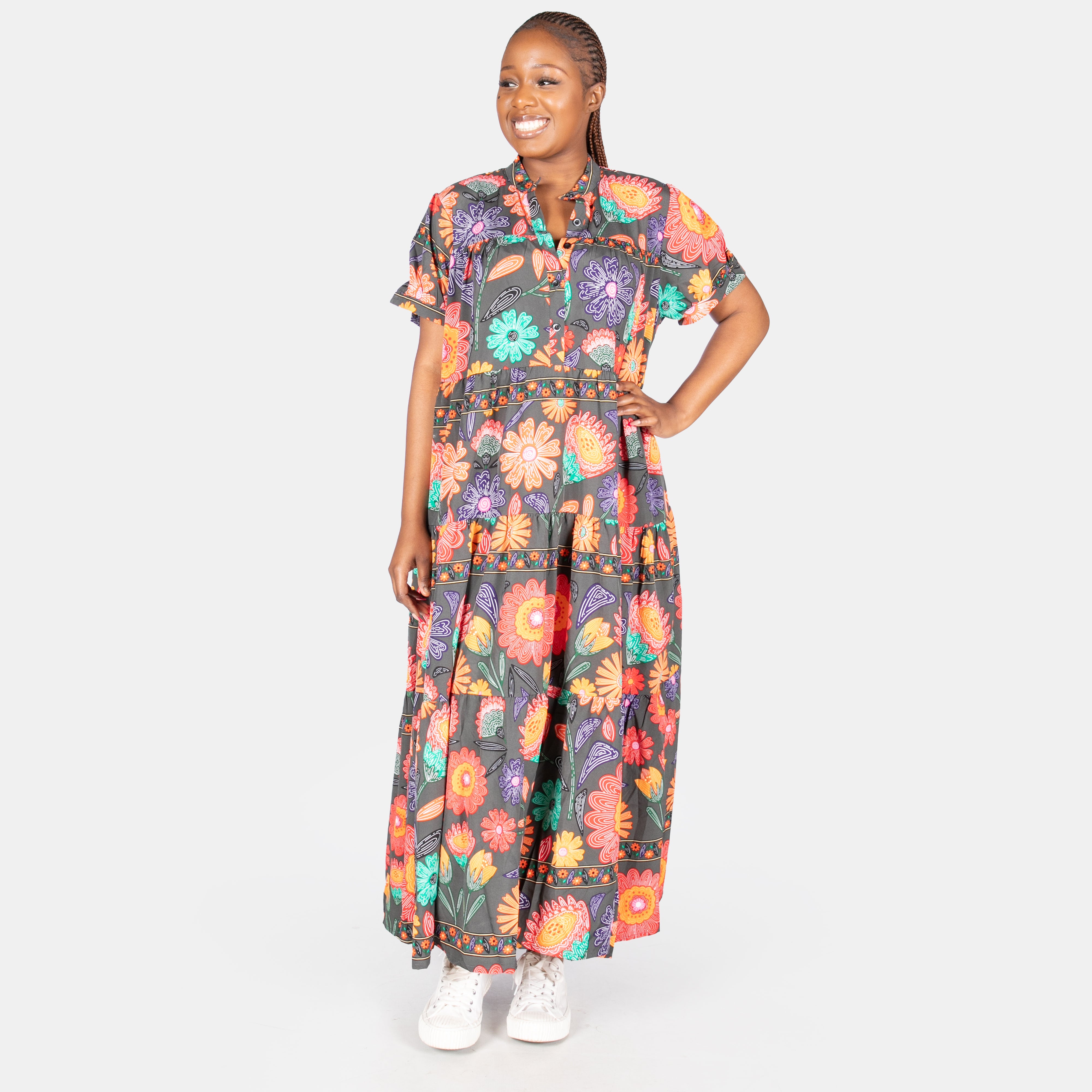 Bursting with vibrant florals and cheerful hues, this charming piece features a Mandarin collar, a crisp button-front closure, and elegantly gathered yoke.