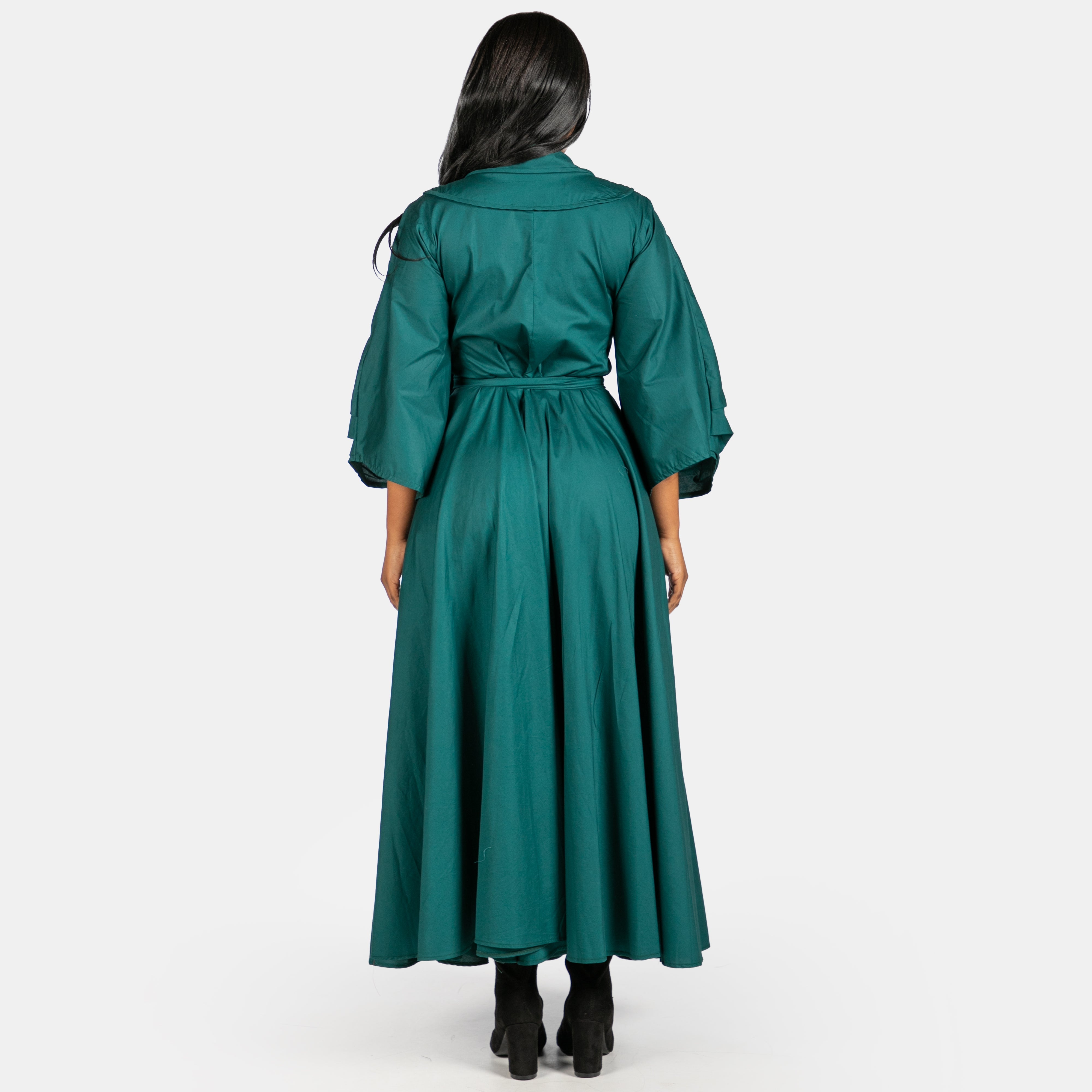 The bodice of this dress features a collar stand with a double binding feature highlighting the round neck and extends across the back shoulders. The long sleeves are wide, with pleated detail and have no cuffs. Attached to the bodice at the waist, the skirt is full, has pockets and creates movement when you walk or dance. wear this dress with heels or flats depending on the occasion and get ready for a long relationship with this beauty.