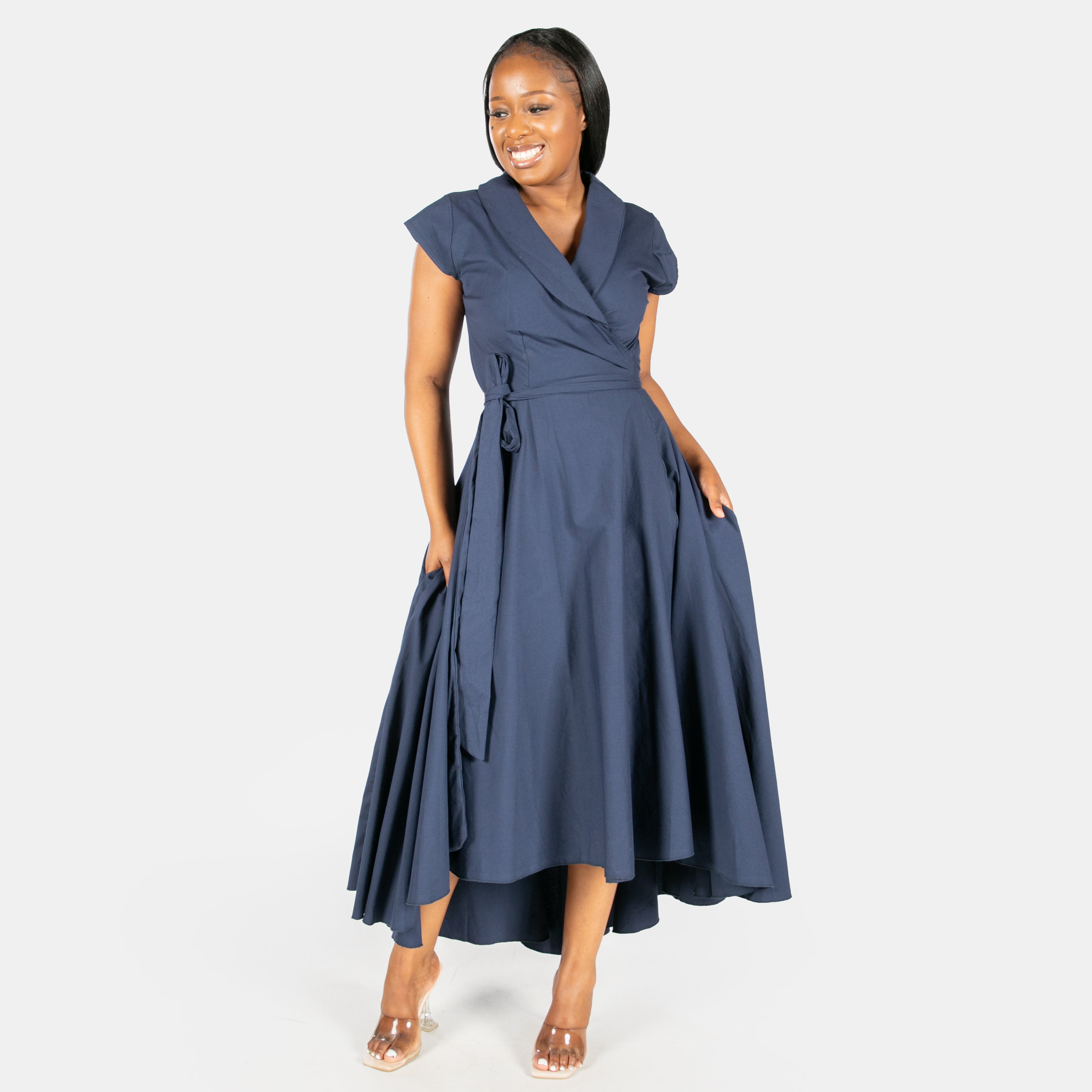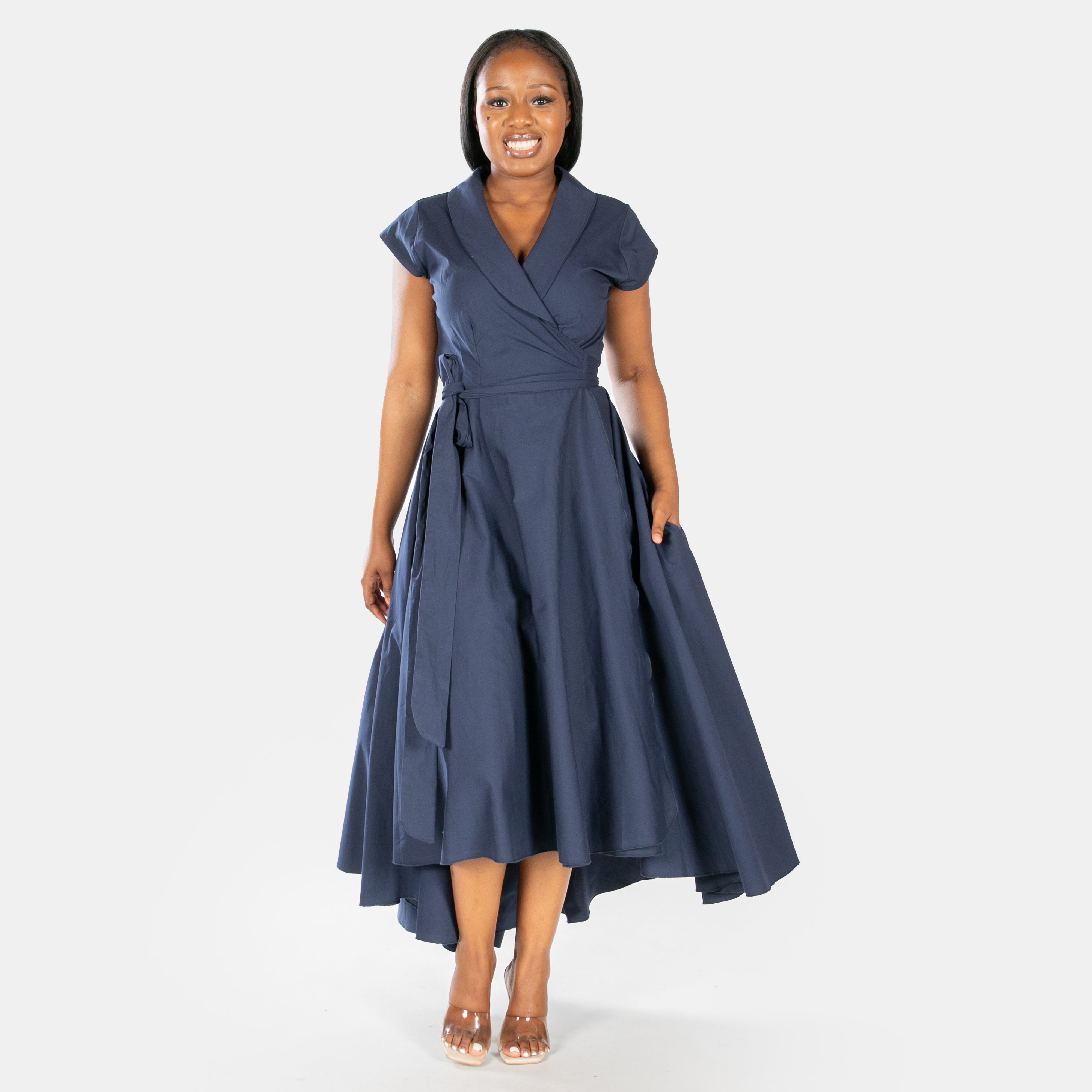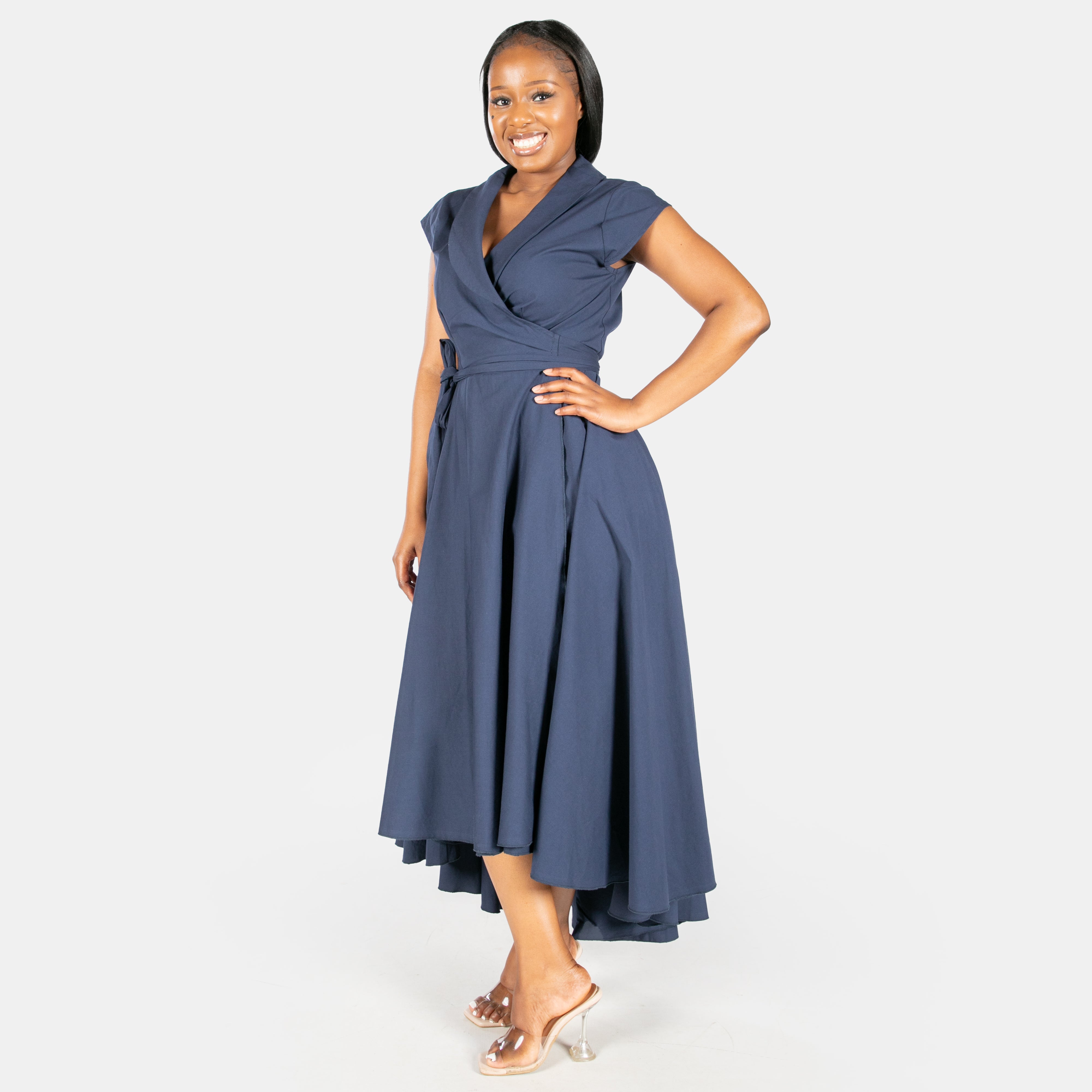 Inspired by the iconic Marilyn Monroe, this wrap dress has a longer length hem at the back.