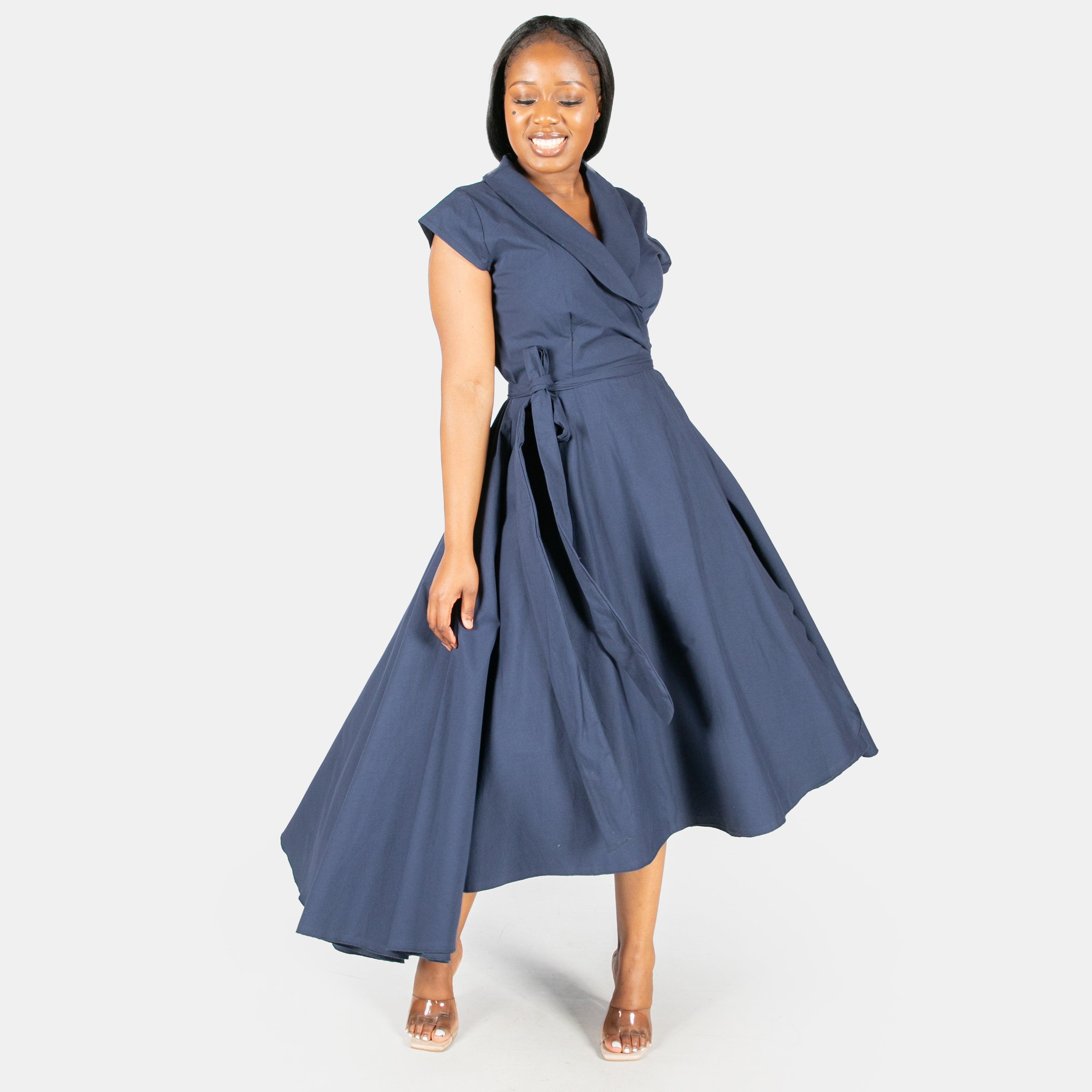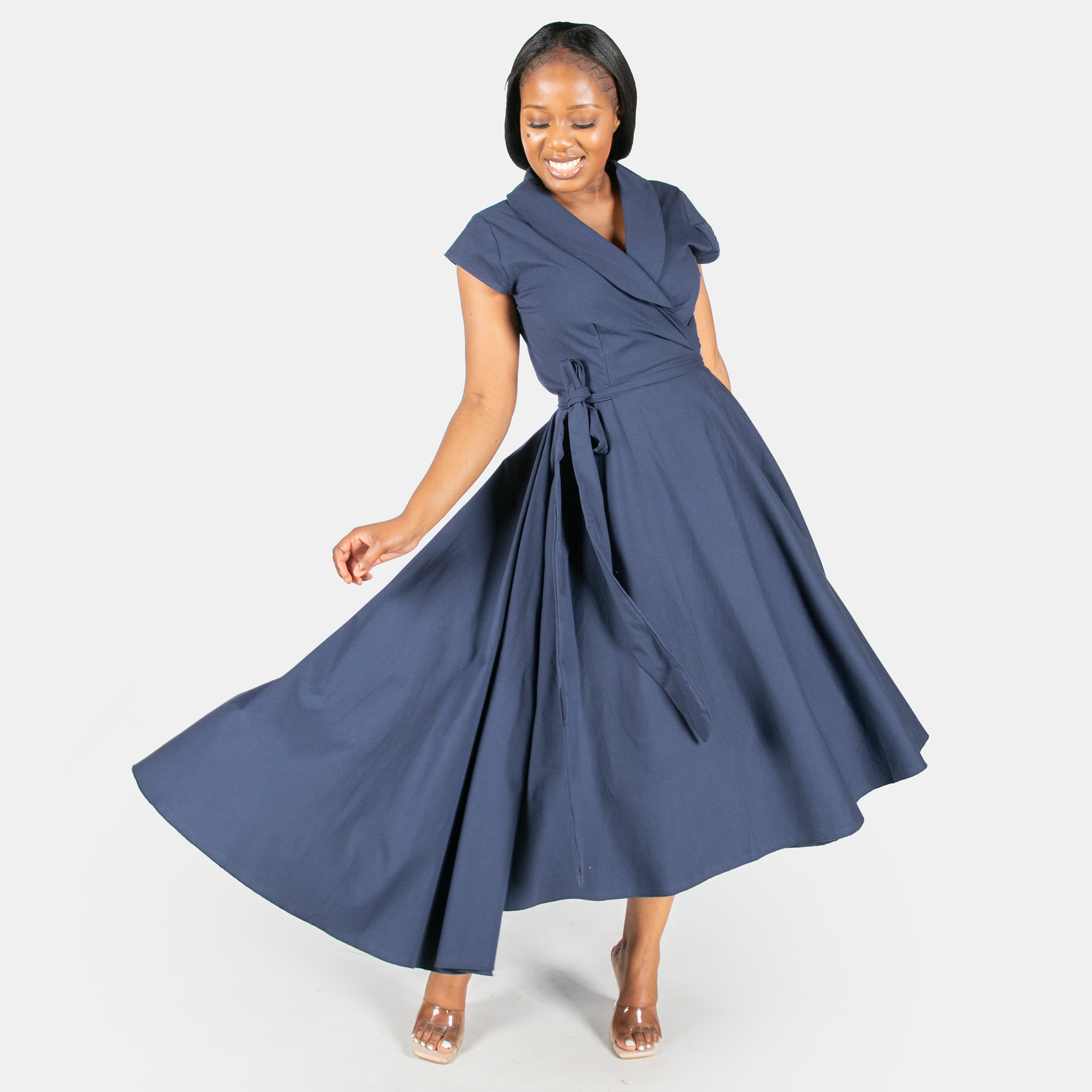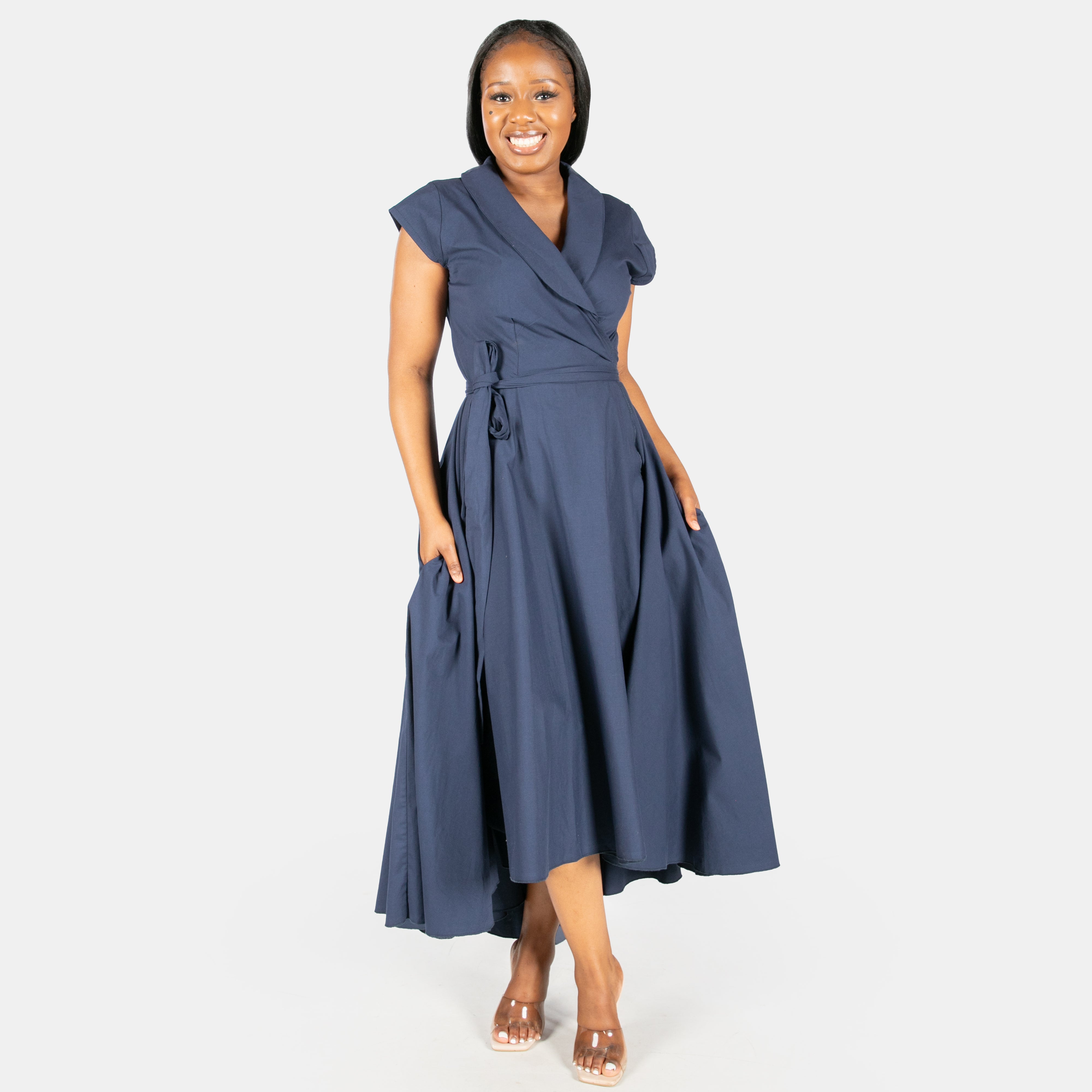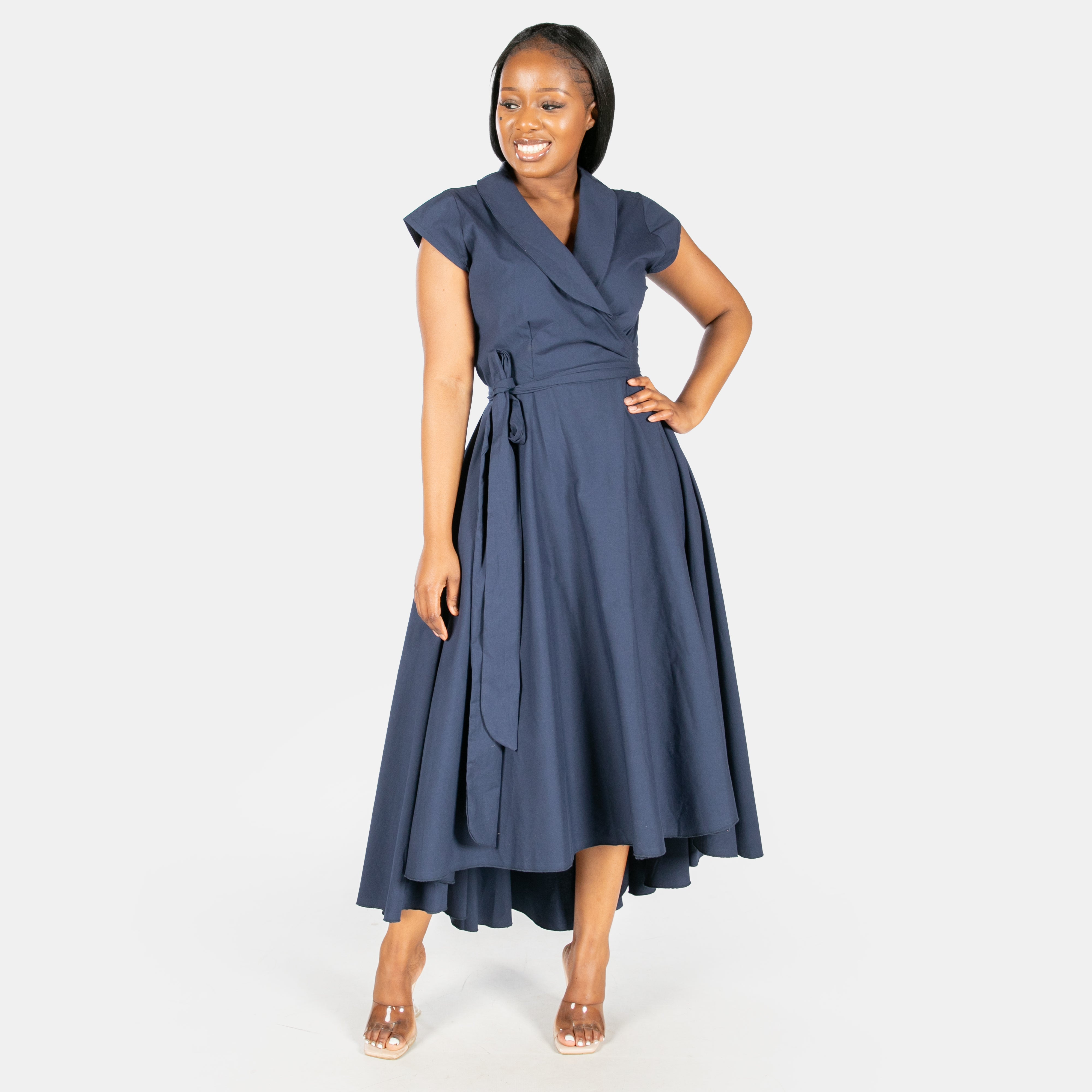 Inspired by the iconic Marilyn Monroe, this wrap dress has a longer length hem at the back.