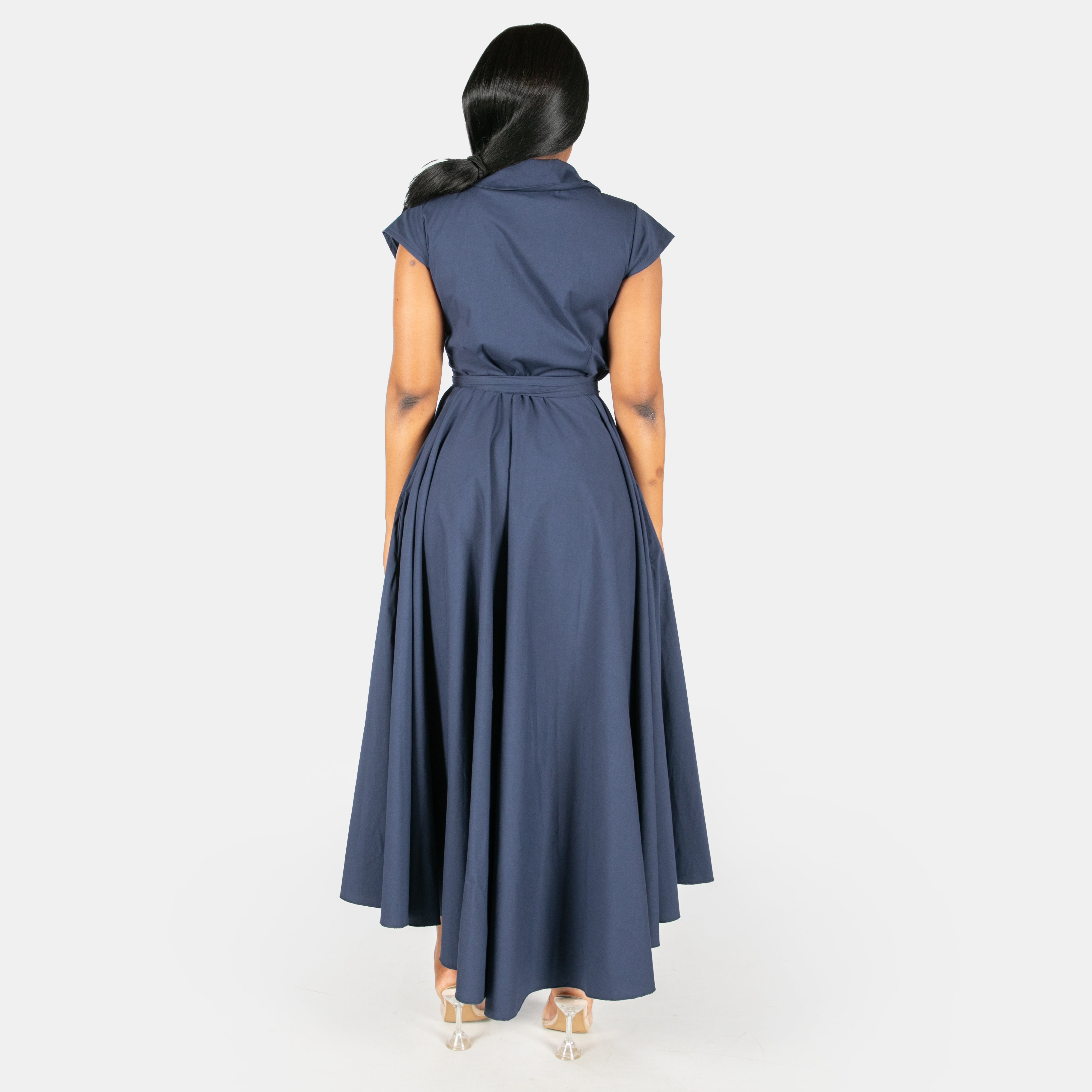 The bodice boasts a cross over design, has darts to ensure a great fit, a fold over collar and short cap sleeves.