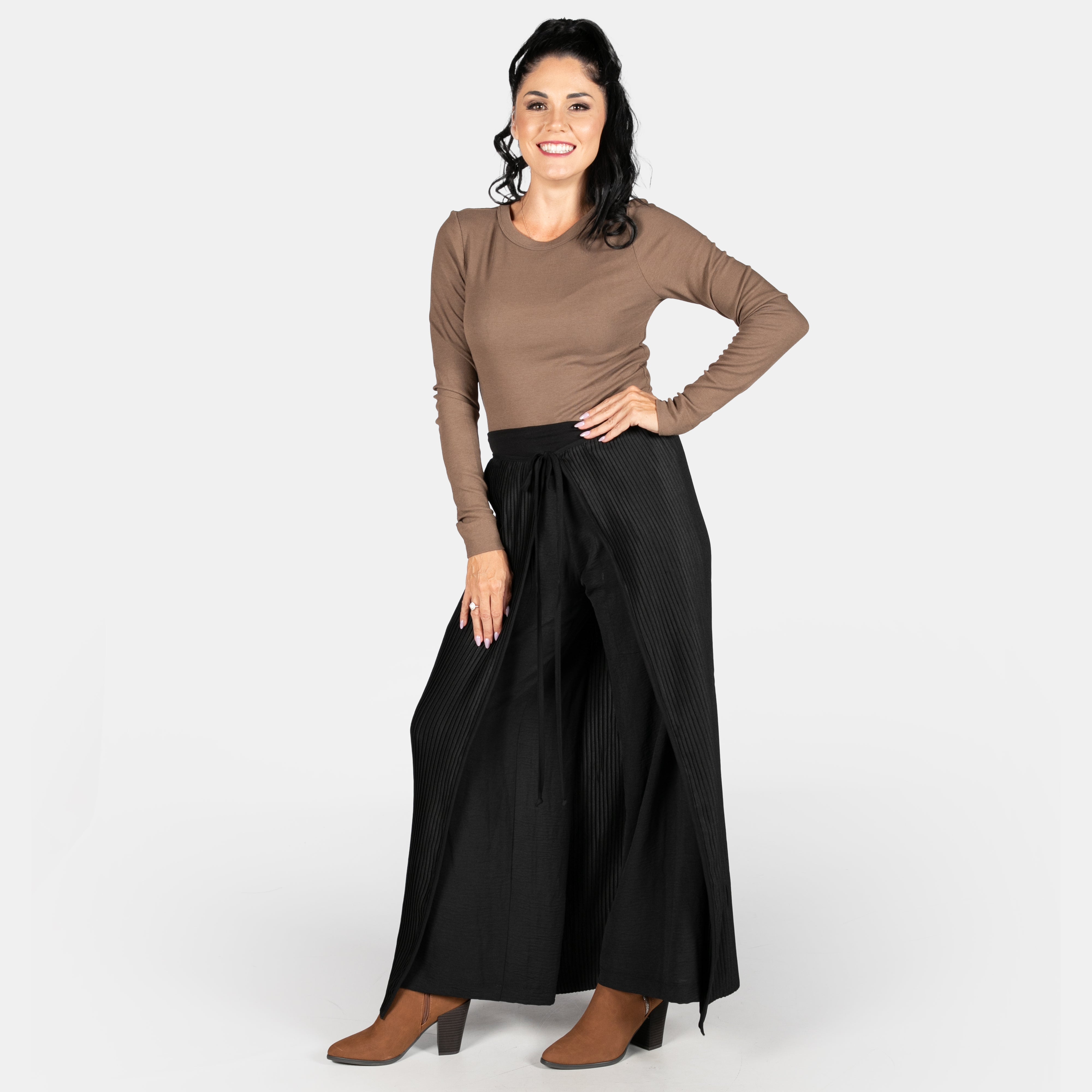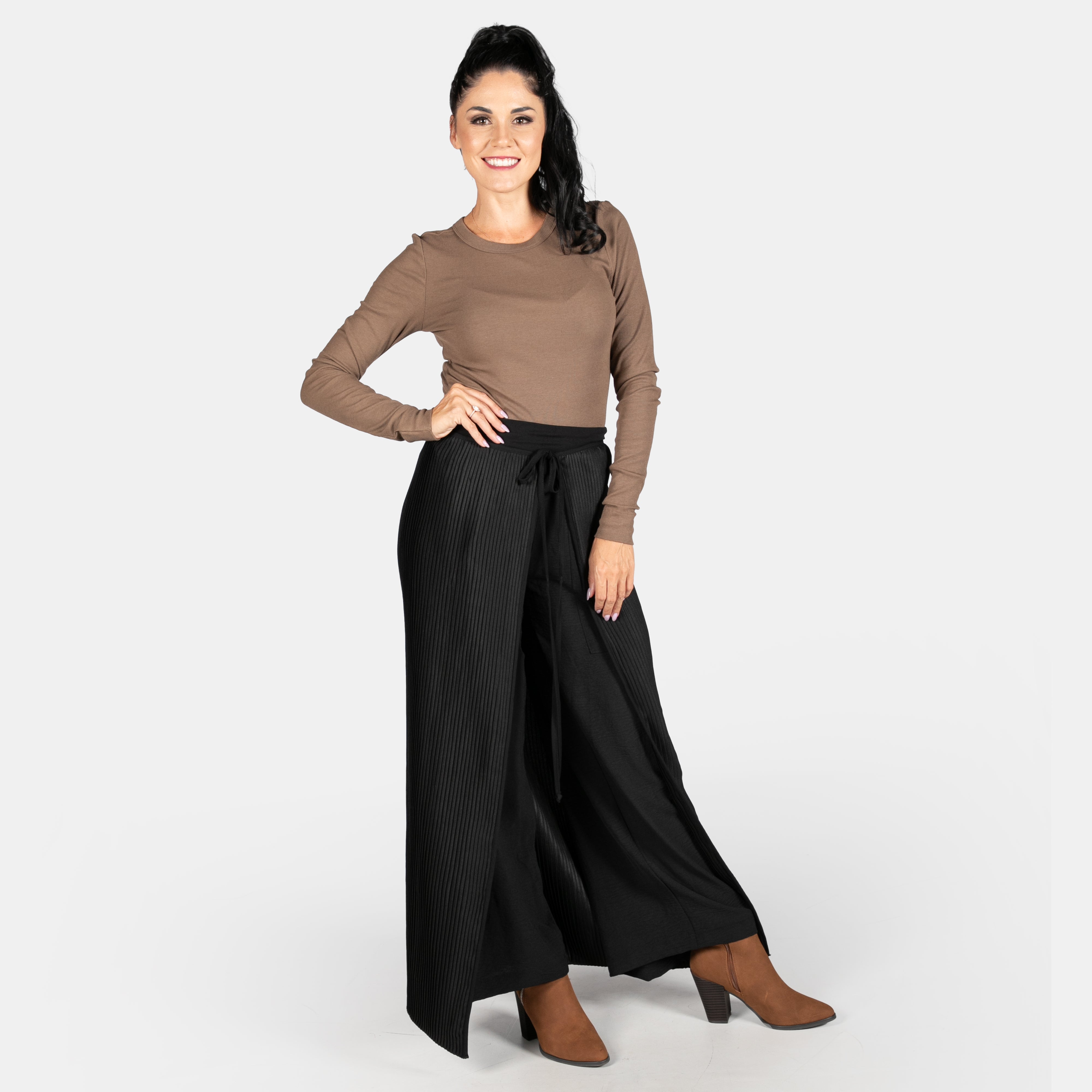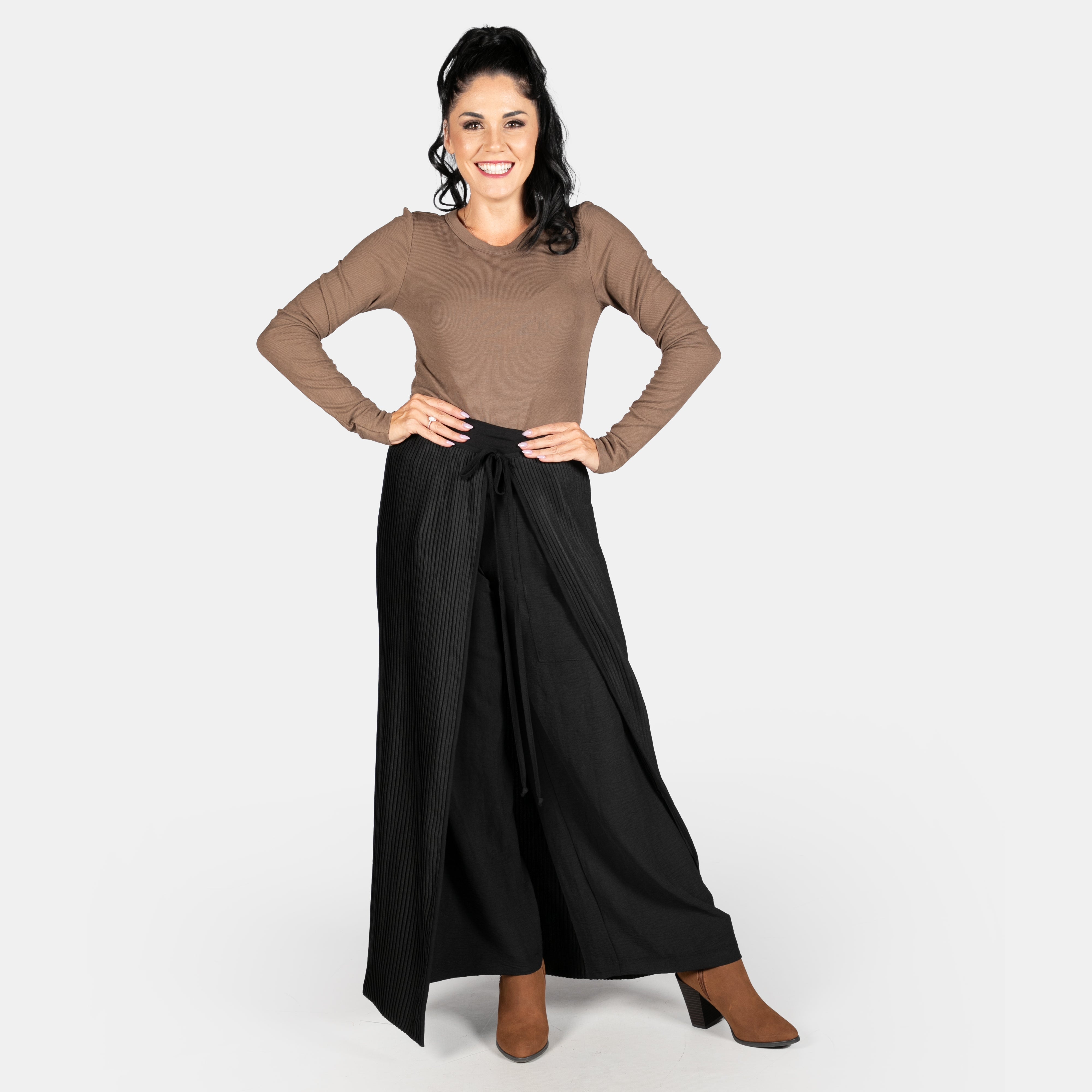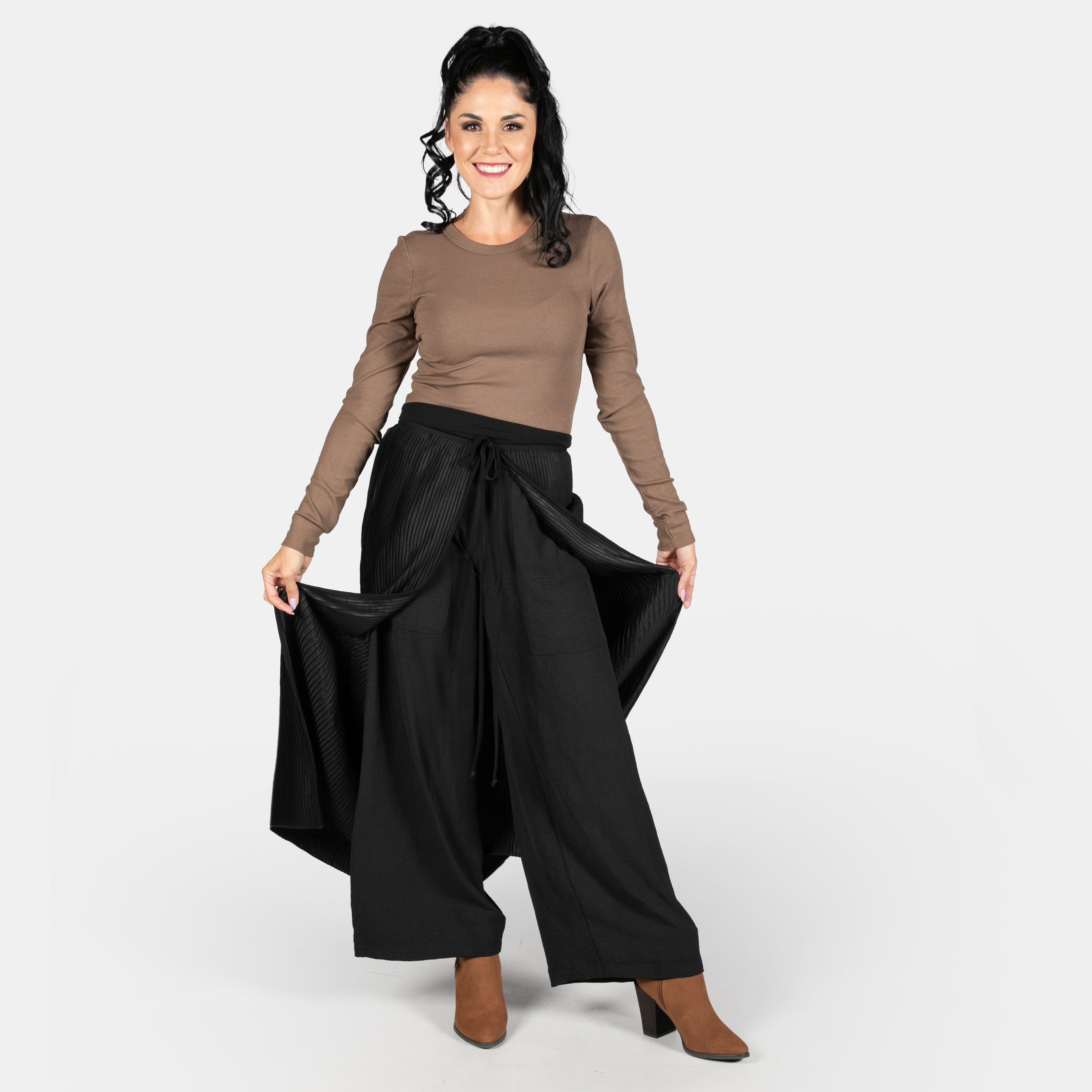 However, if you wear it with the opening to the side over the pants you have the silhouette of a long skirt with the comfort of trousers.