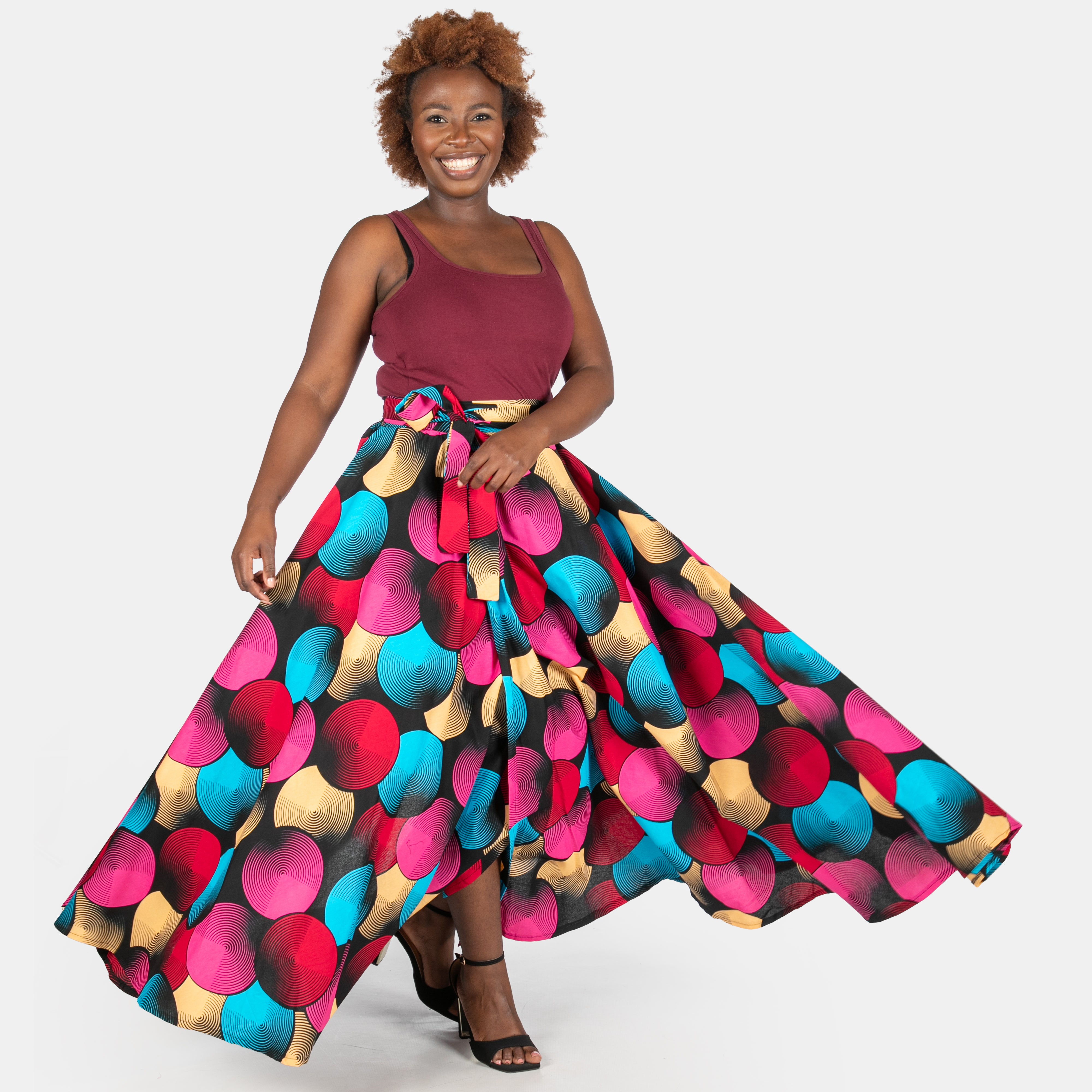 Bold circles with a hint of proud heritage in this full circle wrap skirt!