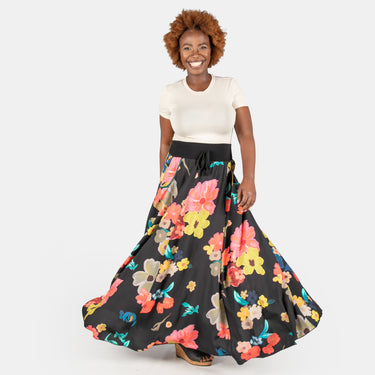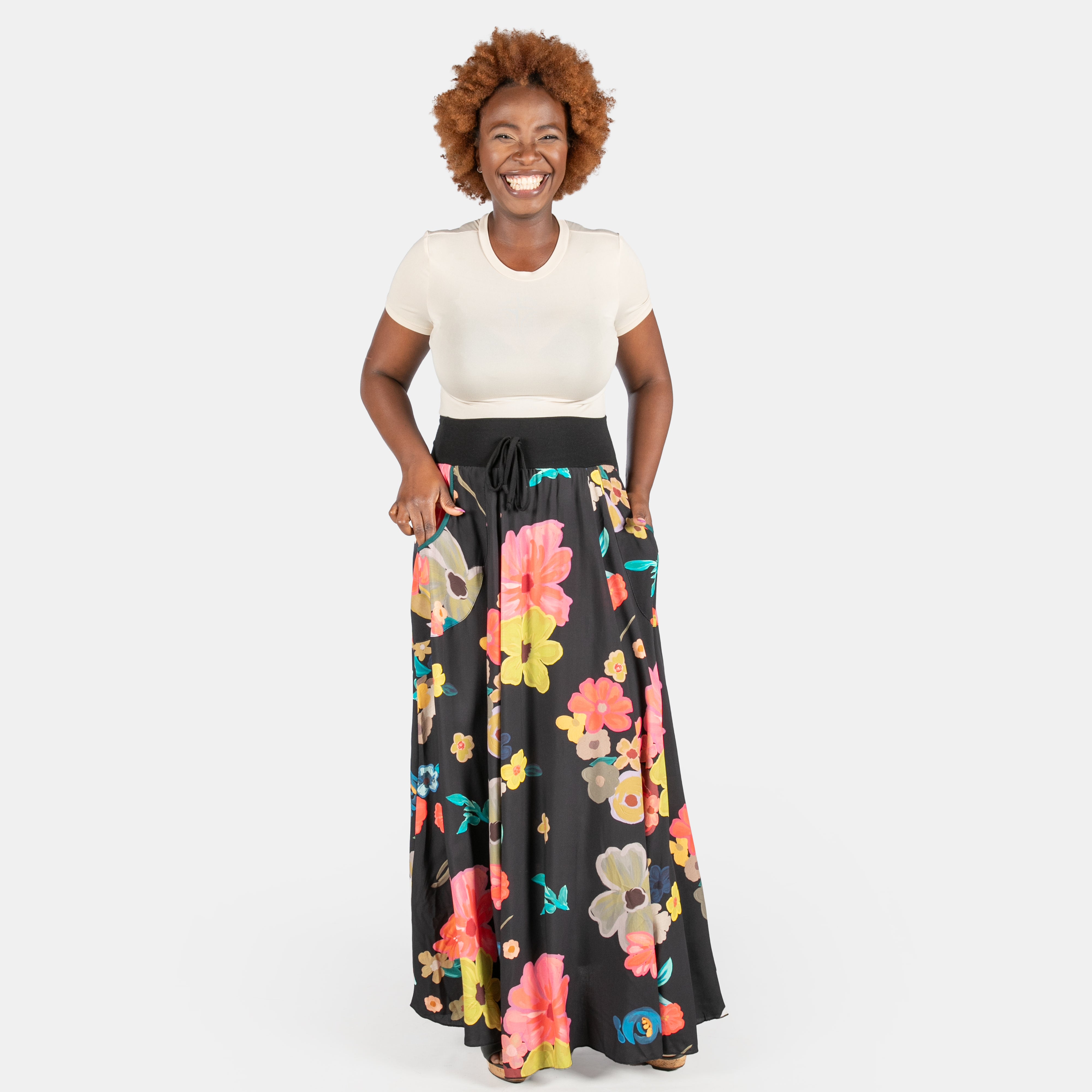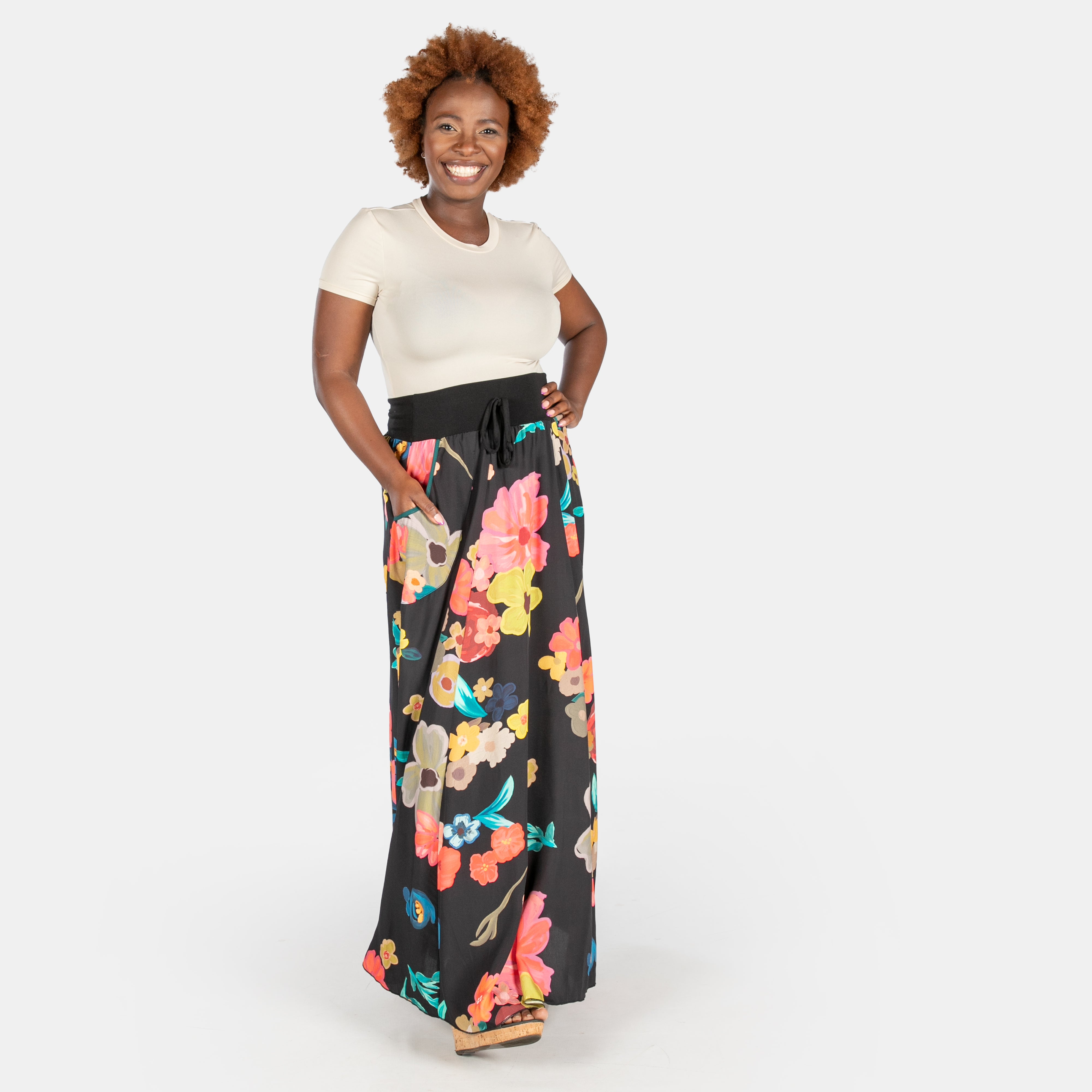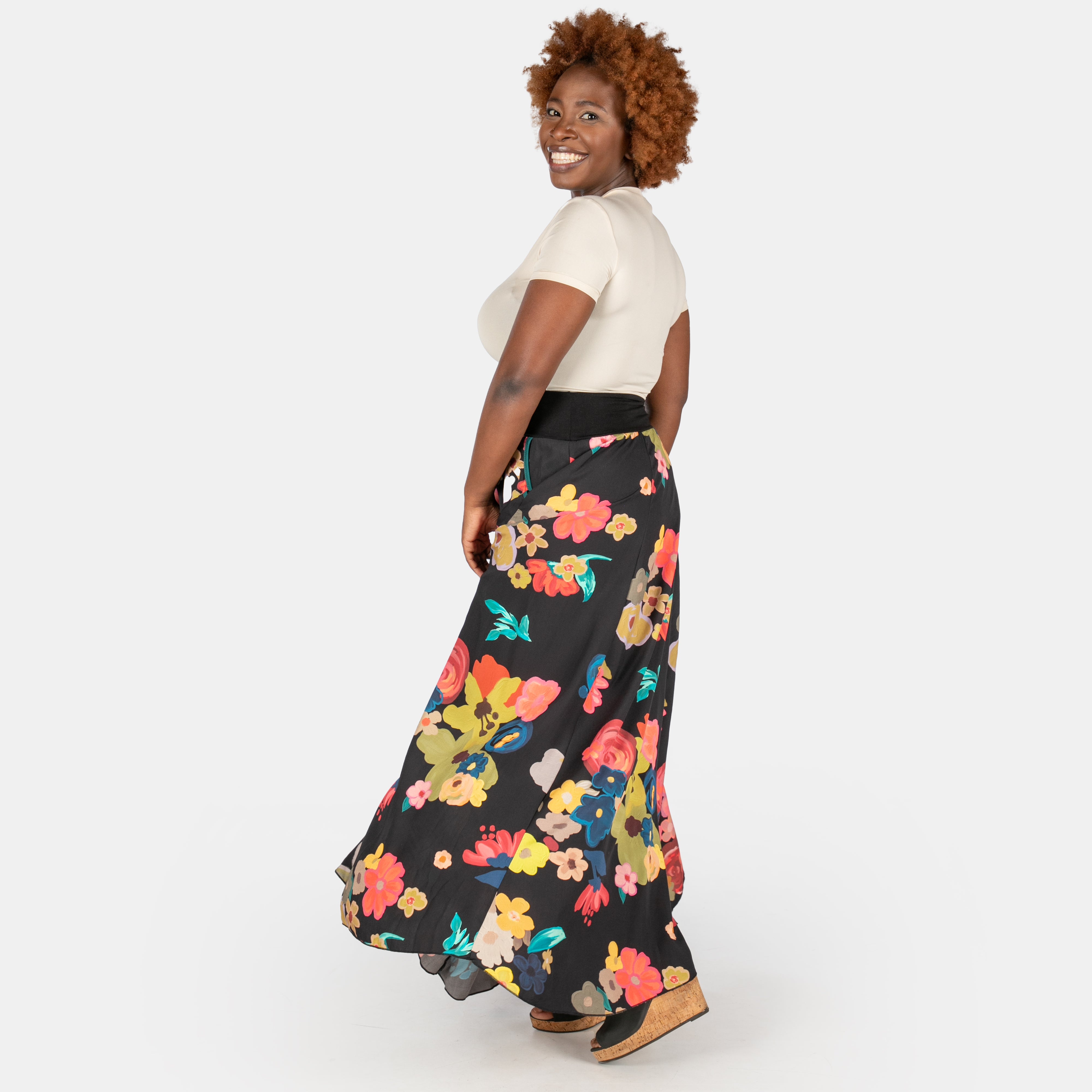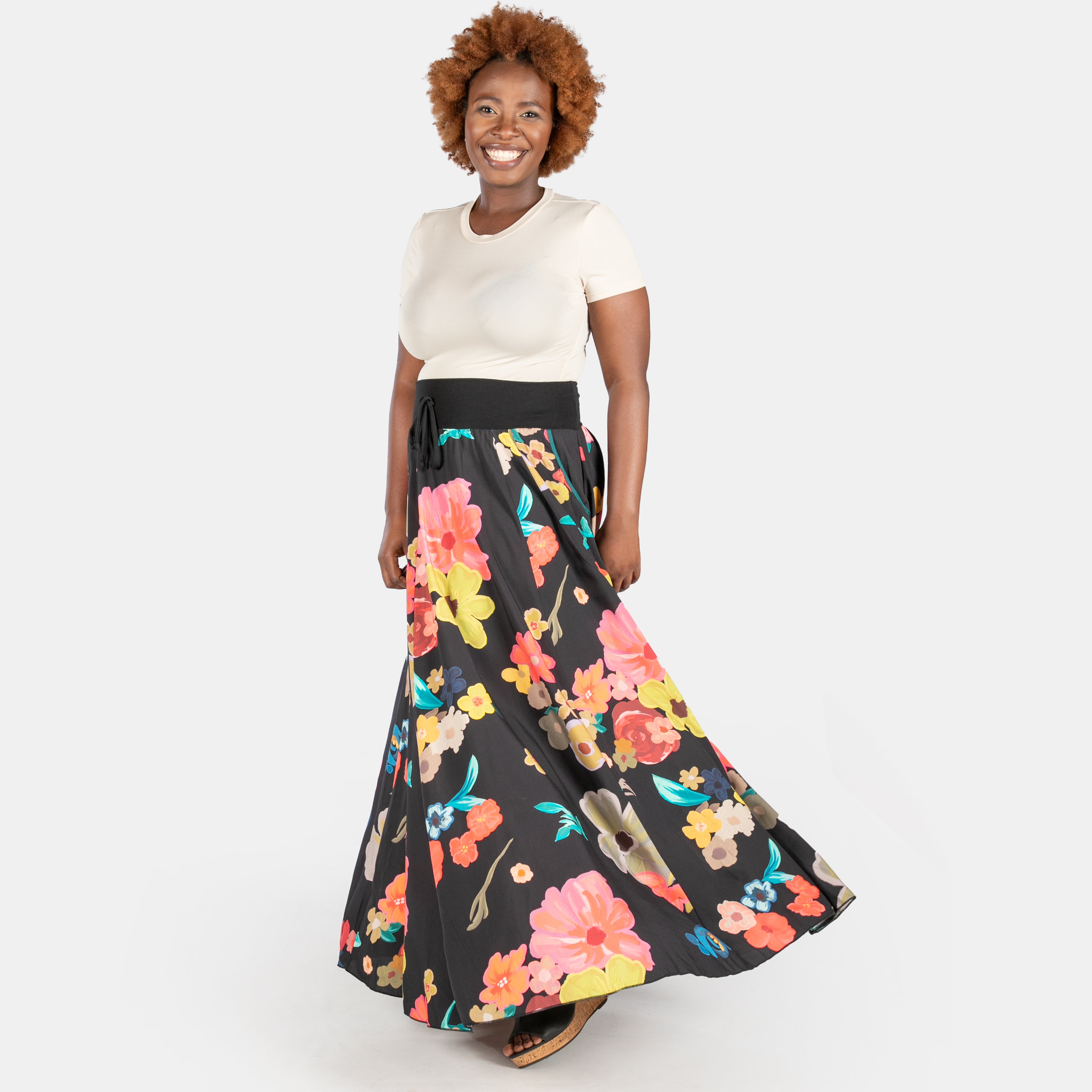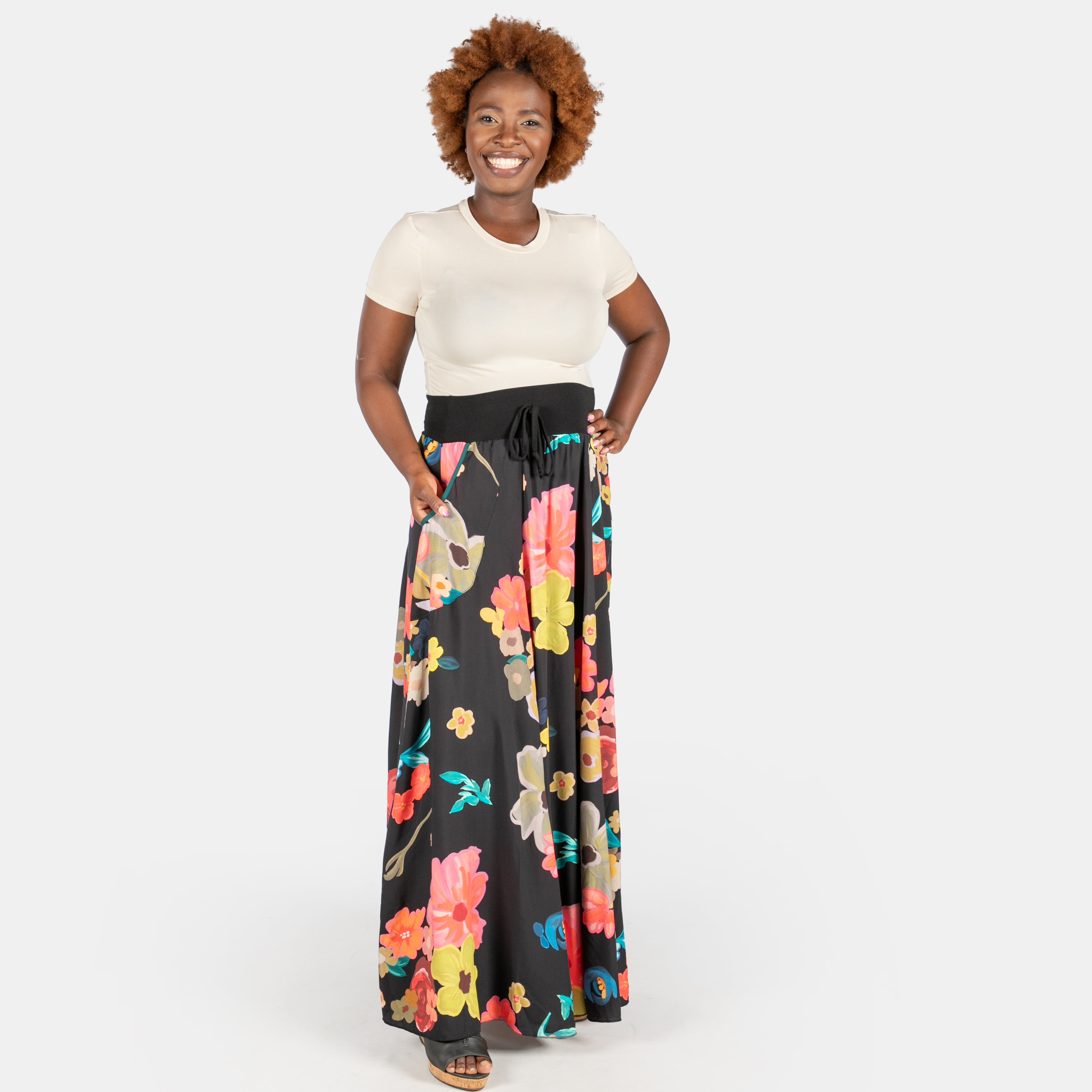 The pretty floral print fabric with the black binding on the hem and waistband are what make the statement here.