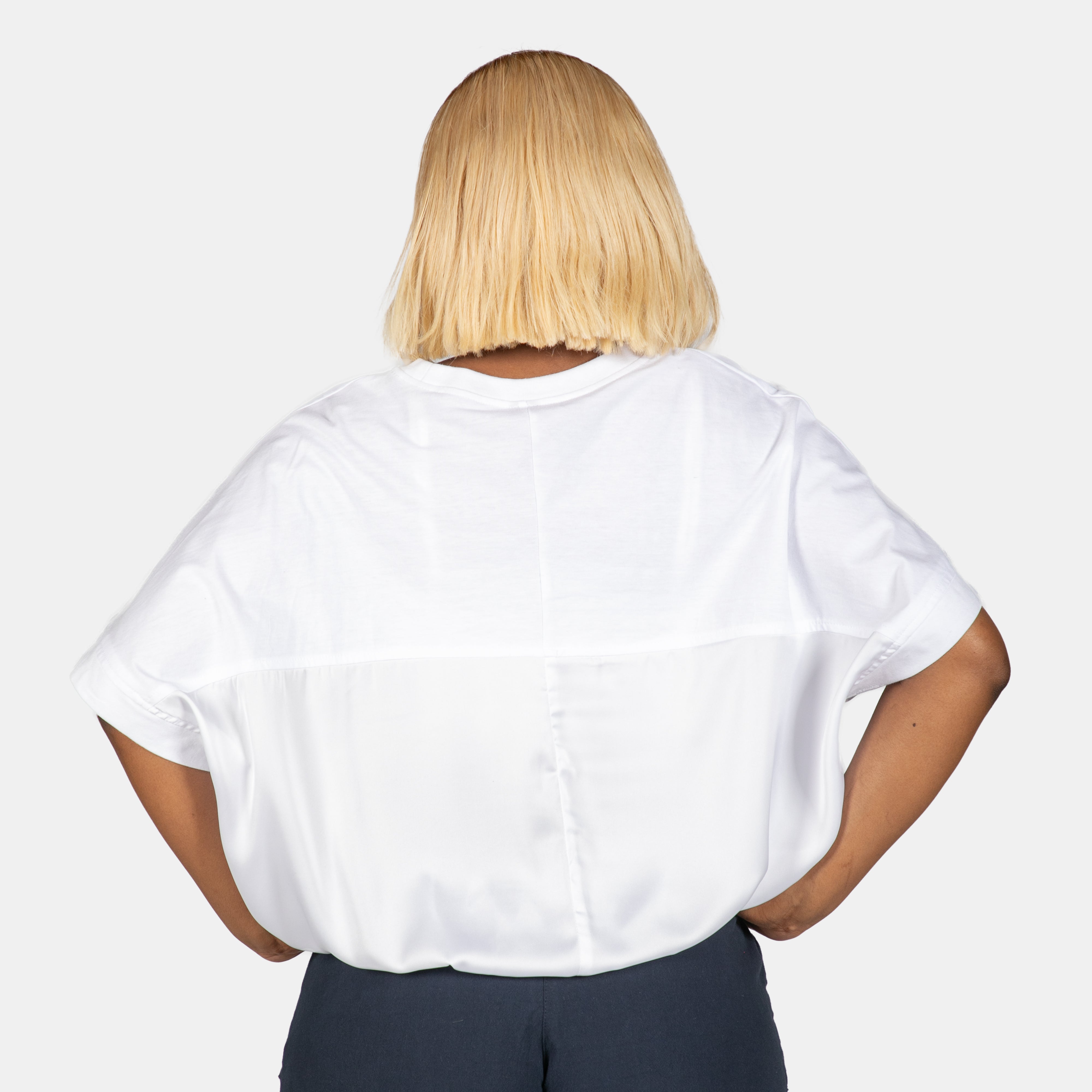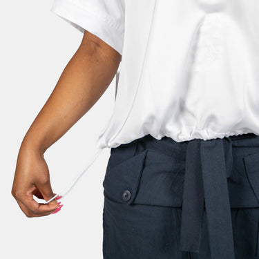 This boxy top features generous short sleeves, a round crew neck and a flattering concave seam across the front. The defining feature is the elasticated and adjustable waistband. Looks great with all bottoms and because it's white it goes with absolutely everything.