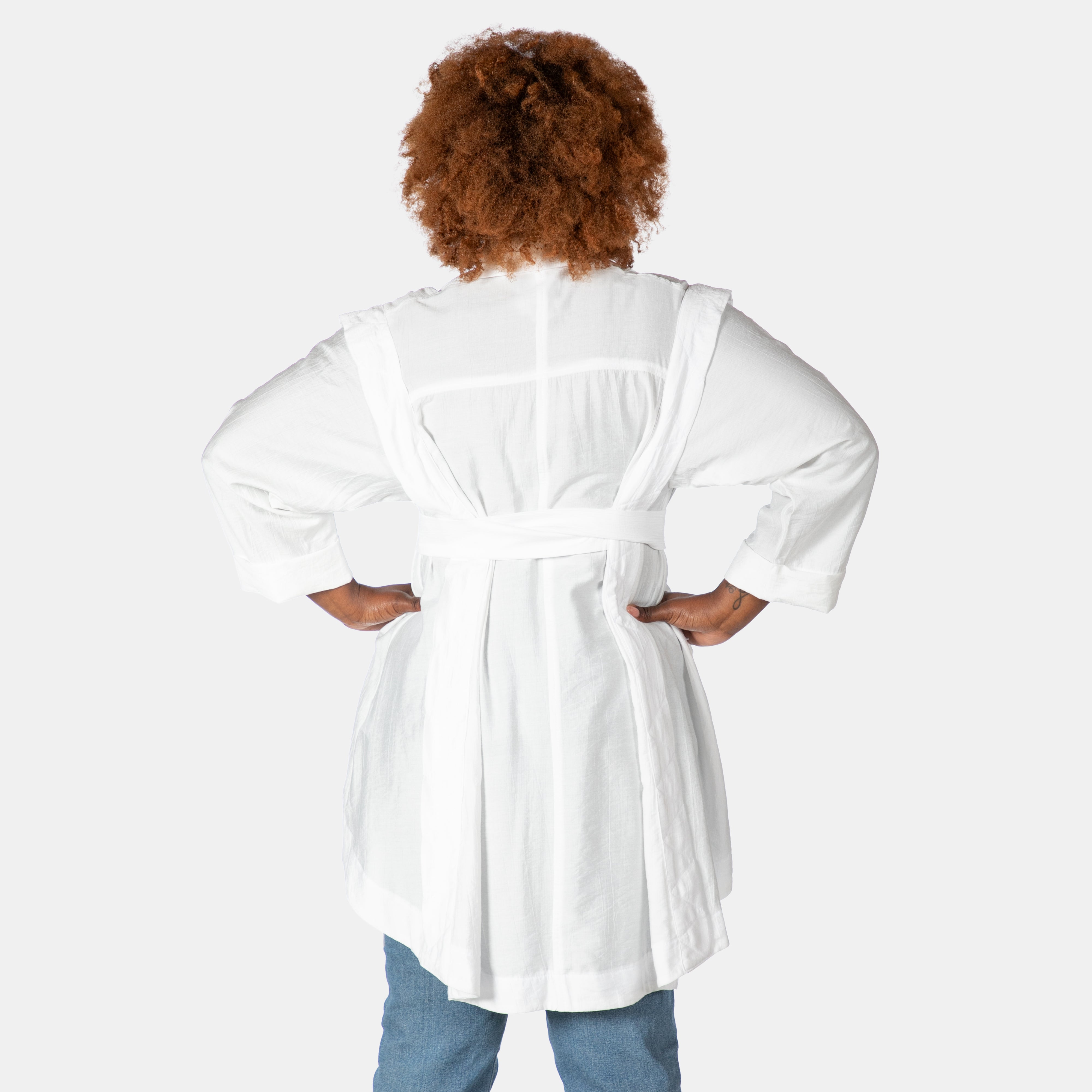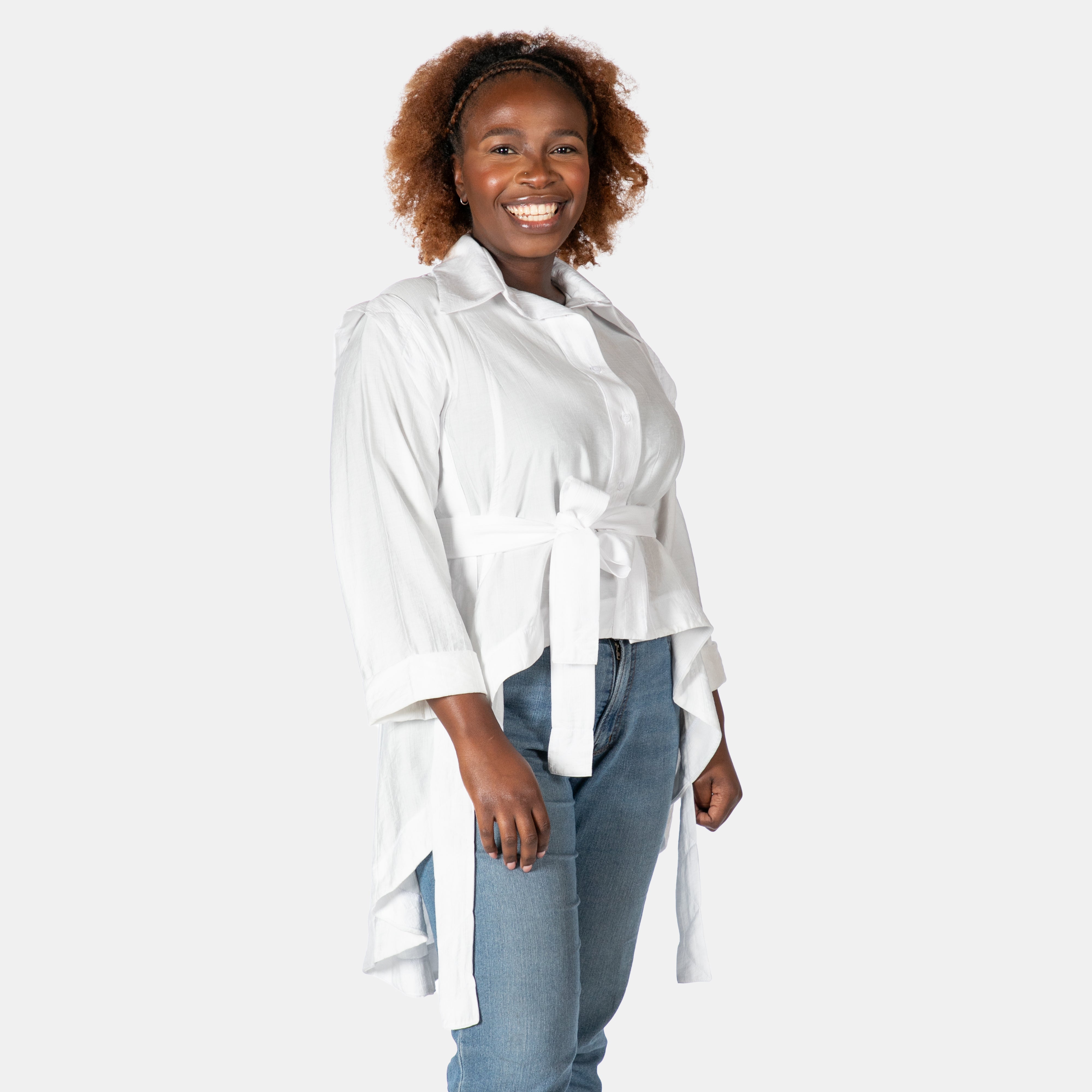 Styled with three-quarter sleeves, a sharp collar, and front button closure, this piece features a clever asymmetrical cut that's cropped at the front and flows to mid-thigh at the back.