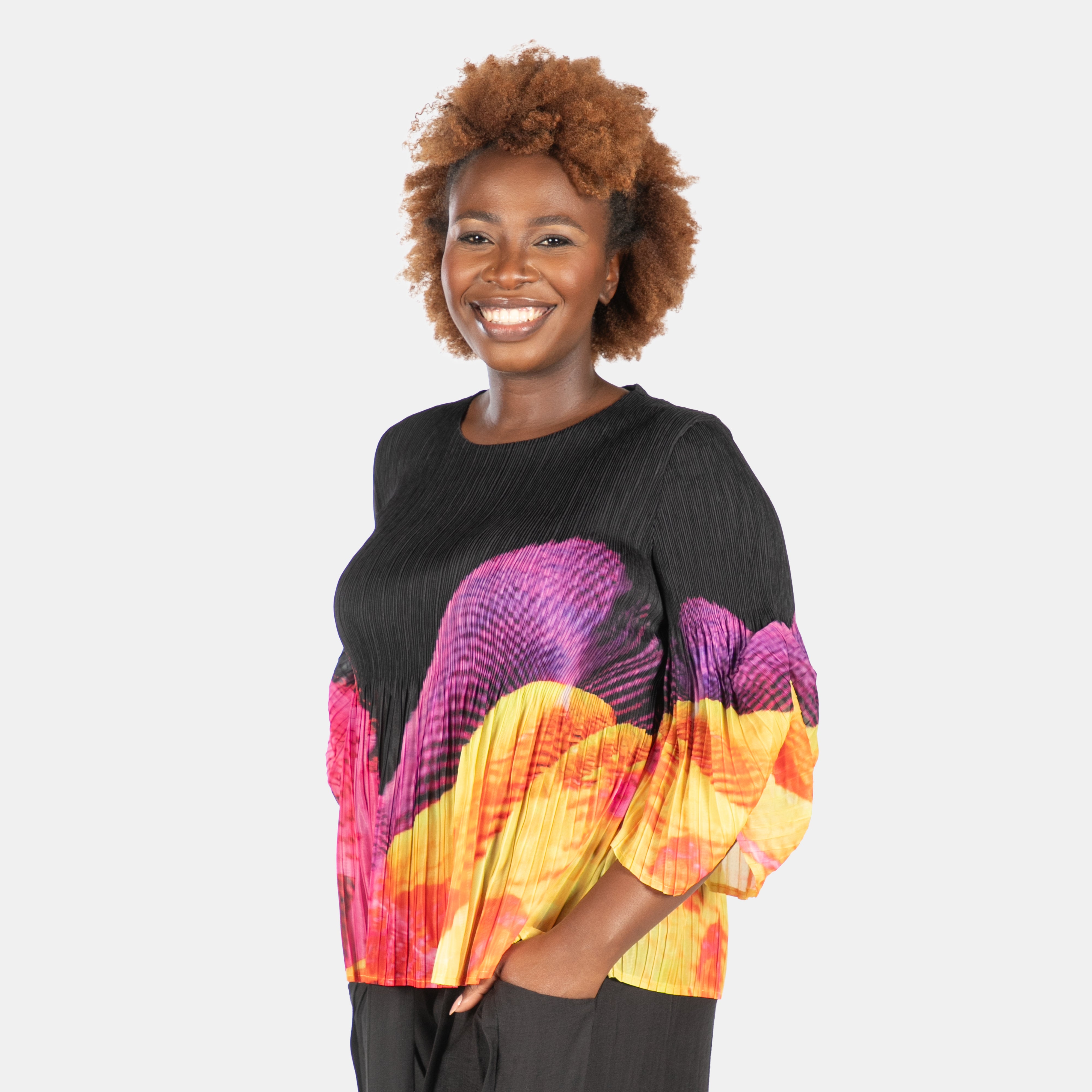 This one-size wonder features luxurious permanent pleat polyester that bounces back with every move, paired with the  jewel-tone hues against the black that demand attention.