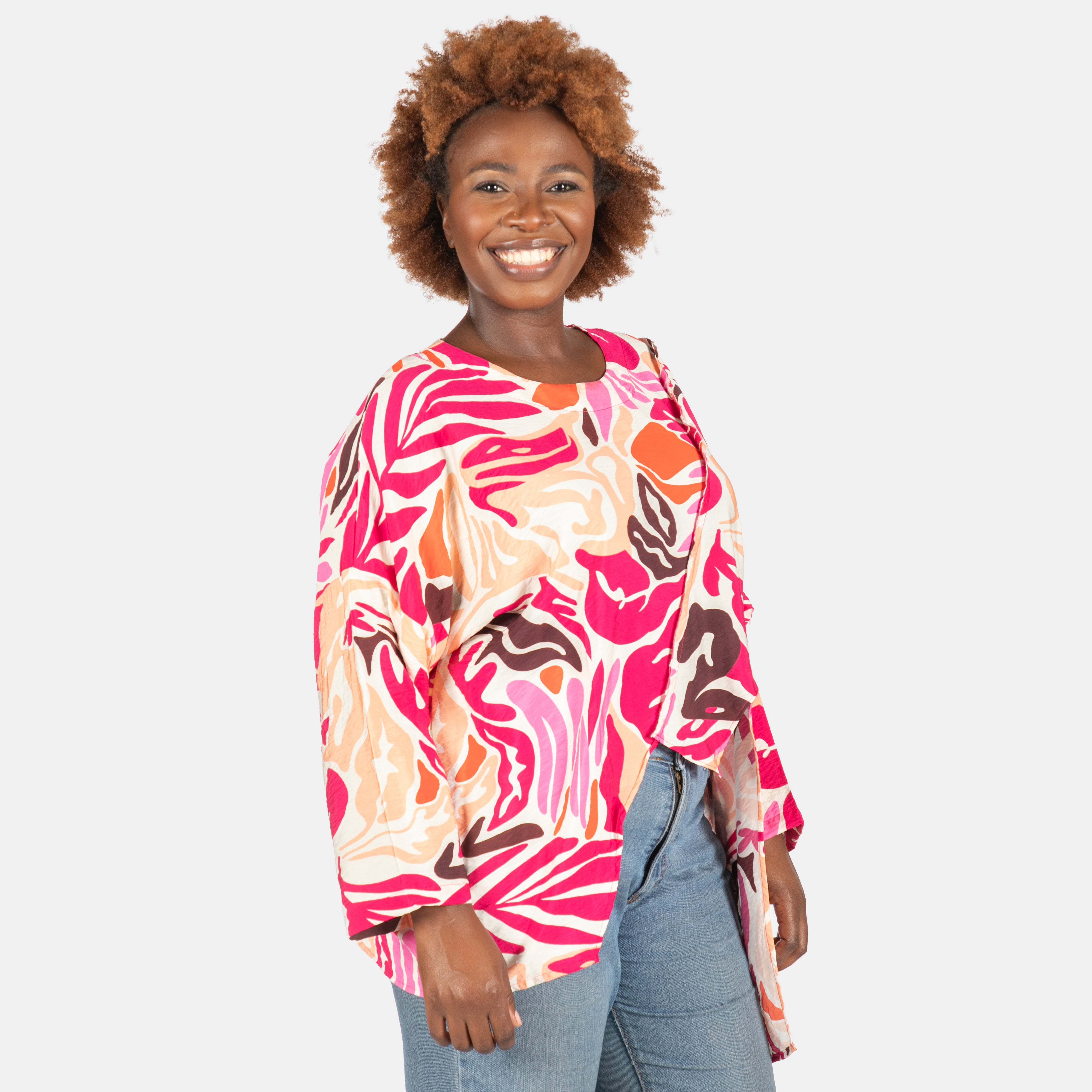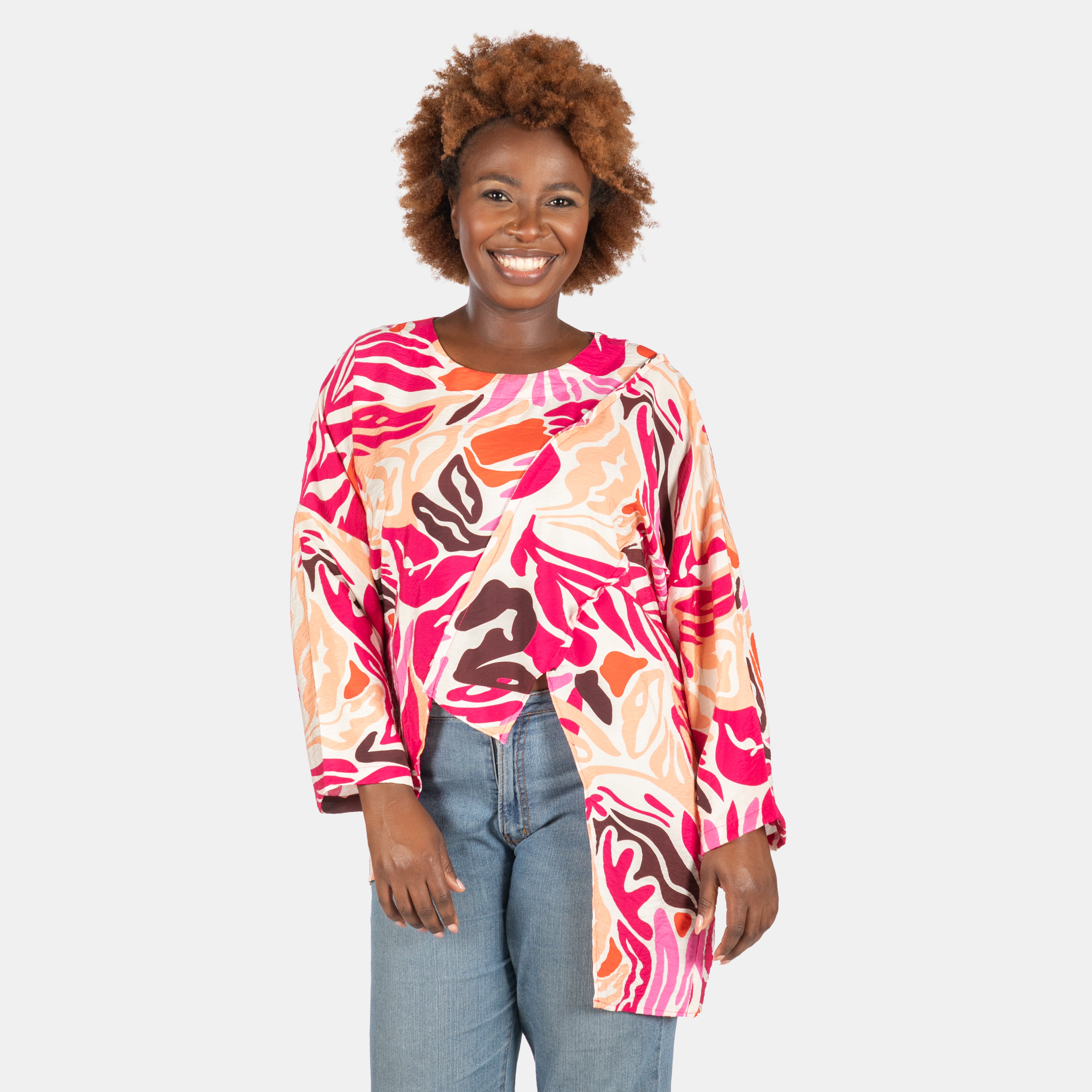 The Vesta showcases a playful mix of diagonal strips creating the body of the top and an edgy jagged hem with extended side panels that flatter your silhouette.
