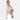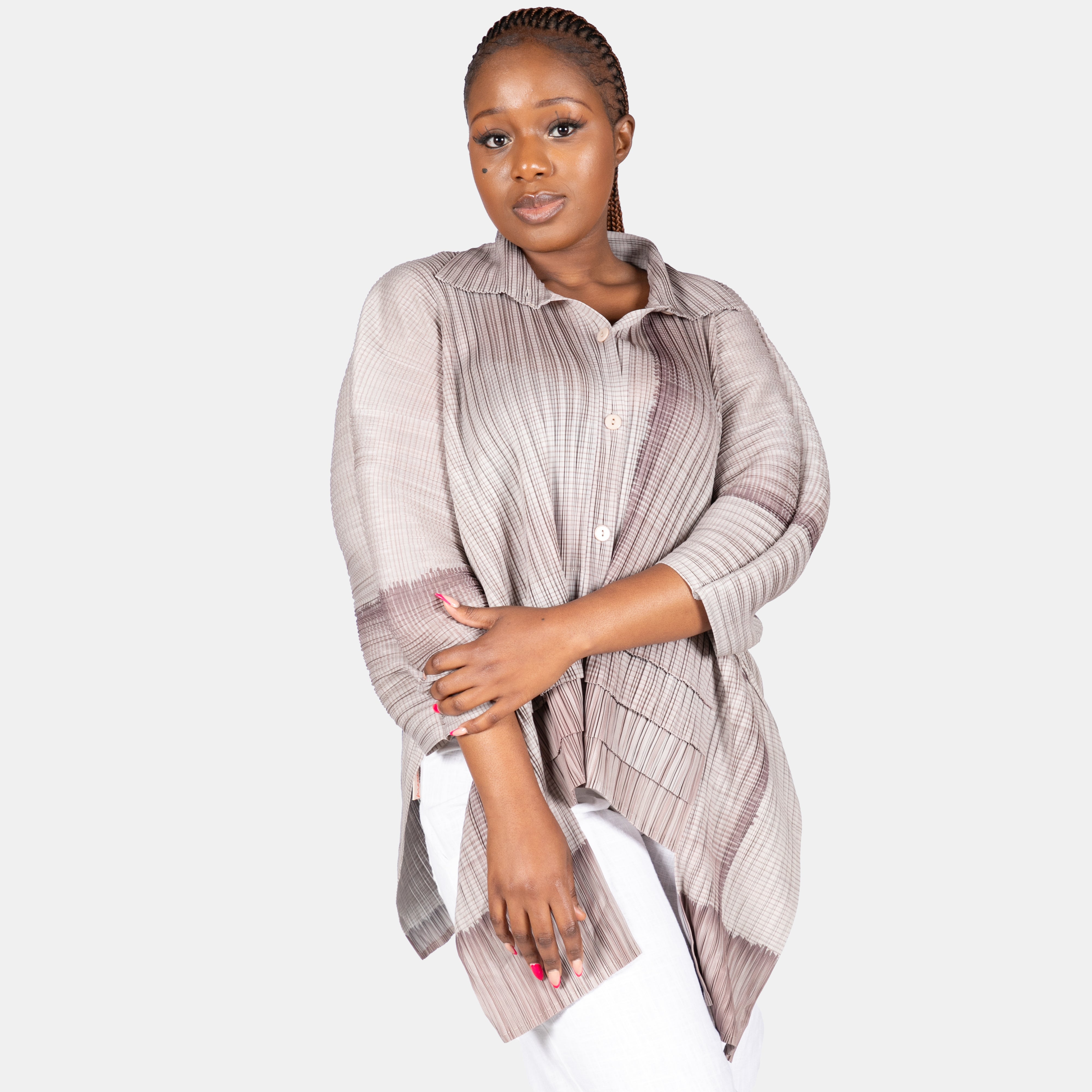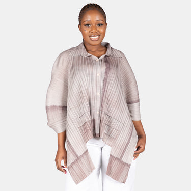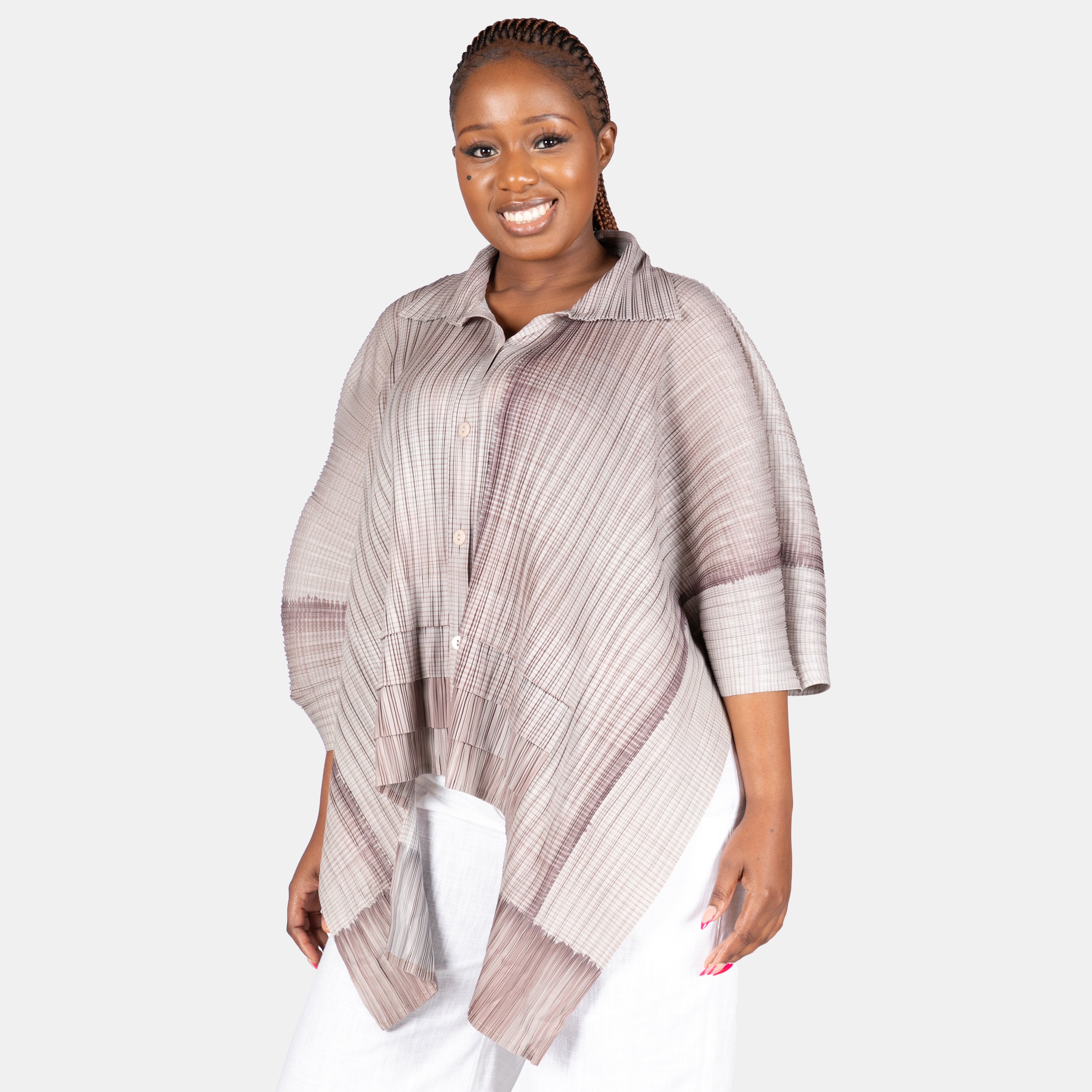 She boasts a full collar and front button up placket, 3/4 sleeves and a pleated cut out in front, making the front hem shorter.