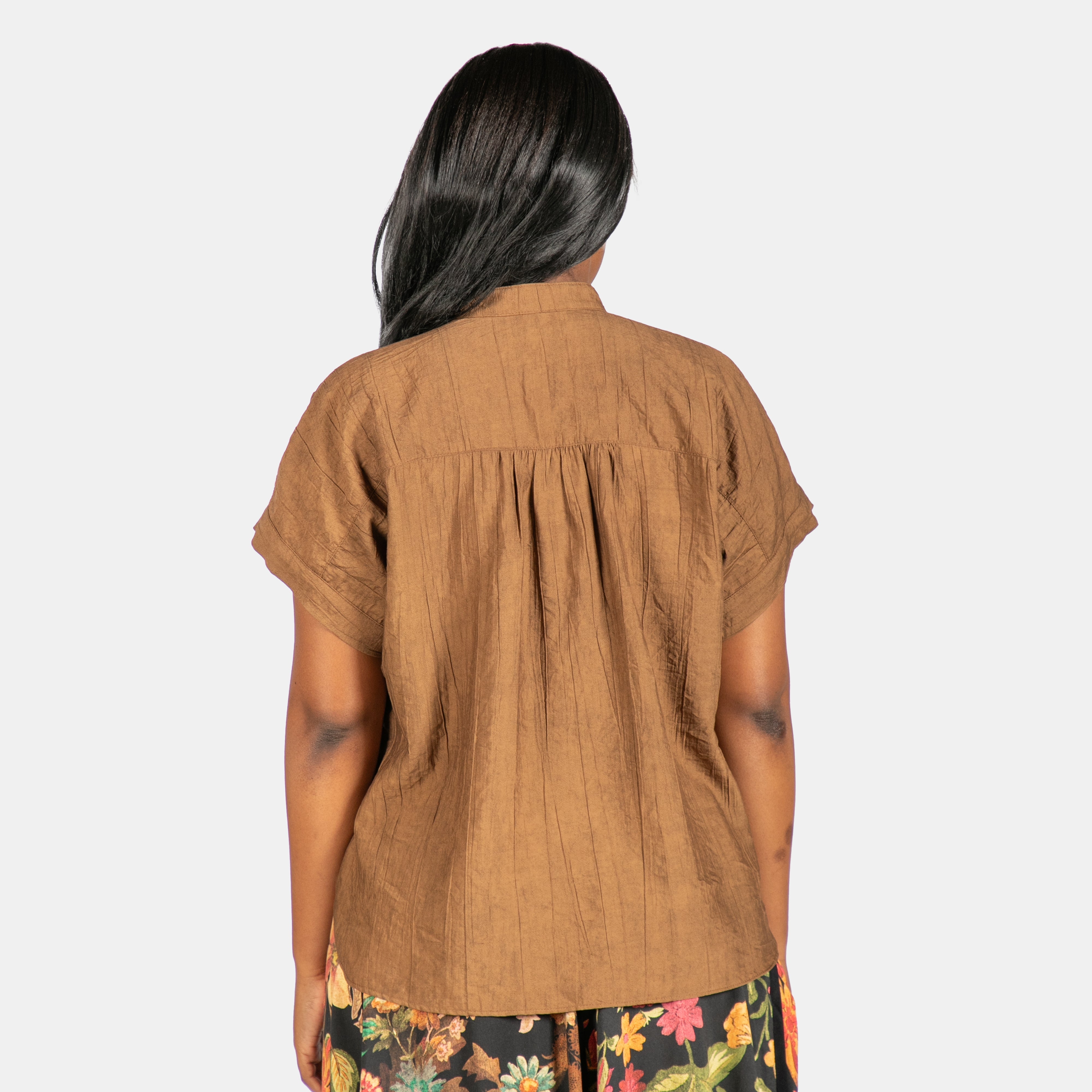 The short sleeves are wide and have gentle gathers along the yoke in the front and the back.
