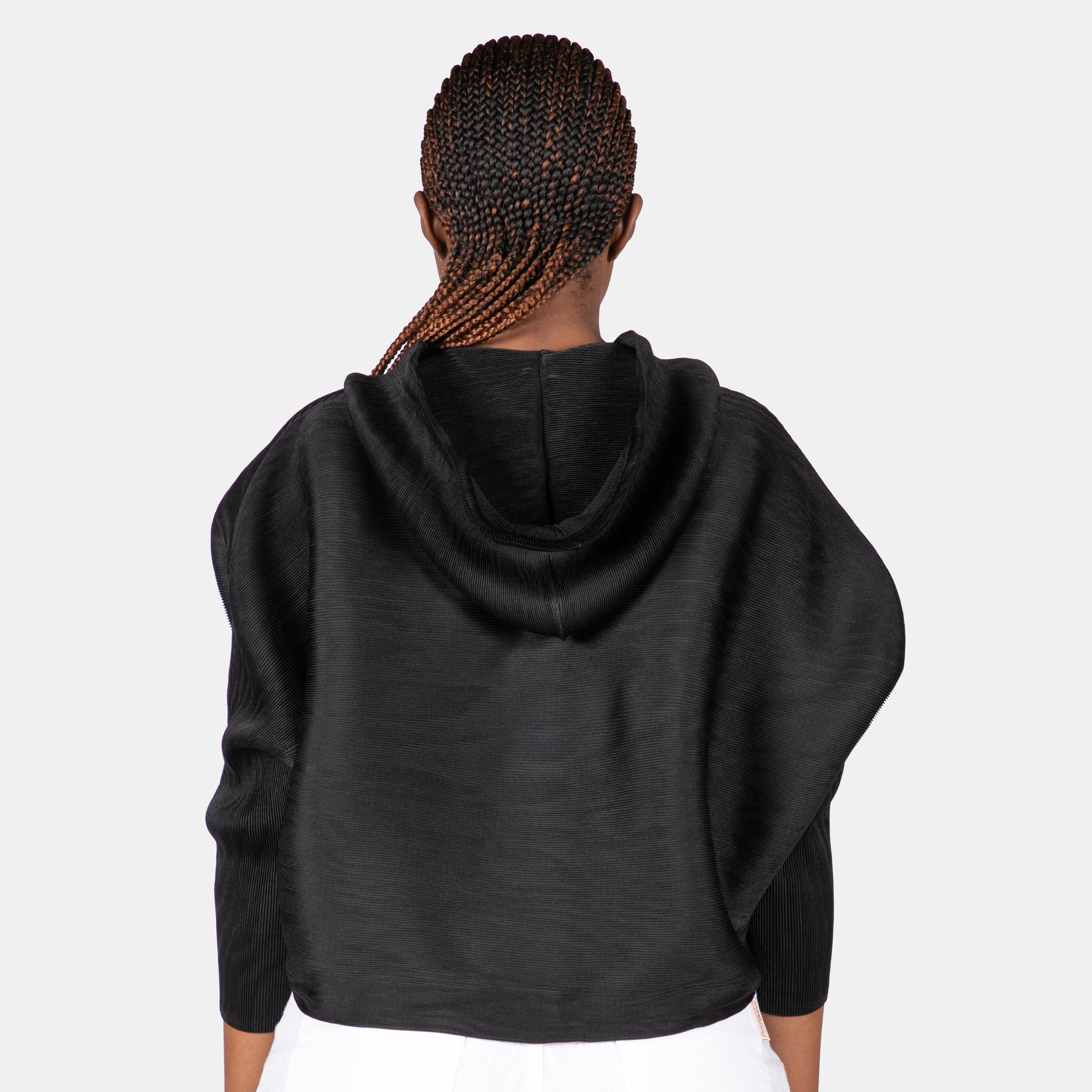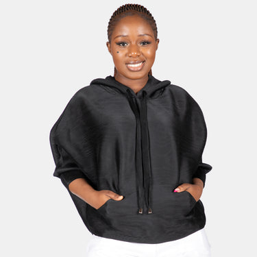 This cropped top is crafted in a textured fabric, has long sleeves and a drawstring hoody.