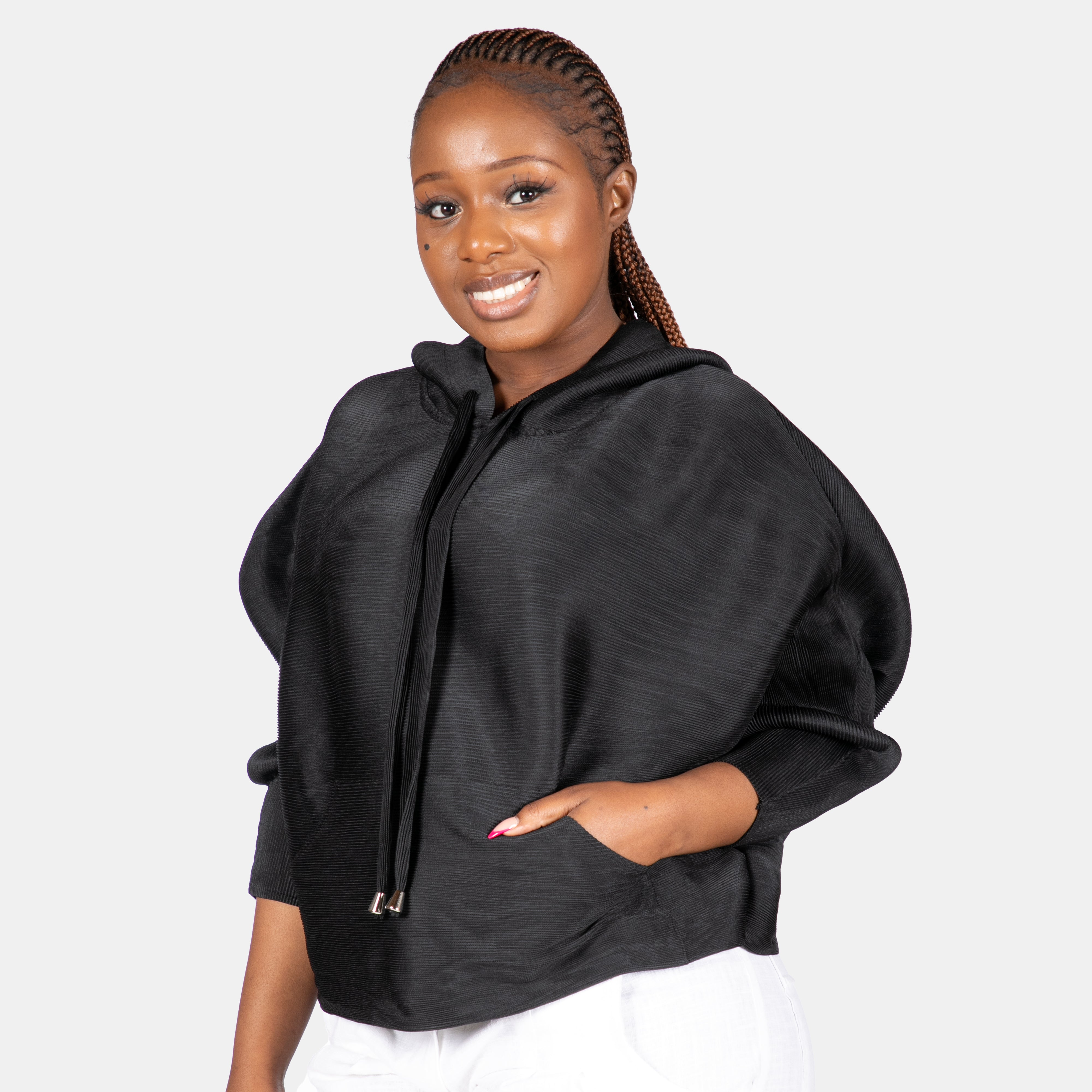 You will notice the hem is shaped with curves on the sides and there is a kangaroo pouch too.