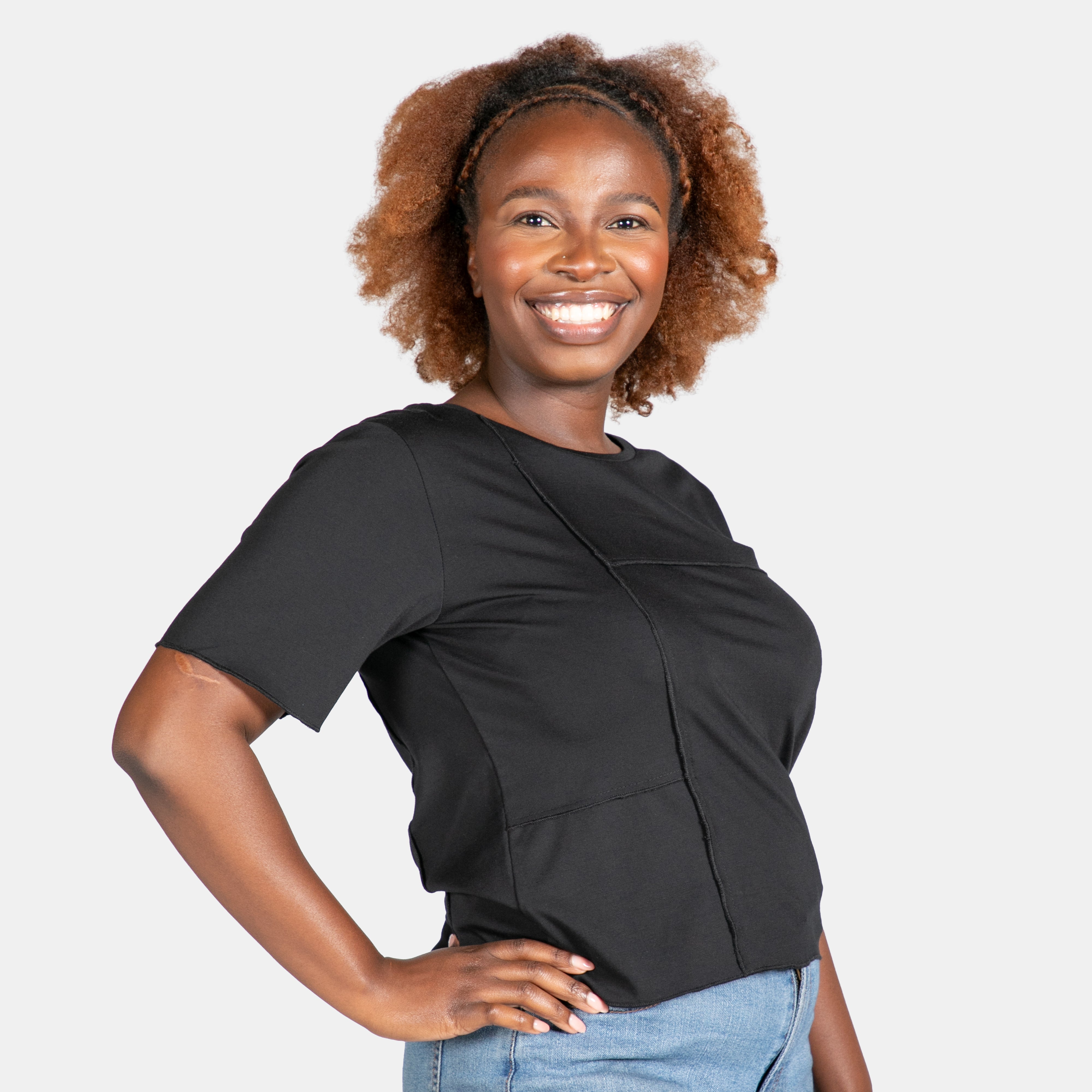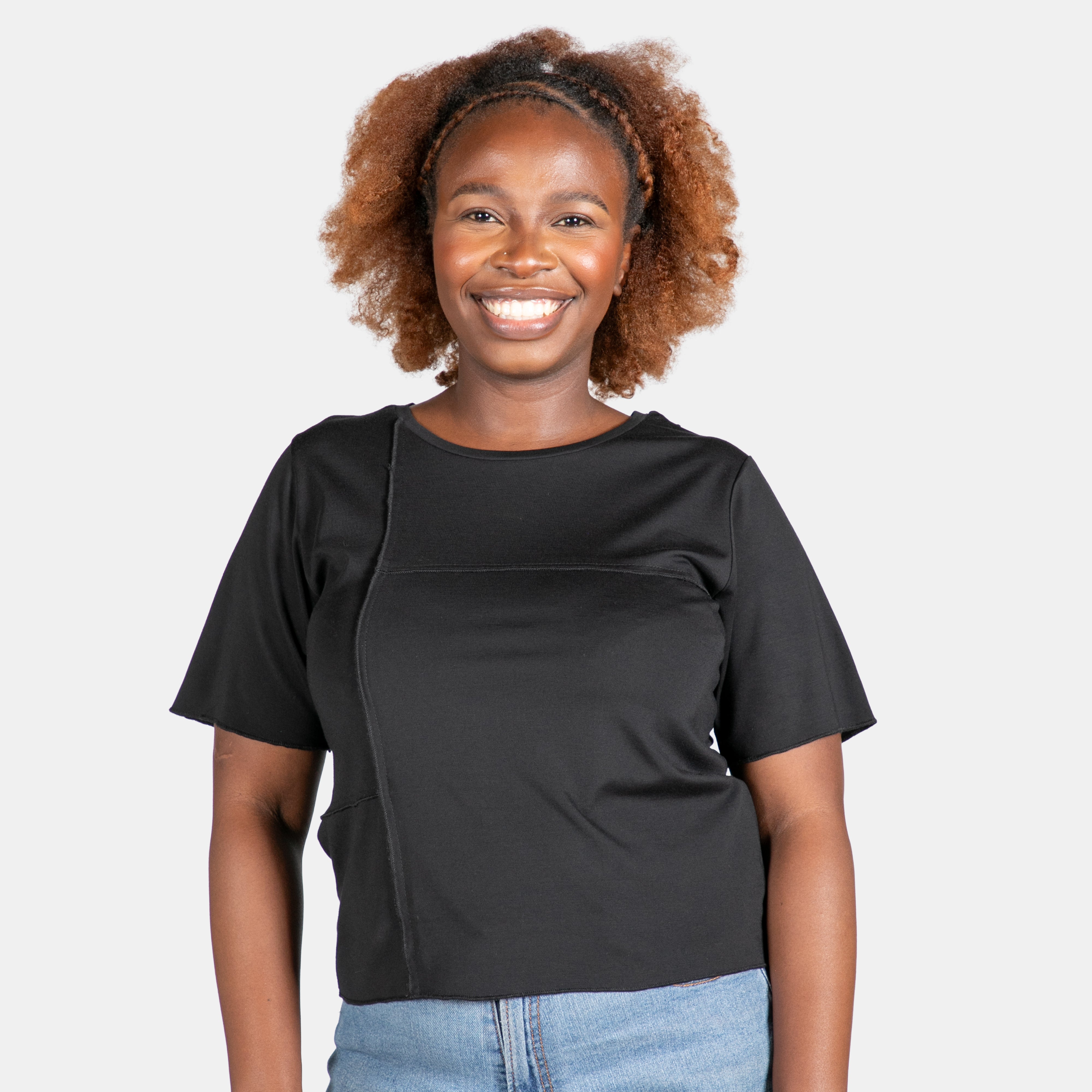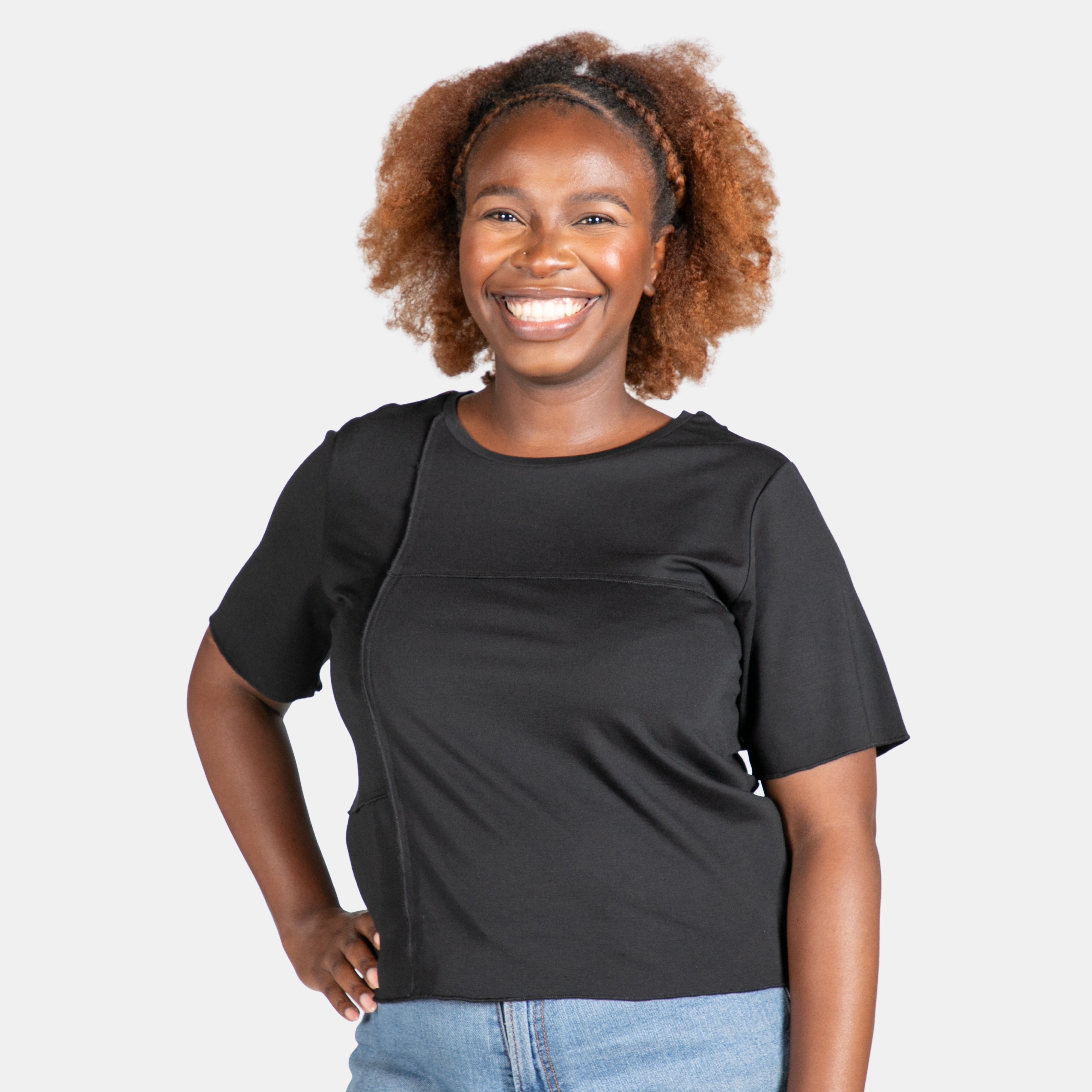 With it's soft knit fabric, rounded bound neckline and boxy design you also have clever horizontal and vertical seam lines to add interest.