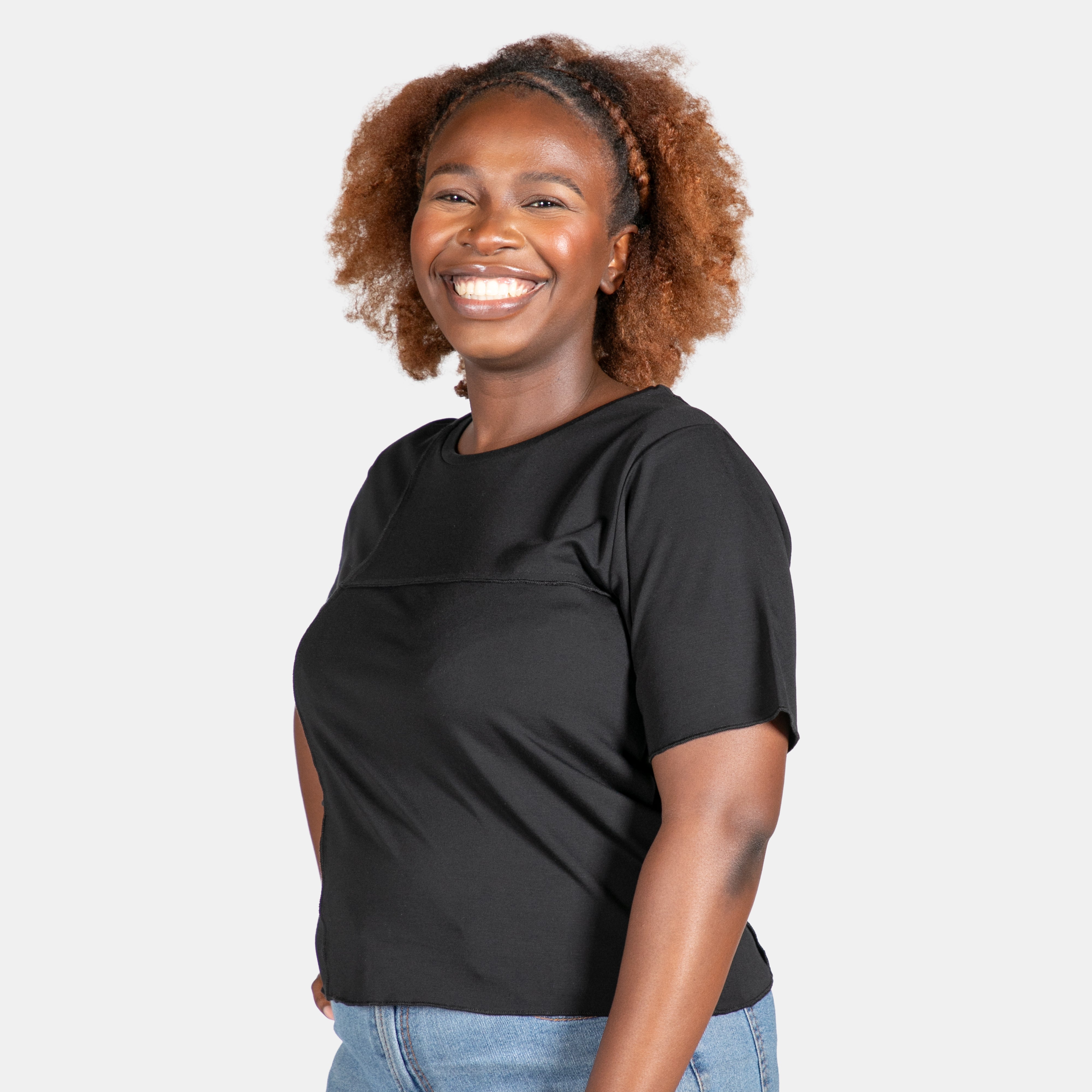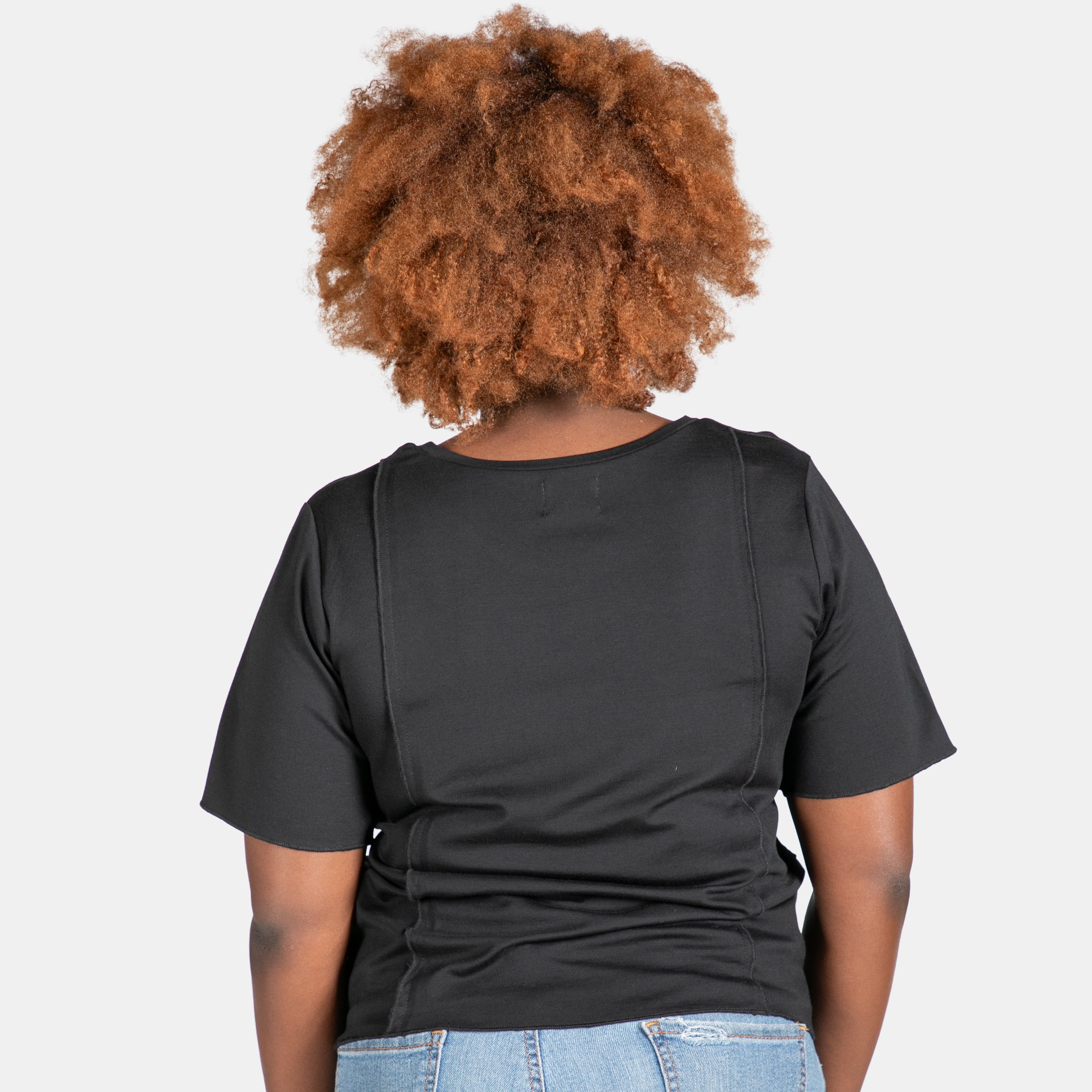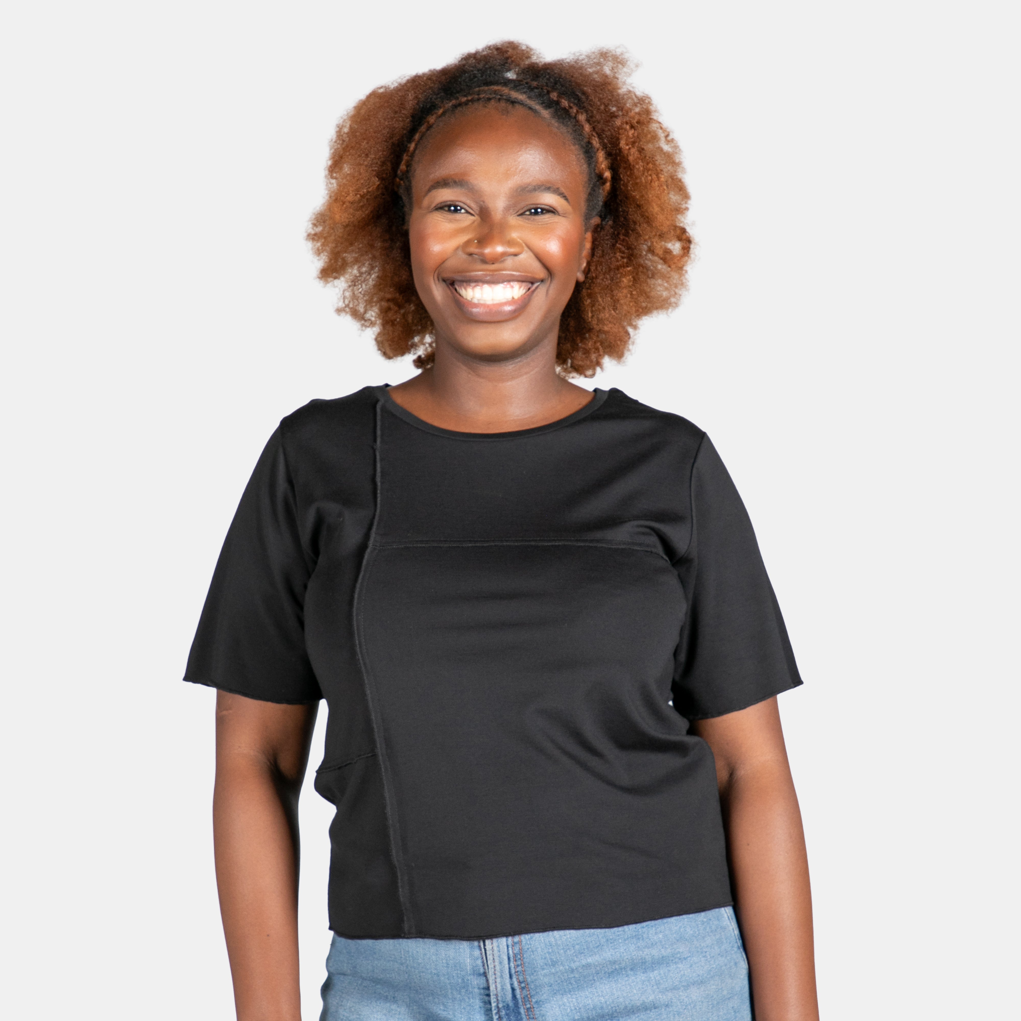 With it's soft knit fabric, rounded bound neckline and boxy design you also have clever horizontal and vertical seam lines to add interest.