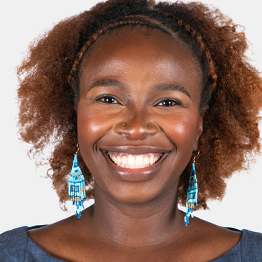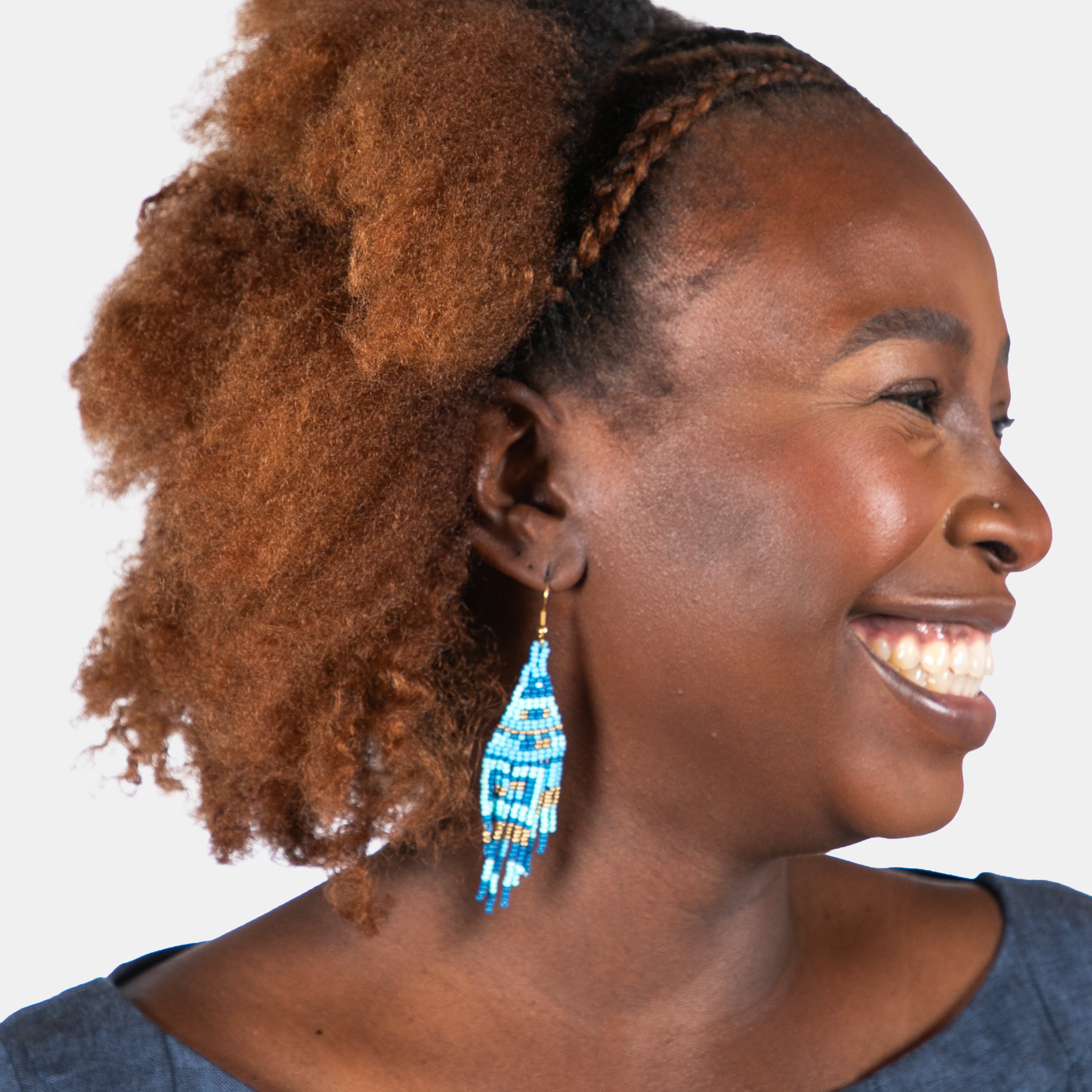 The Harriet earrings are a thoughtfully curated design of delicately hand beaded seed beads. A triangle shape at the ear extending to long tassels.